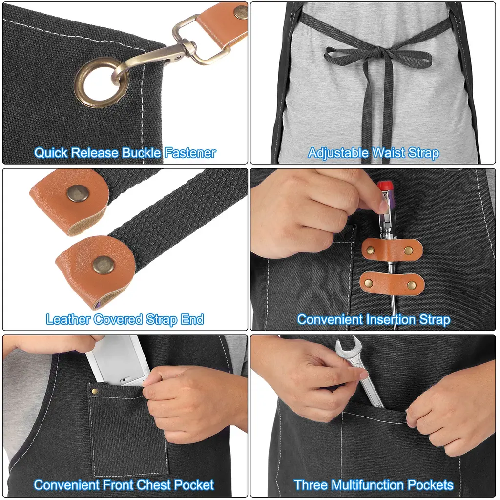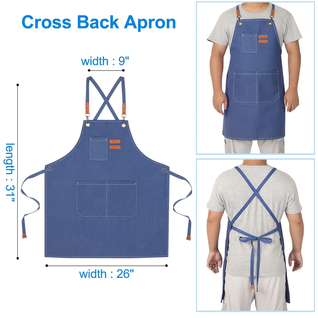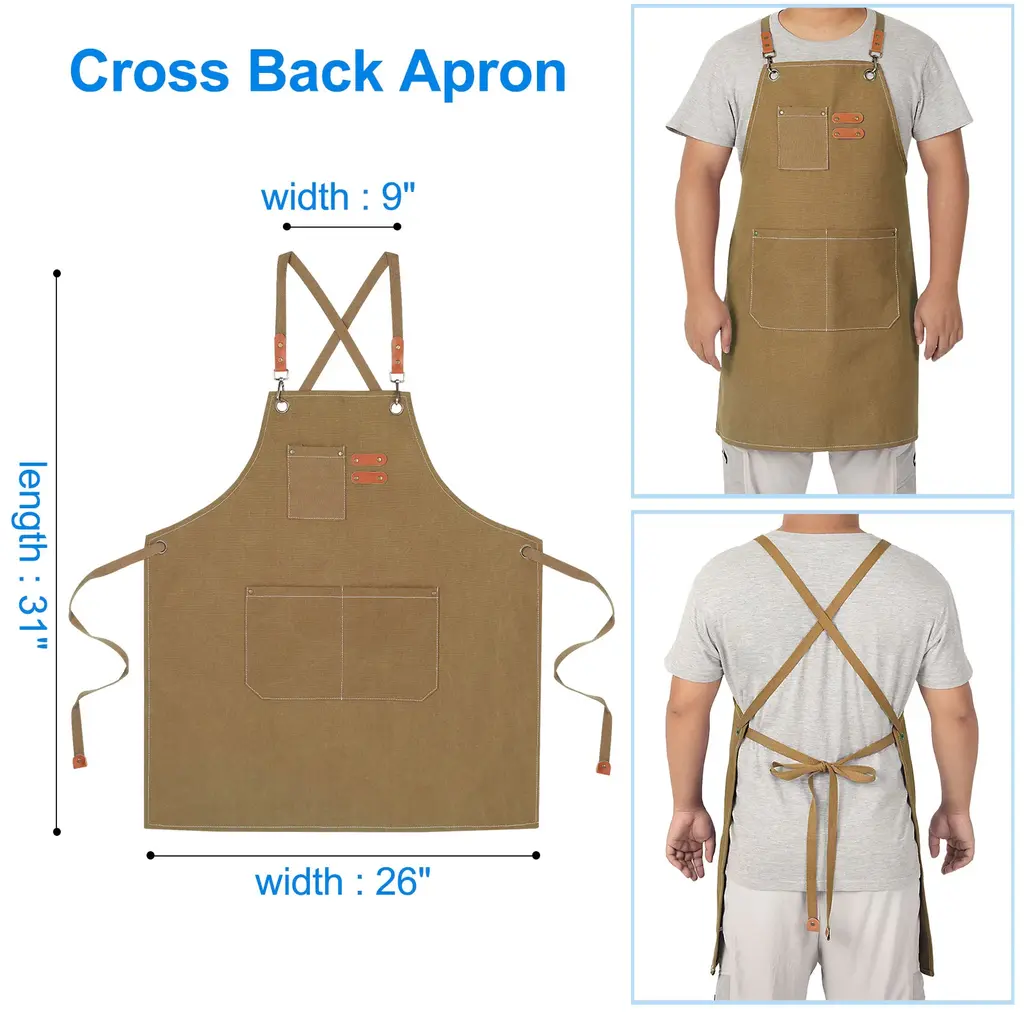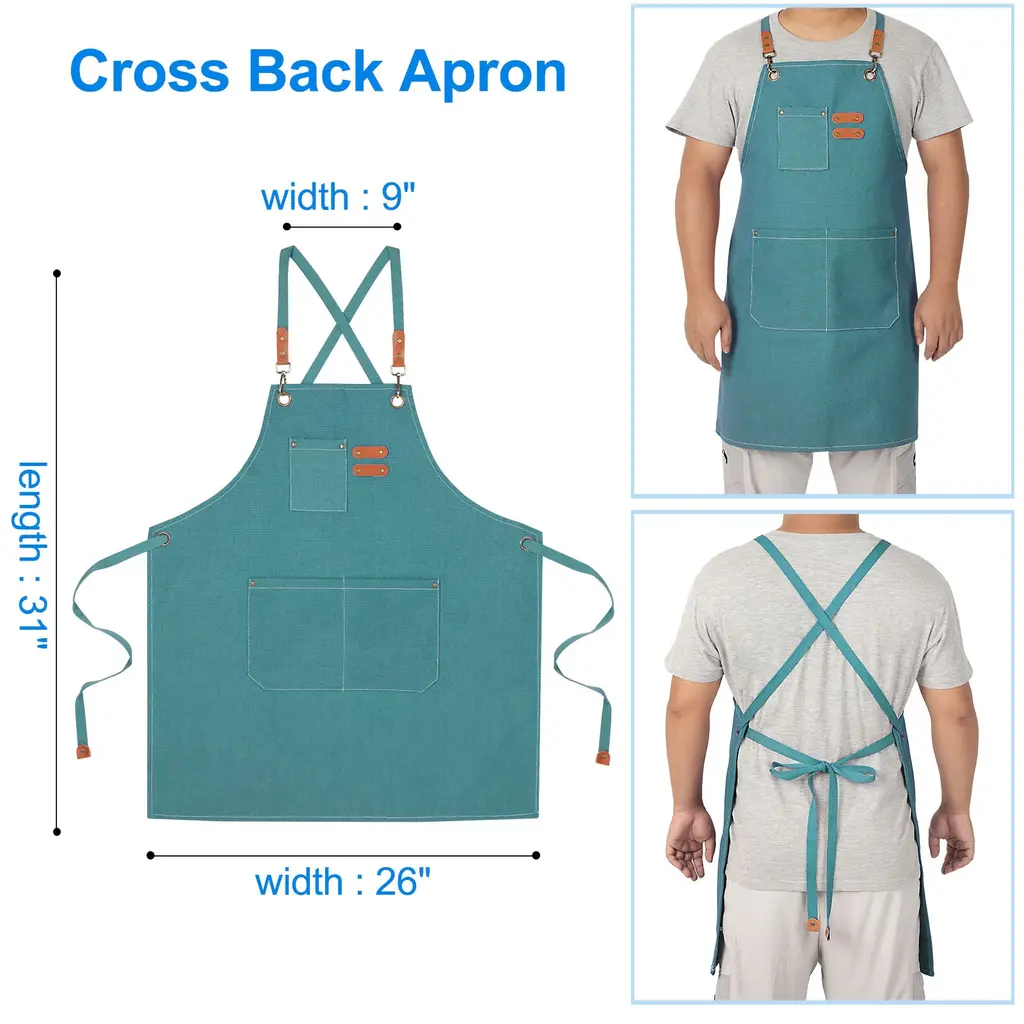 The server aprons are made of thick canvas, durable, waterproof. Easy to finish, not easy to fade color, can be machine washed in cold water many times.Sew 3 pockets in the middle of the chef apron for easy storage of a variety of items, from painting brushes and pencils in the studio or art pottery to thermometers, cooking utensils and timers in the kitchen.30" x 26.8" (length x width) provides enough coverage. The design of the aprons with pockets is easy to wear and protects your sides with wraparound coverage, protecting your clothes from getting wet or damaged.Cooking apron can be used in kitchens, gardens, art classes, coffee shops, florists and any type of studio. Suitable for art, artists, pottery, ceramics, crafts, painting, cooking, baking, cleaning, and gardening.Cross back design makes the apron suitable for men or women, can accommodate a wide range of sizing up to men's XXL sizes, easy to adjust the apron with the quick release straps.Note: Do not place the chef apron near any hot cooking utensils or flame.
