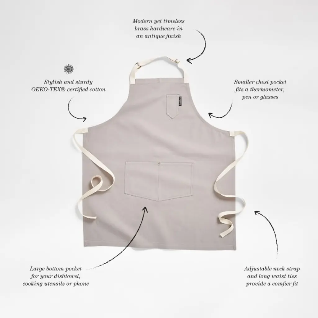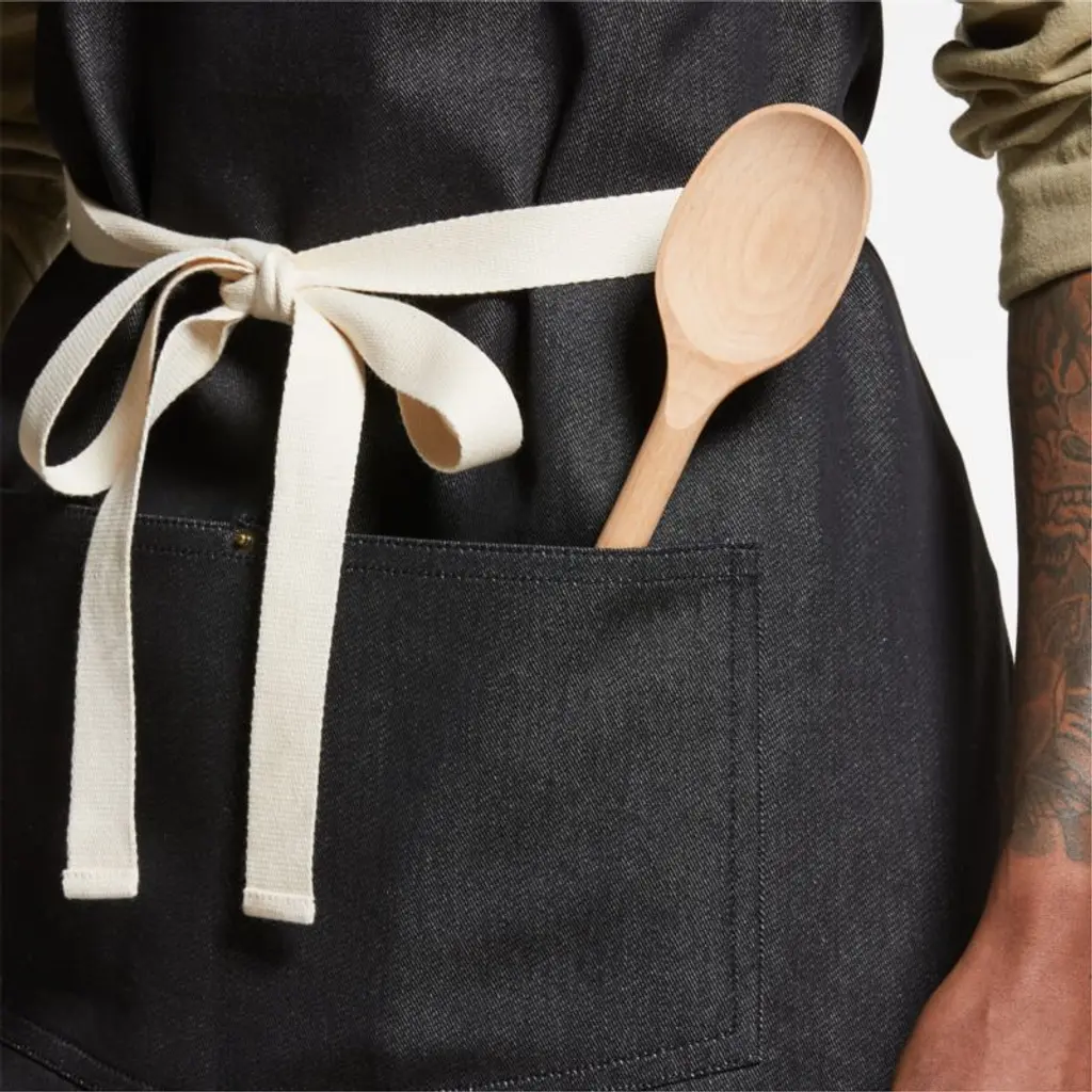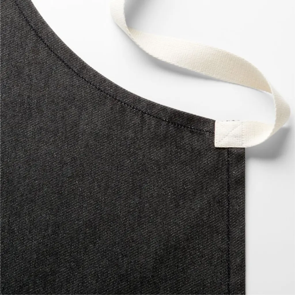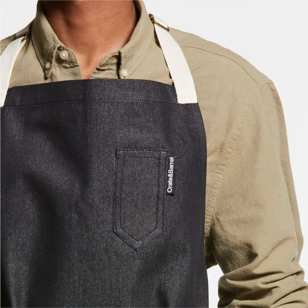 Sturdy yet stylish, modern yet timeless, denim makes a durable apron that works hard and wears well. Our black apron boasts two waist pockets that hold your phone or tablet and a dish towel as well as a chest pocket perfect for a pen, thermometer or clip-on timer. The adjustable neck strap and waist tie provide a comfortable fit. Finished with a denim Crate & Barrel logo tag, our denim canvas apron coordinates with our other exclusive kitchen textiles in classic black.