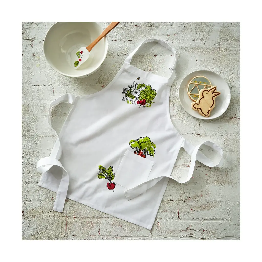 enjoy spending time in the kitchen without worrying about messing up your clothing with our bunny kid's apron. made from 100% cotton, this apron features a tie-neck and two pockets for storing kitchen essentials when you want to be handsfree. this apron's design is hand screen printed using water-based inks. this labor-intensive design process produces and end result fabric that is beautiful and soft to the touch.enjoy spending time in the kitchen without worrying about messing up your clothing with our bunny kid's apronmade from 100% cotton, this apron features a tie-neck and two pockets for storing kitchen essentials when you want to be handsfreethis apron's design is hand screen printed using water-based inks