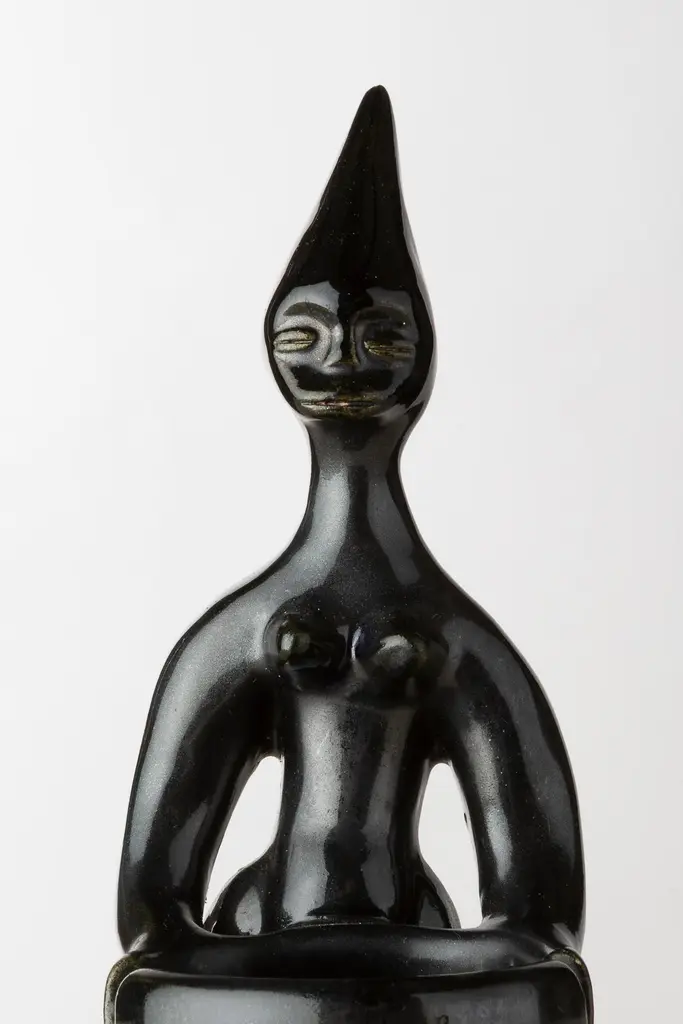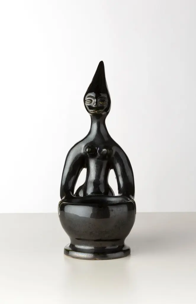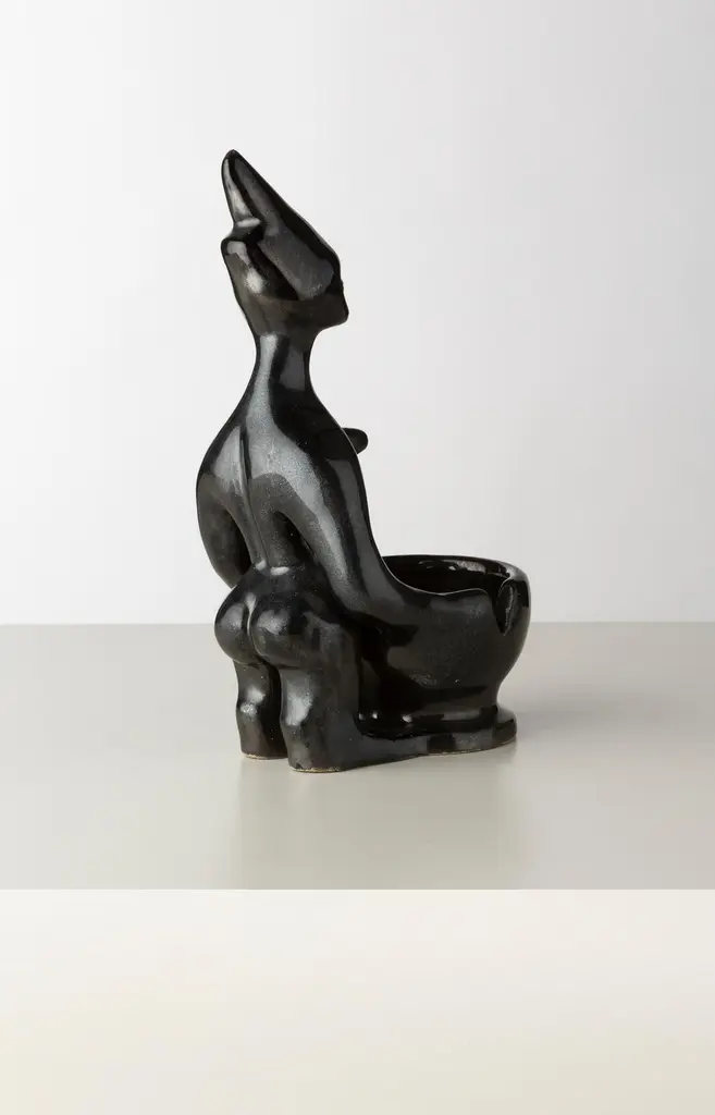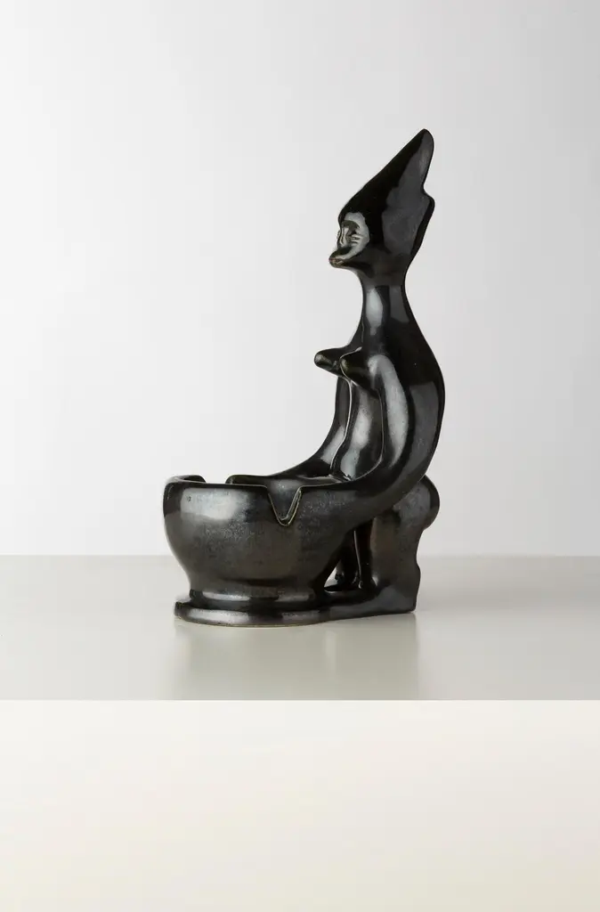This striking black ceramic ashtray by French artist Roger Capron features a stylized Africanist figure with elongated forms and geometric lines. Combining functionality with sculptural elegance, the piece reflects Capron’s distinctive mid-century modern aesthetic and his exploration of figurative ceramics.