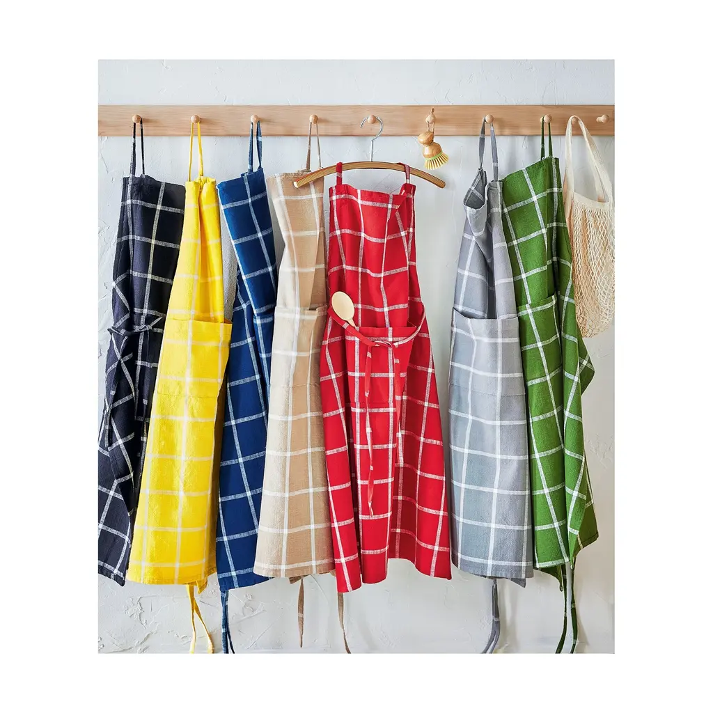 protect your clothes from kitchen messes. adding both function and style to typical kitchen tasks, this apron is made with 100% cotton and has a large pocket perfect for storing kitchen essentials while you work. features include a yarn dye woven slub chambray weave in a checked pattern and adjustable slide-through ties. enzyme washed for extra absorbency, softness and to reduce shrinkage.Check-pattern apron made with 100% cotton in a chambray weave. Large front pocket, adjustable ties, and fabric hang loop. Pre-washed.QUALITY MATERIAL: Crafted from 100% cottonPRODUCT SIZE: Apron measures .13 inch h x 37 inch l x 39 inch w.