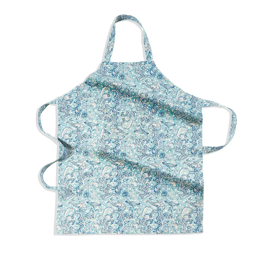 Escape to the alluring coastal destinations such as Saint-Tropez and the gorgeous Côte d'Azur. Experience cool ocean breezes and watch as the sun sparkles across the water. With its soothing seascape color palette and fanciful creatures, our La Mer Collection will offer a serene table setting for any summer celebration. Bring the south of France and carefree days by the sea to your home. Fine French table linens, hand-printed. Couleur Nature's French linen cooking aprons are quality-constructed, chic and practical.Brighten your home with the soothing seascape color palette and fanciful creatures of the La Mer apron. This piece evokes the feel of cool ocean breezes and sunlight sparkling upon the water. Reflecting the beauty of coastal destinations like the Côte d'Azur, this French apron has been carefully handprinted by skilled artisans using a time-honored technique, resulting in a singular piece of craftsmanship.Features a richly colored pattern reflecting the natural splendor of Southern France. Each handmade French country apron naturally features slight variations, making it a unique piece of art. Meticulously handcrafted in the heart of Jaipur, India, by skilled artisans, working in ethical, secure environments, and produced with the visionary designs by the Parisian artist, Bruno Lamy.Easily cared for and suitable for everyday use. Machine Washable.Made of 100% cottonWeight: 1