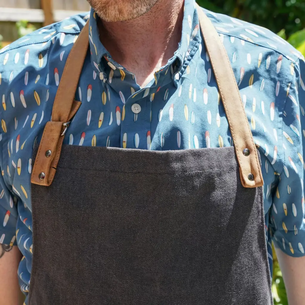 This canvas apron for men is crafted from durable canvas with faux leather accents, creating a stylish grill apron for men that stands up to spills and frequent use. Whether you're prepping indoors or grilling outside, it’s a dependable chef apron, butcher apron, or men’s apron cooking essential. It also fits the bill for canvas aprons for men who need both form and function. With two large front pockets, this black apron with pockets keeps tools, spices, or even drinks within easy reach. It’s a practical kitchen apron for home chefs and a versatile server apron for those on the move. Designed for comfort, the adjustable neck strap allows for a custom fit during long sessions of cooking, whether you’re hosting a patio party, prepping for camping meals or tailgates, or handling outdoor kitchen cooking. Great for everything from everyday grilling at home to big events like BBQs, cookouts, and poolside parties. Grilling aprons for men like this one blend function with flexibility. This tough yet comfortable apron also makes a great choice for gifts for men who love to cook or entertain.