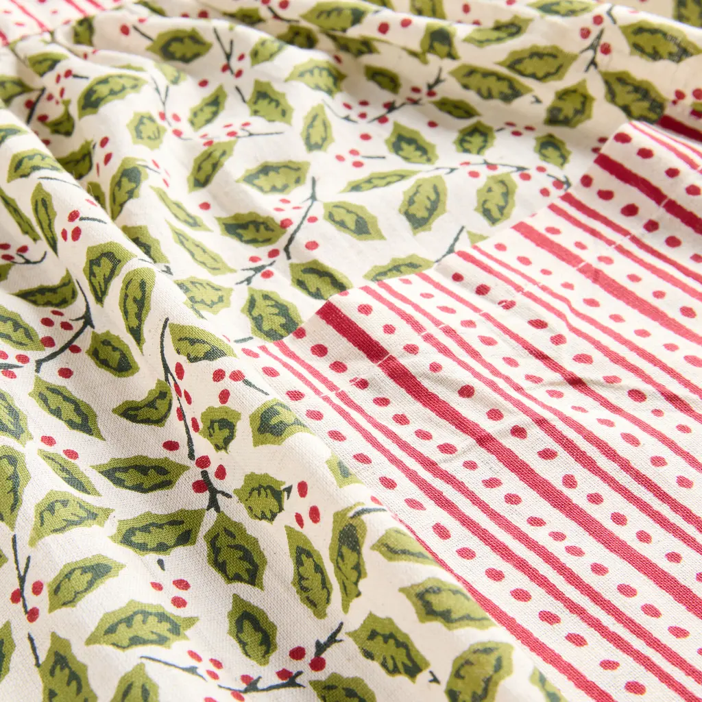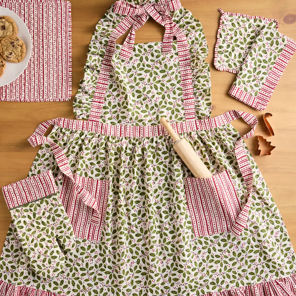 Have a holly, jolly Christmas with our exclusive apron, screen printed in a festive green and red palette with pockets and ruffles. Handmade in India of a cotton and linen blend, the design is inspired by block-print patterns with abstract stripes, dots, and holly that create a cheerful and classic accessory for cooking. It's the most wonderful time of the year here at World Market - your destination for all things holiday decor, gifts, and more.