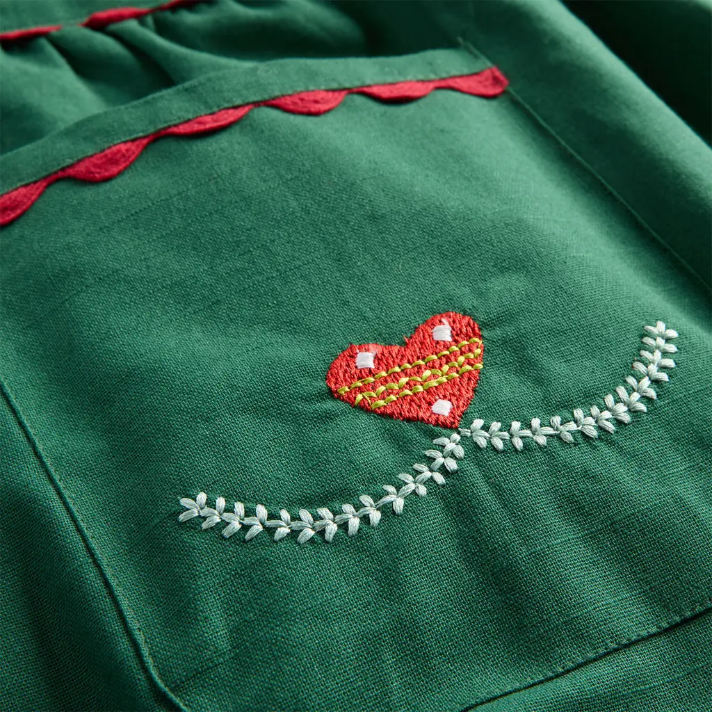 A gathering of woodland critters brings storybook charm to our exclusive, hand-embellished apron from India. The festive green ground with red rickrack trim is brought to life by colorful embroidered hearts, foxes, owls, and more. A sweet gift for any home chef, it includes two handy pockets and adjustable tie straps. With a palette that suits the holiday season and beyond, this Scandinavian-inspired accessory is a merry nod to Mother Nature.
