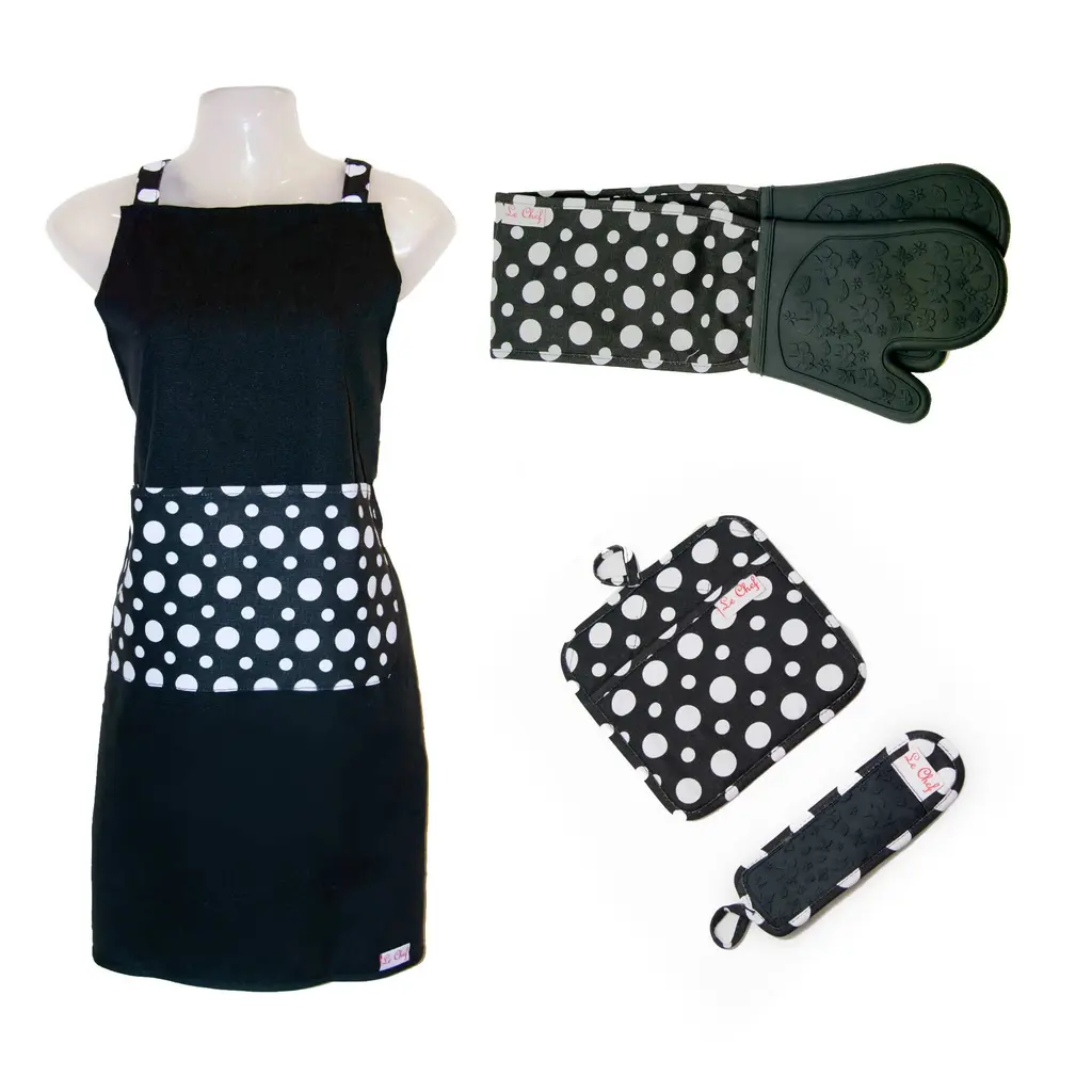 The 3-Piece Kids Apron/Mitt/Hat Set from Mu Kitchen offers a fun way to encourage your child interest in cooking and baking. Made from 100% cotton for soft and comfy wear, the kids apron dress set includes an apron dress, chef hat and oven mitt. The pink color scheme, ice cream cone and popsicle print and ruffle accents create a look they'll love to wear, while the matching oven mitt and chef hat will have them perfectly ready for some fun culinary adventures.