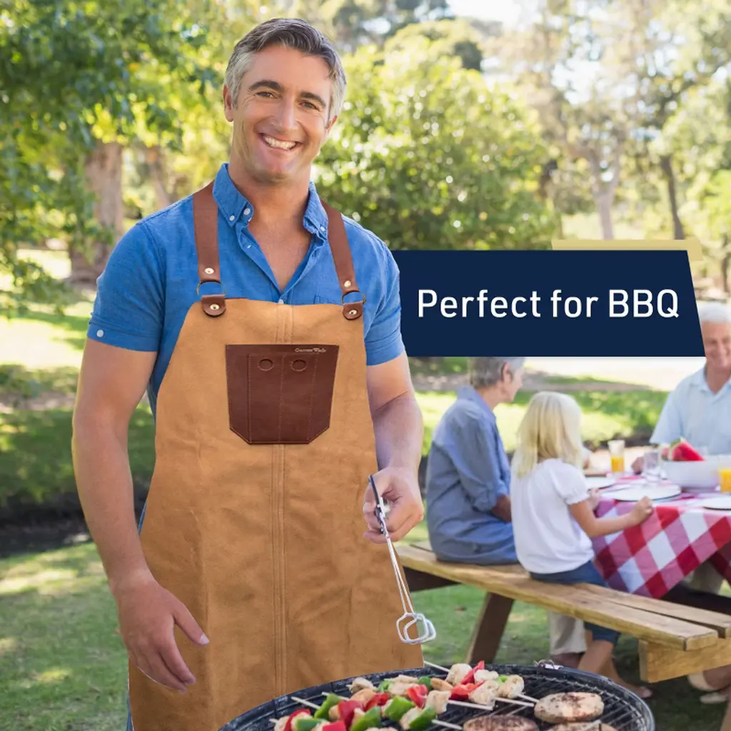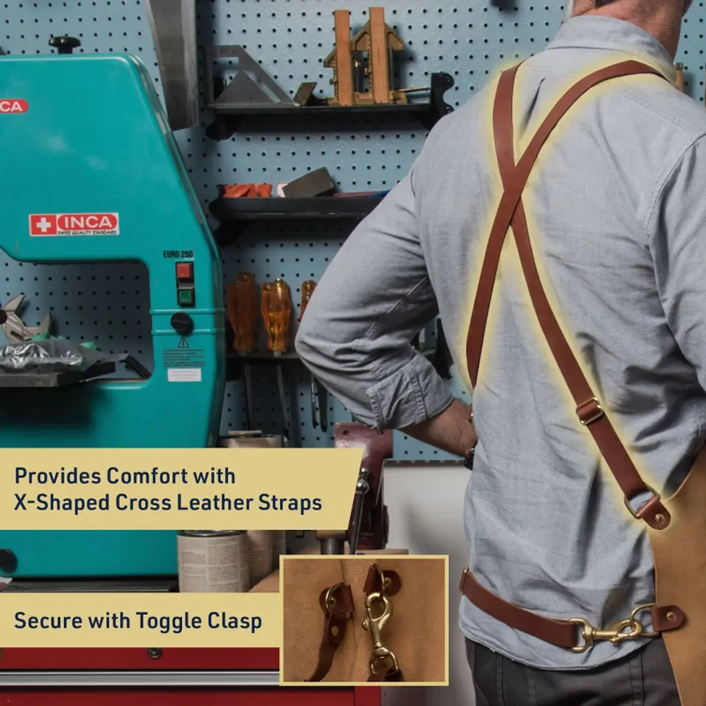 Protect your clothes and yourself with the Carpenters Apron for Men by Kings County Tools. This handsome leather apron is made in the USA from 1/16-inch-thick split-leather cowhide with hand-riveted brass fasteners. Our utility apron is designed for comfortable wear that won’t interfere with your work. The cross straps adjust to fit most frames and disperse weight evenly, taking pressure off your neck. Instead of the waist pockets typical of most wood working aprons for men, which can restrict movement, we opted for a breast pocket with sections for a phone, pencil, notes, or scissors, etc. This wood working apron is a smart pick for anyone who enjoys spending time in their workshop or behind the grill, and it makes a great leather anniversary gift for men.