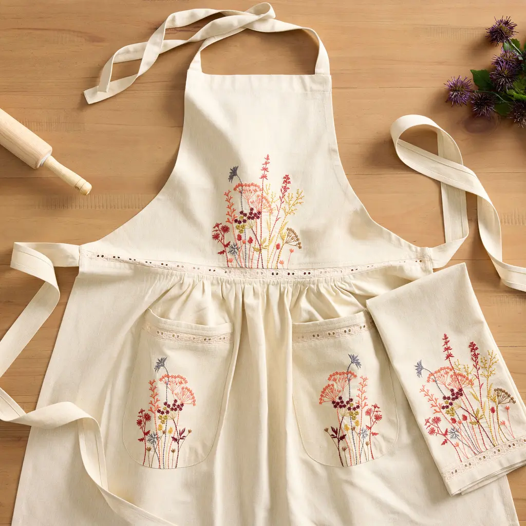A sweet gift for any home chef, our exclusive apron is full of delicate detail. Made in India of oatmeal cotton, it charms with dimensional pleating, eyelet trim and sprigs of embroidered florals in coral, maroon and wheat. Complete with deep pockets and adjustable ties at the neck and waist for a comfortable fit, this apron protects your clothes from spills and splashes with garden-inspired cheer.