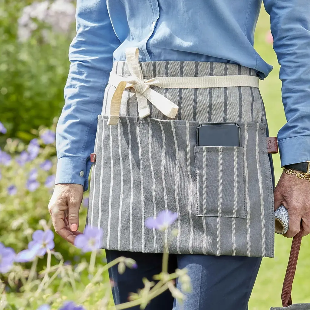 The Sophie Conran waist apron is a practical and attractive garden wear, which would be a wonderful addition for discerning gardeners who appreciate style. This lovely gardening accessory perfectly captures Sophie’s signature style, which blends classic design with subtle contemporary elements. The waist apron is not only fashionable but also practical. It will keep your clothes clean while gardening and features two deep pockets that are ideal for carrying all your gardening essentials. The smaller patch pocket is perfect for storing your phone or keys. For a complete set of matching accessories, you may also want to check out Sophie Conran’s gardener’s apron. This waist apron is available in both a classic stripe and a grey ticking stripe design.