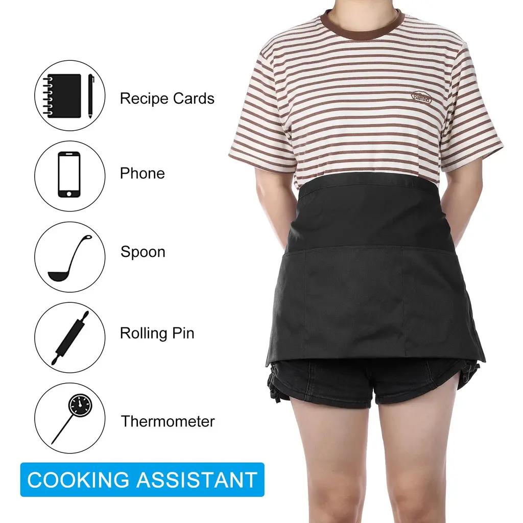 The aprons can be used for various purposes such as waitress , hotel, restaurant, home, kitchen, cleaning, etc., providing you with neat clothes when working.Harvesting pouch apron is also suitable for those who enjoy gardening, crafts, planting and woodworking, it is a suitable and practical gift choice. People in occupation such as gardeners, plant harvesters and gardeners will also be happy with it.Whether in the kitchen or garden, this pinafore apron will be a convenient and stylish accessory.Specification:Material: Polyester 80% + Cotton 20%Size: 30 x 60cm/11.8 x 23.6 inch (L x W)Strap Size: 83cm/32.7 inch (L x W)Packing List: 3 Pack x ApronAdvantage:These kitchen aprons are design with large capacity pocket, the apron is equipped with a spacious quick release pocket for you to store tools, book, waiter book, etc.The apron is made of polyester 80% with cotton 20% material for comfort and safety,so you can stay clean and dry while you work, widely used for women and men.With adjustable strap design, the garden apron distributes weight and the shape adjusts to fit your size, making it more stable and comfortable to wear.Instruction:Slip the apron over your body and secure it with the straps at the back.Note:Avoid exposing the apron to excessive heat or fire to prevent damage.
