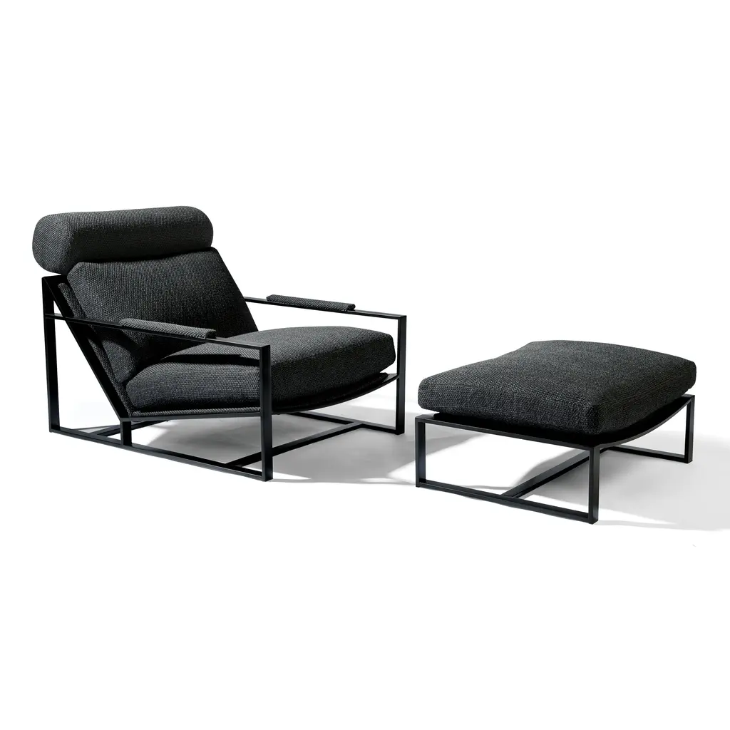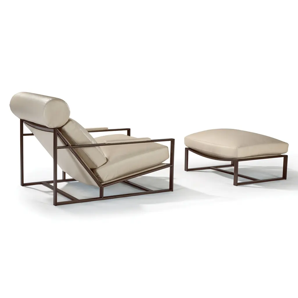 Indulge in the iconic mid-century modern design of the Cruisin' Lounge Chair and Ottoman by Milo Baughman for Thayer Coggin. This award-winning piece showcases a glamorous, exposed flat-bar metal frame, sleek padded arm rests, and luxurious upholstered seating with premium back support. The ideal angle for relaxation is perfected with a built-in headrest, allowing for endless comfort in any interior. Highlights