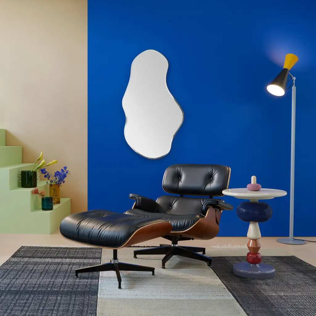 An icon of modern furniture design and an object in MoMA’s collection, the Eames® Lounge Chair and Ottoman was conceived by Charles and Ray Eames in 1956. Marrying beauty and comfort, the Eames® Lounge Chair and Ottoman is a work of art designed for everyday living. At MoMA Design Store, we offer the Eames® Lounge Chair and Ottoman in Walnut, Oak or Ebony shells. You can choose from leather or fabric upholstery. The leather styles are upholstered in 100% Italian full-grain leather. This classic-look leather is distinguished by its medium pebbling and supple hand. It’s colored with transparent dye and light pigment, and benefits from the added protection of a silicone topcoat. The leather will develop a softened patina over time. When first conceived, the designers’ modest desire was, according to Charles, to create a chair with “the warm, receptive look of a well-used first baseman’s mitt”—translating the soft, comfortable look and feel of a genuine leather baseball glove that has been properly broken in. We offer the chair in two beautiful fabrics. The checkered fabric, designed by Alexander Girard in 1965, is 77% cotton and 23% polyester. Girard’s checkered fabric design was used for an armchair he conceived in 1967, which is an object in MoMA’s collection. The bouclé, a fabric characterized by its nubby texture, is 33% acrylic, 30% wool, 29% cotton, 7% polyester and 1% viscose. A new version of the chair features bamboo leather—83% of the material is plant-based, made from fibers extruded from the pulp of FSC Certified bamboo, while 17% of the material consists of protective resins which are free of toxins and solvents, and free of micro-plastics as a by-product when decomposing. Production uses 1/3 less water consumption compared to use of plants like cotton in fiber production. It biodegrades completely in a landfill in less than 250 days (requires a zero-oxygen environment along with the microbes found in landfills). It is buttery soft and has the look and feel of premium quality leathers, while having a 35% reduction in carbon footprint compared to an Eames Lounge and Ottoman with traditional leather. The Eames® Lounge Chair and Ottoman has been produced in the USA for over 50 years by the original manufacturer, Herman Miller®. This authorized version is composed of three separate curved 7-ply veneer shells: the head rest, the back support and the seat, all topped with upholstered leather or fabric cushions. The seat pivots on a five-pronged base, moving effortlessly with one’s body movements. The Eames® Lounge Chair measures 32.75h x 32.75w x 32.75"d while the Ottoman measures 17h x 26w x 21.5"d. The chair’s weight limit is 300lbs. Please note that the leather exhibits natural markings and inherent color and textural variations. The leather will lighten in color during prolonged exposure to heat or sunlight. Learn more about the Eames® Lounge Chair and Ottoman on our storytelling page here.