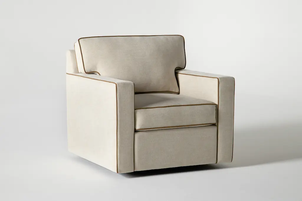 Add sophistication to your seating arrangement with Nate and Jeremiah’s Reeves swivel accent chair. Distinguished by tailored contrast piping, the design boasts clean lines and classic details. Not only does it embody a perfect balance of masculine and feminine, it brings refined comfort to any space. In addition to the benefits of cleanable, durable performance fabric, this piece allows you to enjoy a full-circle experience with its swivel base. The upholstery is customizable through our Special Order program, but the contrast piping is not.