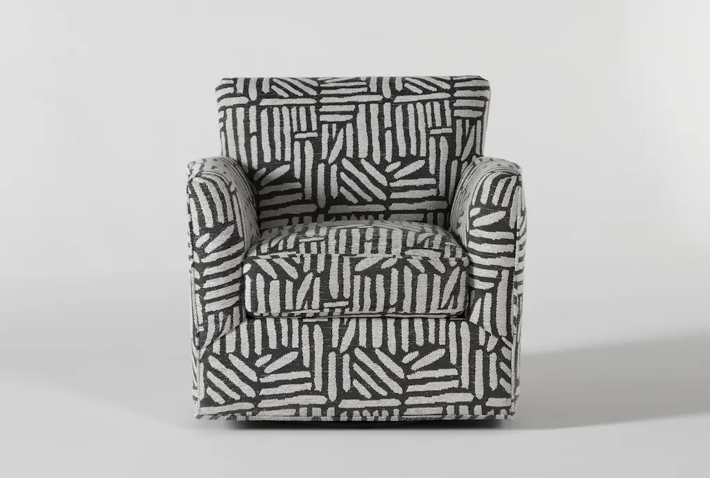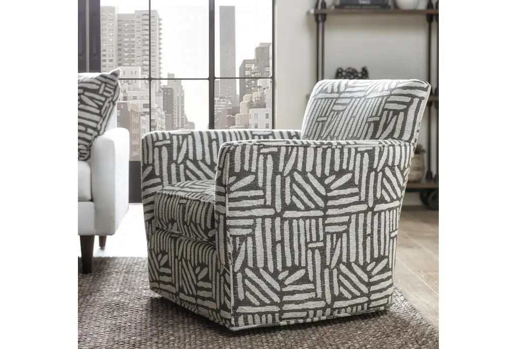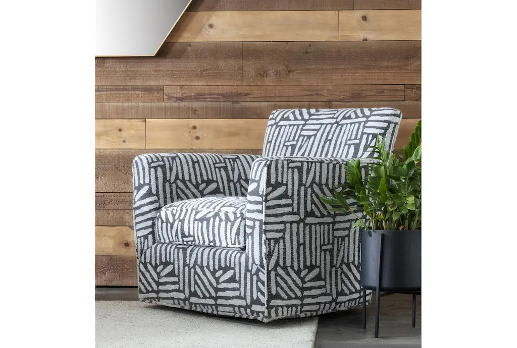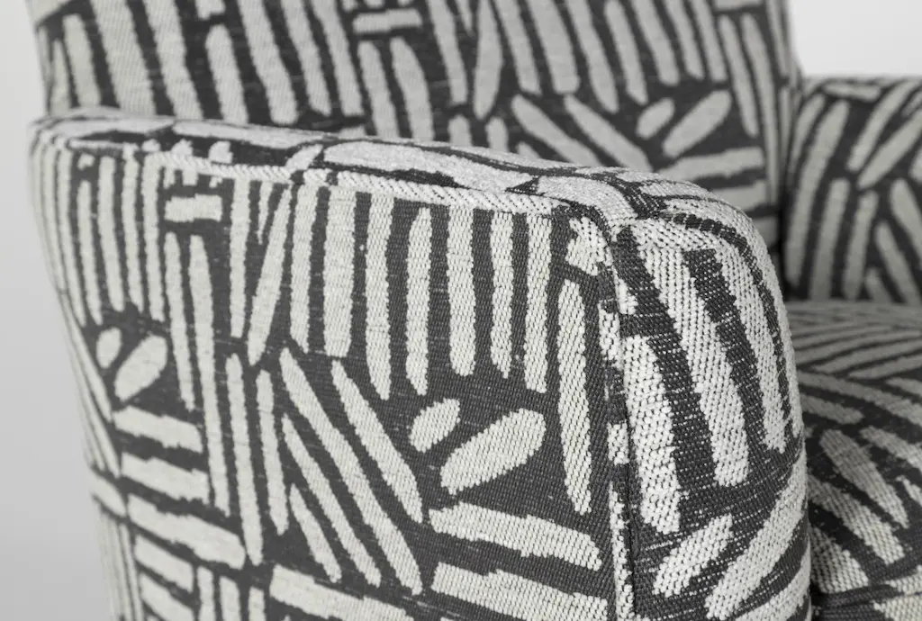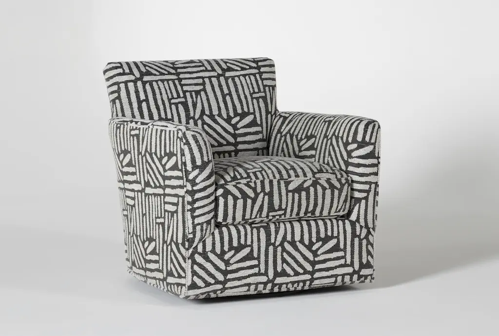 Introducing the Revolve II 34" Grey Fabric Swivel Accent Chair, a perfect blend of style and comfort for your living room or bedroom. This modern armchair features a striking patterned design that adds a touch of sophistication to any space. The swivel function and supportive arms make it an ideal choice for lounging and relaxation.
