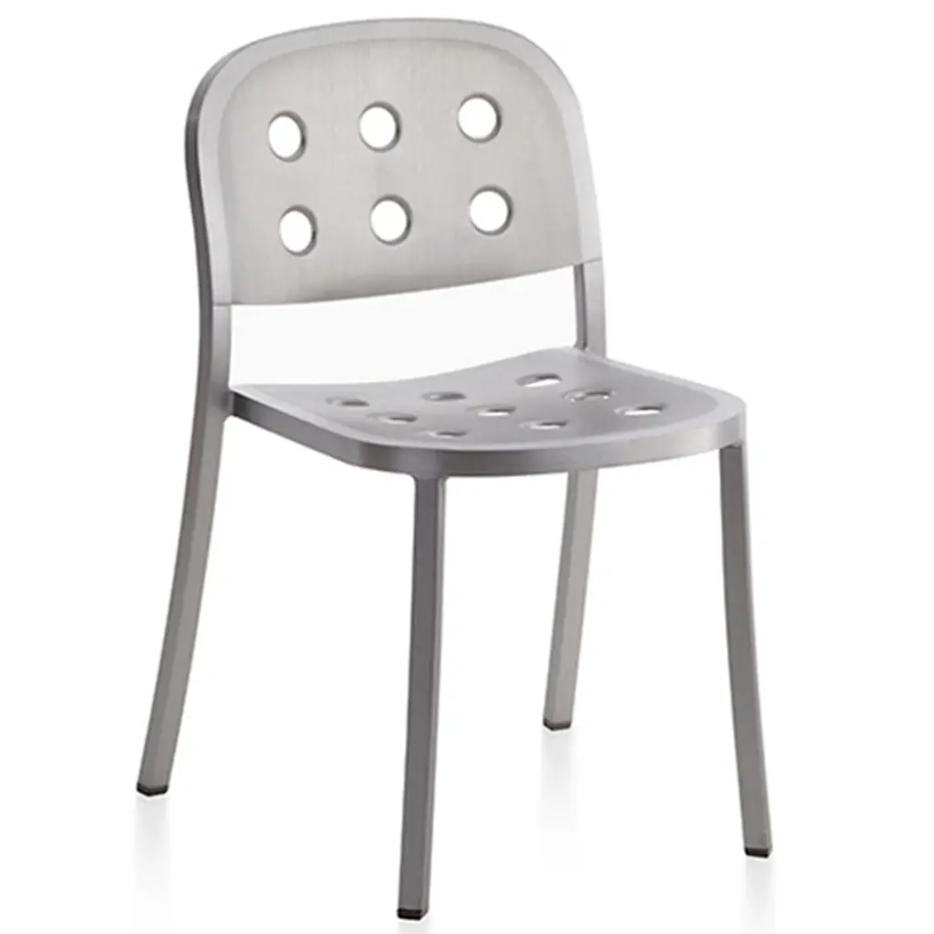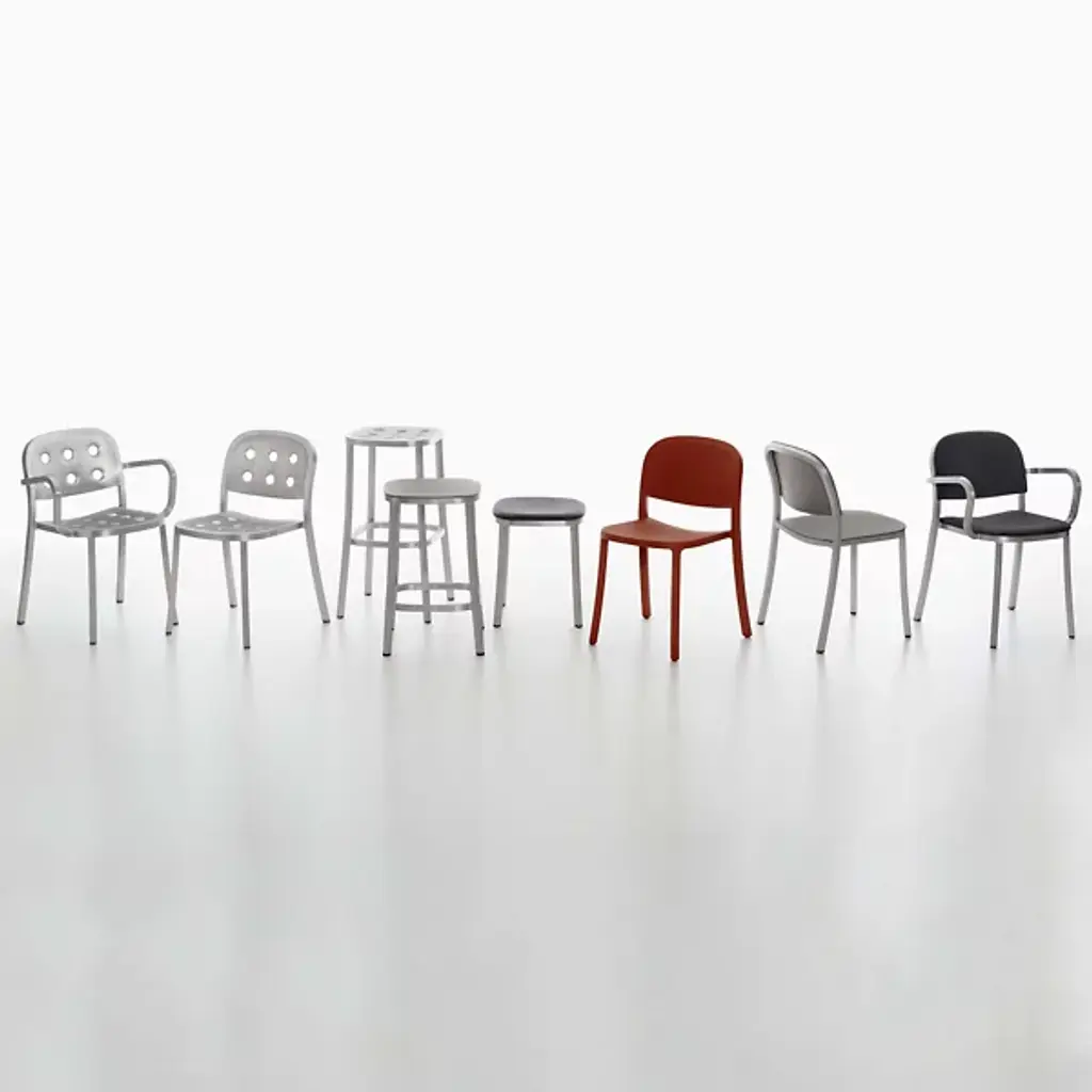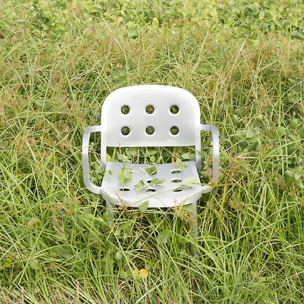 The 1 Inch Outdoor Armchair from Emeco is designed by Jasper Morrison. This outdoor armchair is meticulously crafted with finely contoured arms, providing. The framework features circular cutouts, adding a distinctive stylistic element. Crafted for durability resistance, it boasts weatherproof construction, making it an apt choice for outdoor settings. Whether adorning your patio, garden, or poolside, this armchair adds a contemporary touch to your outdoor space. Your armchair is stackable for up to a height of 6 chairs.