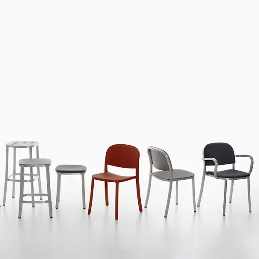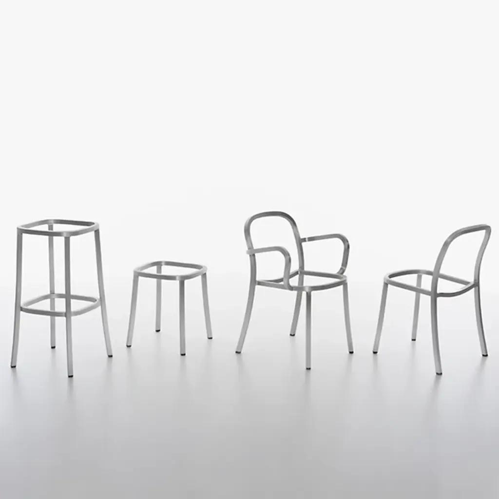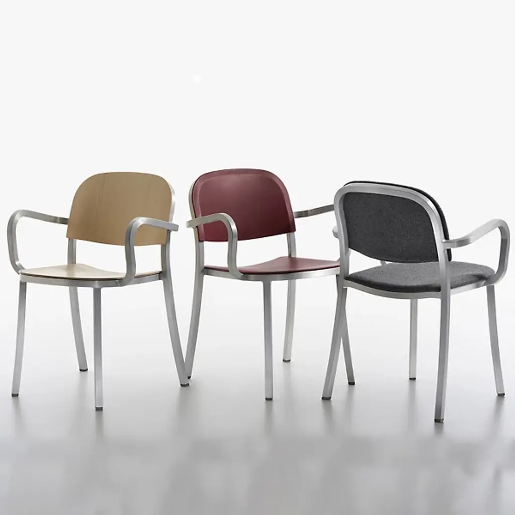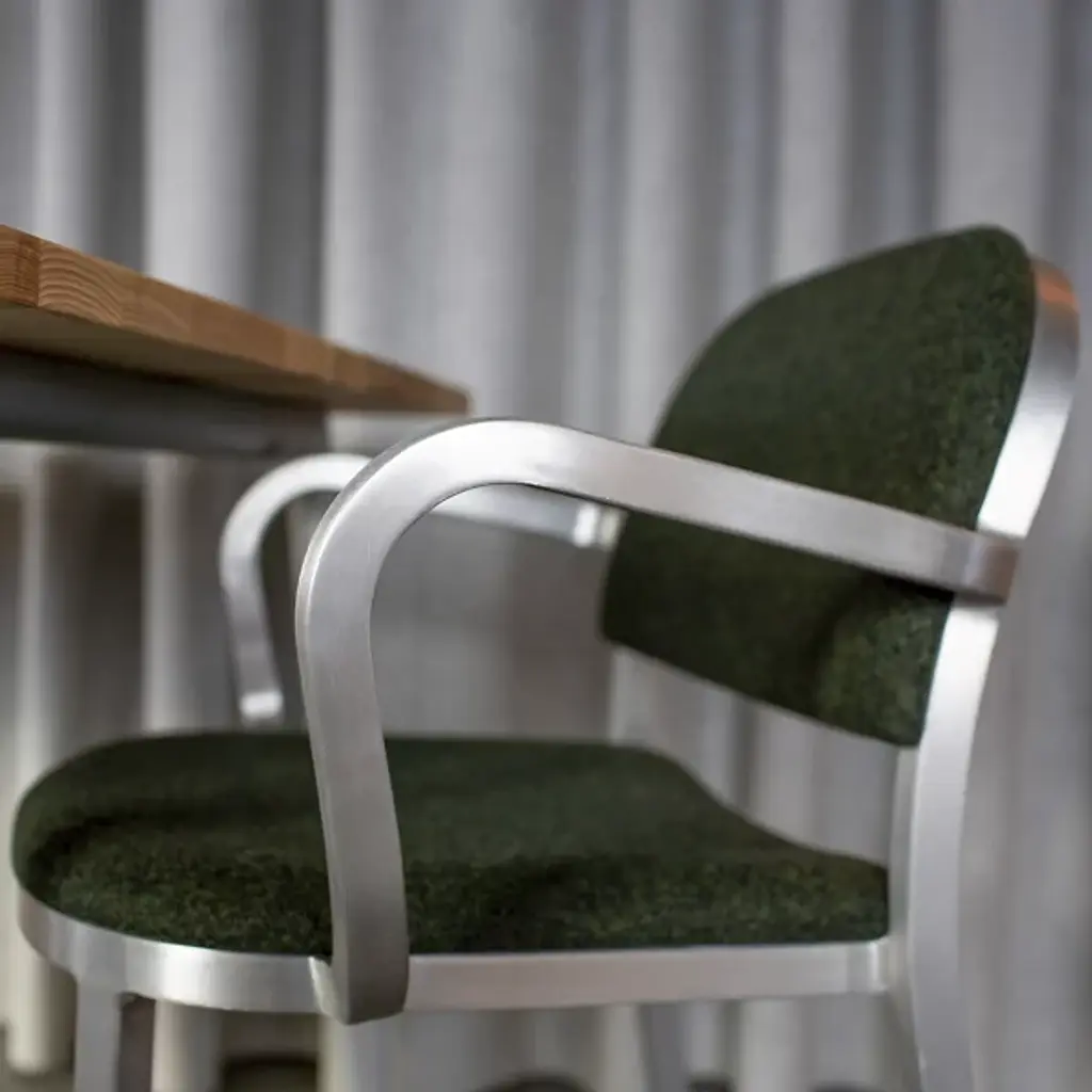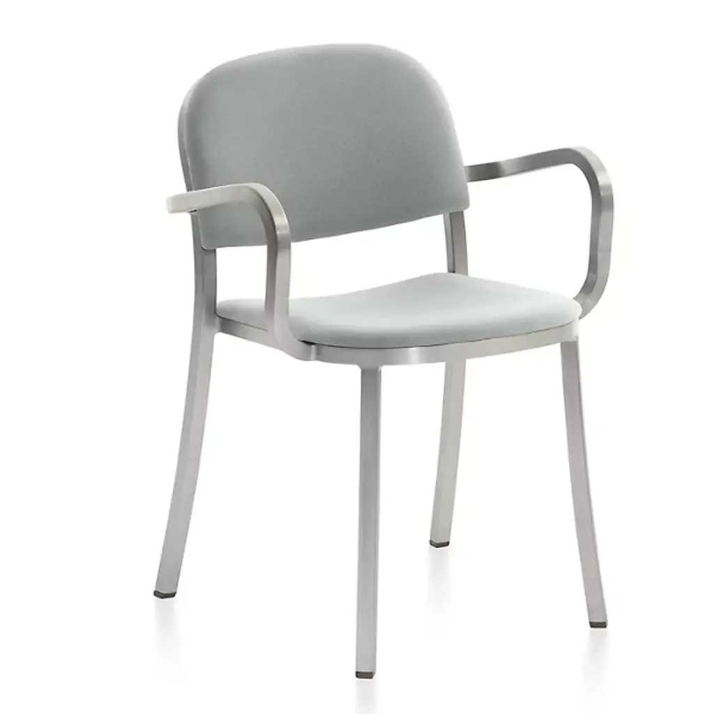 A true Jasper Morrison design, unpretentious and discrete. Harnessing Emeco’s 77-step hand-built process, Morrison brings you a solidly built piece that says comfort and sophistication at first glance with the Emeco 1 Inch Upholstered Armchair. The chair is made to be strong, simple, and timeless. Recycled aluminum represents strength while being lightweight. This material is made into square tubes, then hand-bent into a clean frame outlined by sweeping curves. These curves are thoughtfully drawn by Morrison to make the chair naturally feel comfortable, a hallmark of his “super normal” approach to design. Traditionally welded by Emeco, Morrison switches up the back and seat rest with an application of low-profile, gently indented upholstered material. This material hugs the contours of your body pleasantly while providing a dash of soft color.