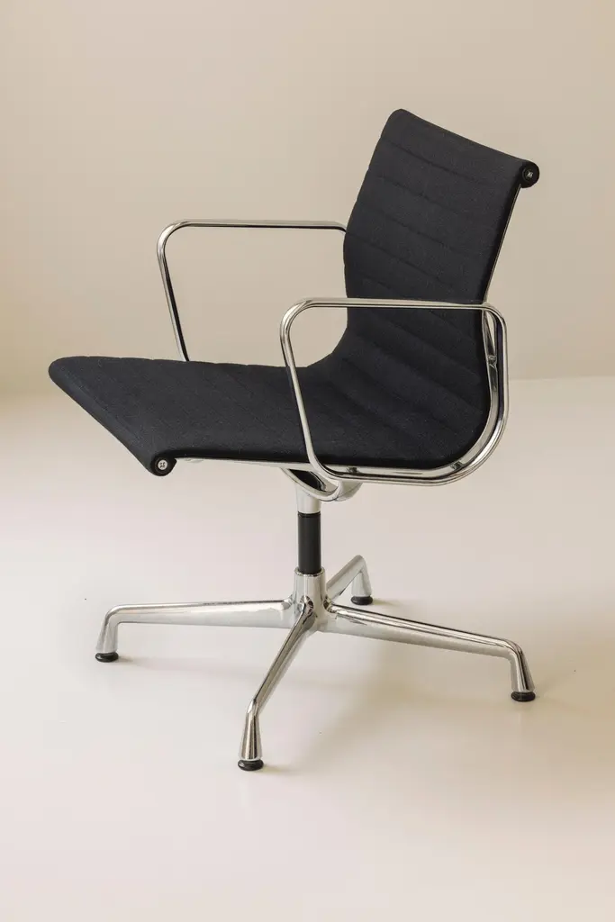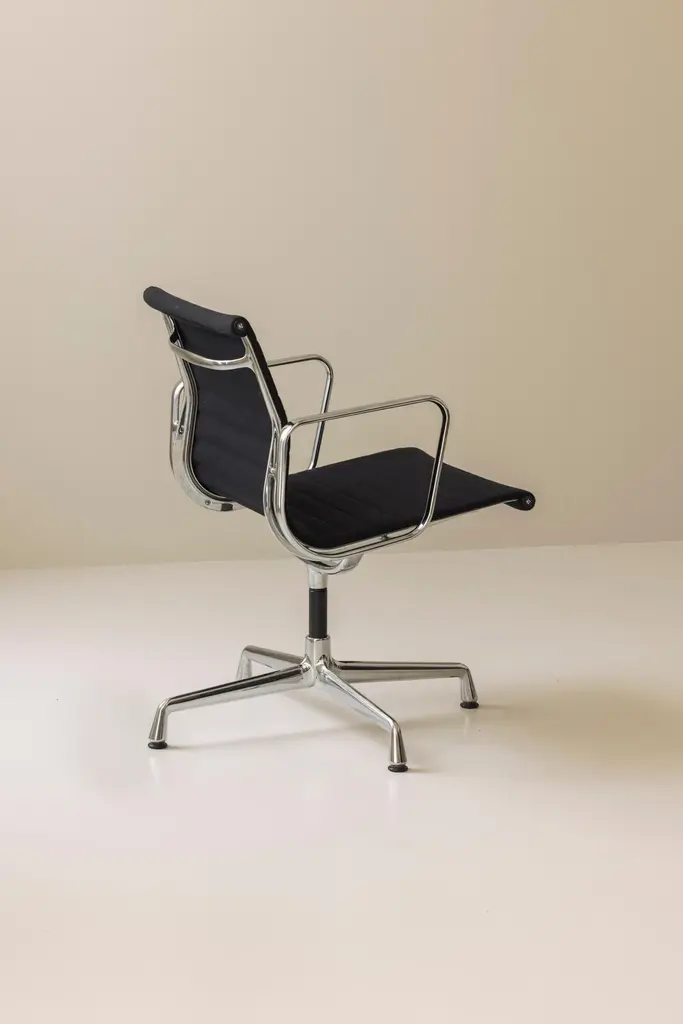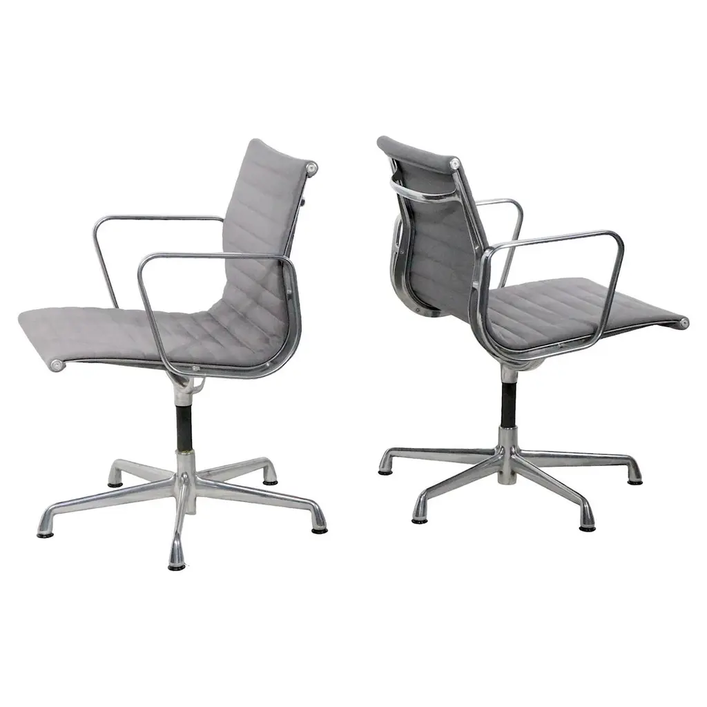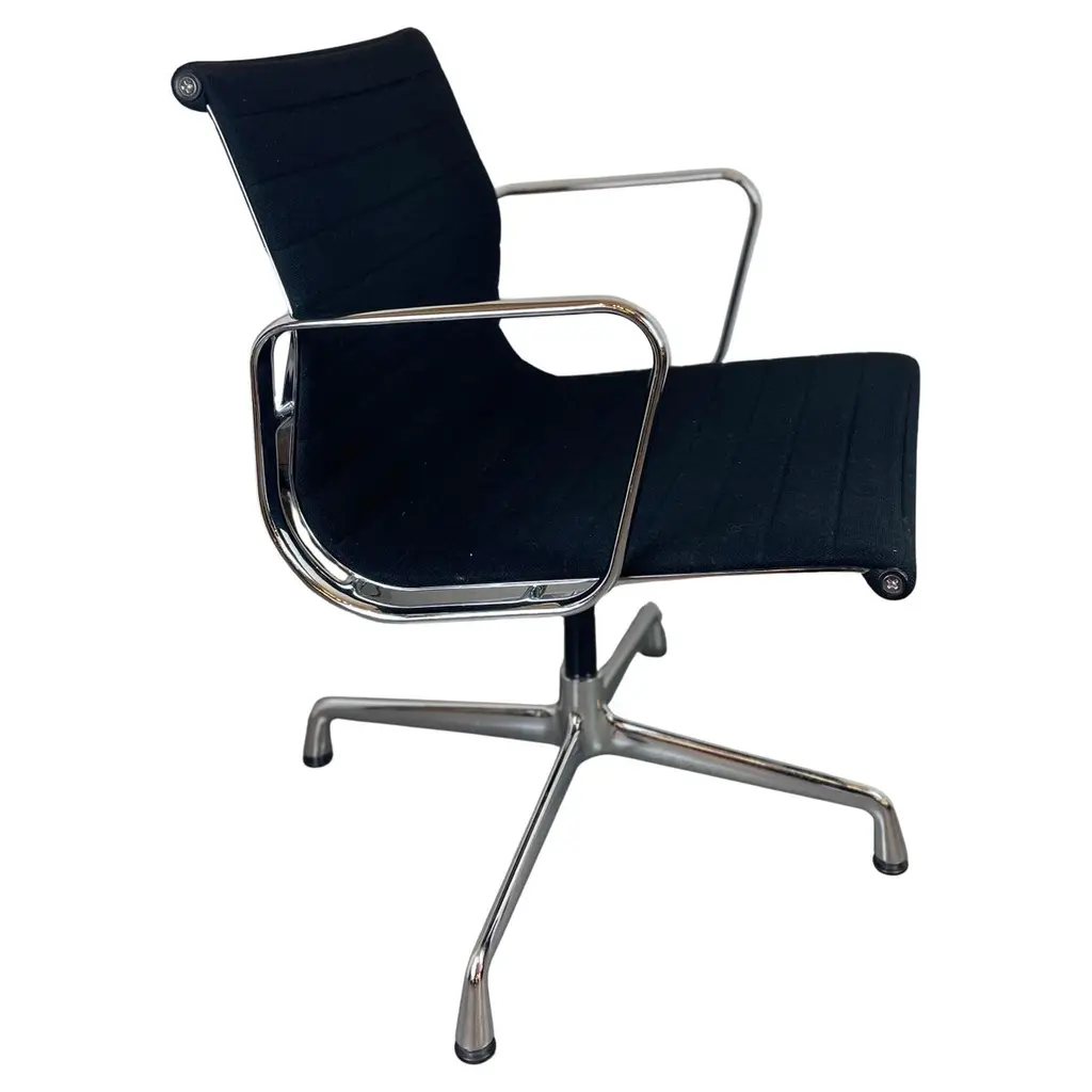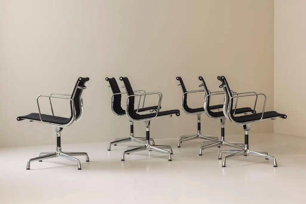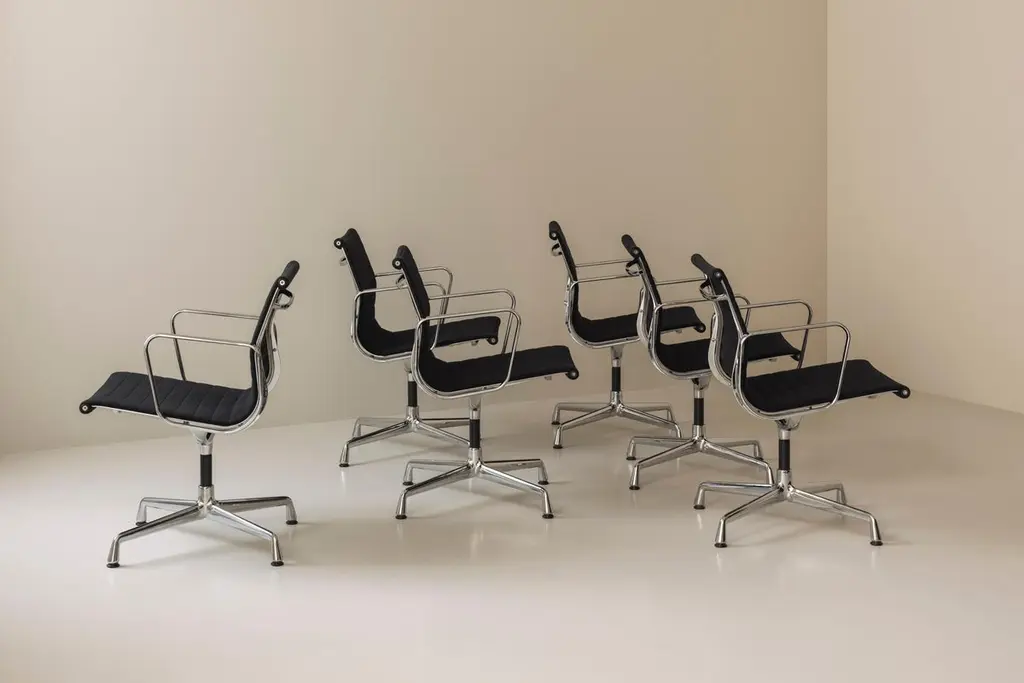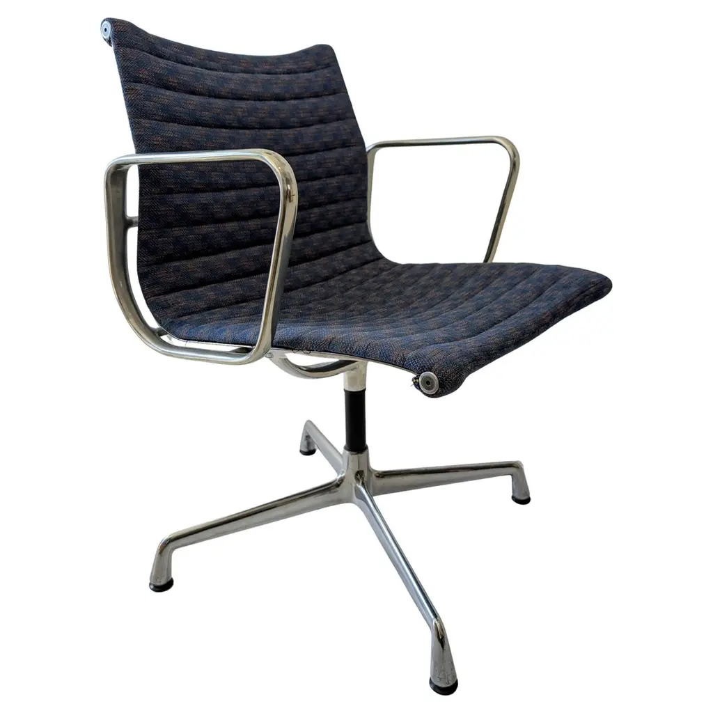 An iconic design by Charles & Ray Eames, this set of six EA108 swivel office armchairs embodies the timeless elegance and ergonomic innovation that have made the Aluminium Group series a modern classic. Produced by Vitra, these vintage examples feature the original Hopsak upholstery—known for its vibrant texture and durability—paired with sleek aluminium frames and four-star swivel bases. The EA108’s sculptural form offers exceptional comfort, making it equally suited to the office, conference room, or stylish home workspace. Designed in 1958, the Aluminium Group chairs have become one of the most recognisable symbols of 20th-century design, seamlessly blending form and function. This matching set is in a beautiful and original condition, marked underneath. Priced and sold per piece.