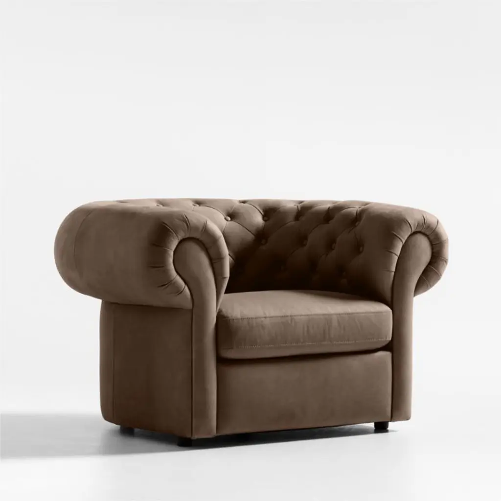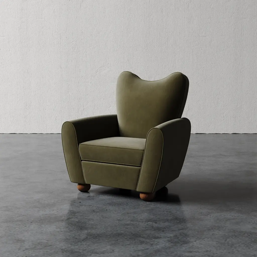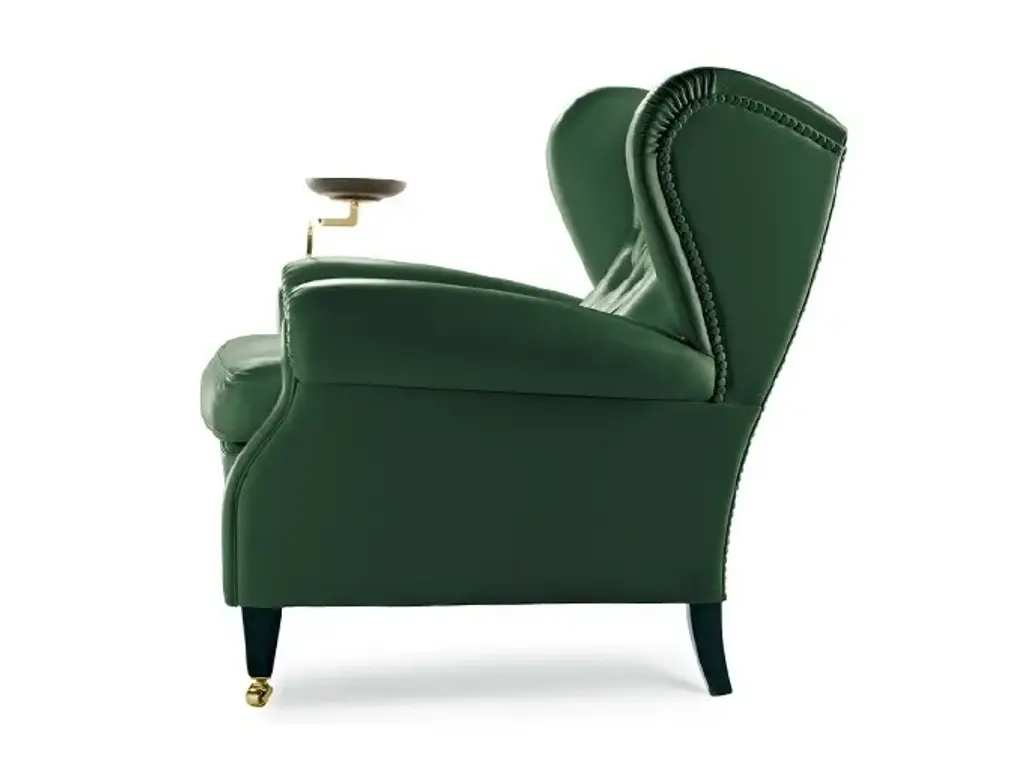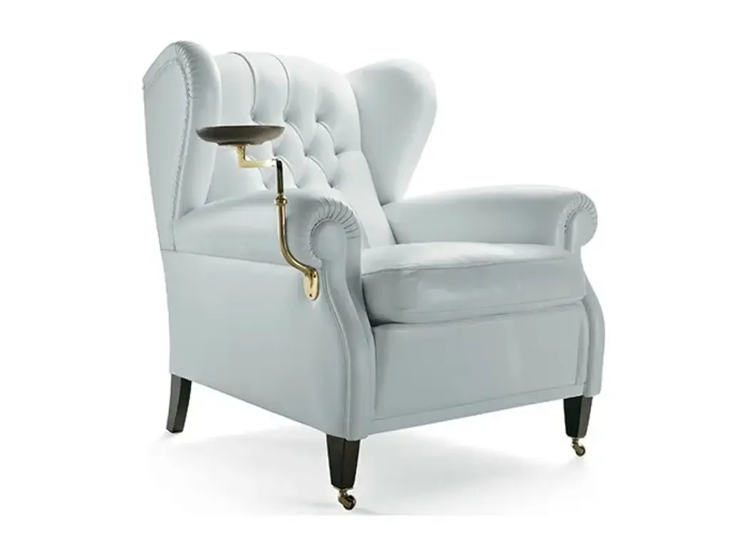 1919 takes its cue from model 128, which made its debut in Renzo Frau’s 1919 catalogue. The 128 reproduced the opulent features of rococo armchairs, with the addition of a special extension to serve as footrest and a small book stand supported by an arm anchored to the side. The present-day version of this armchair, reproducing the big “ears” of the seatback and the large rounded arms with plissé finish, is even more stylish, and the book stand has been replaced with a brass tray. The design of the back is achieved by means of manual quilting, the bearing structure is made of seasoned Beech. The seat is stuffed with rubberised horsehair, the seatback and arms use vegetal horsehair fashioned by hand. The seat, back and arms all use biconic steel springs tied manually and rested on jute belts. Upholstery is available in Pelle Frau® leather from the Color System or in Heritage or Soul leather. The upholstery is also available in Pelle Frau leather from the Color System or Heritage leather for the structure and in fabric for the seat cushions.