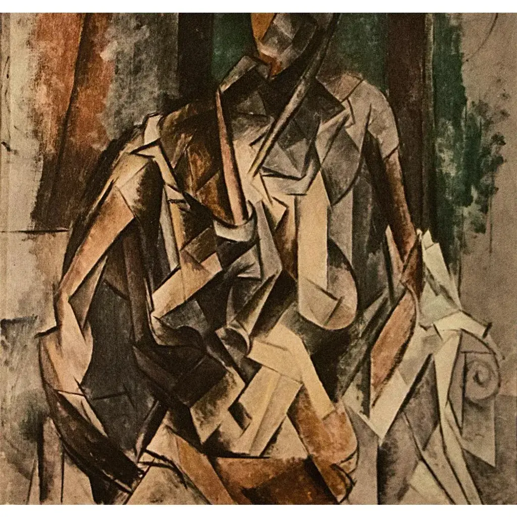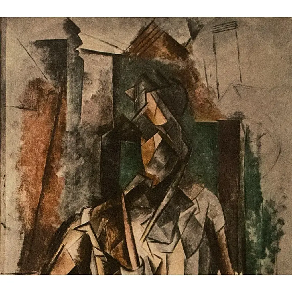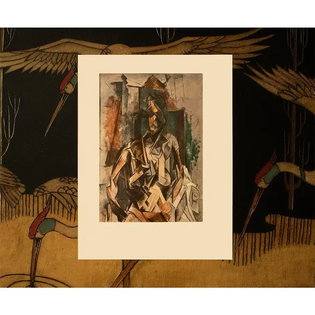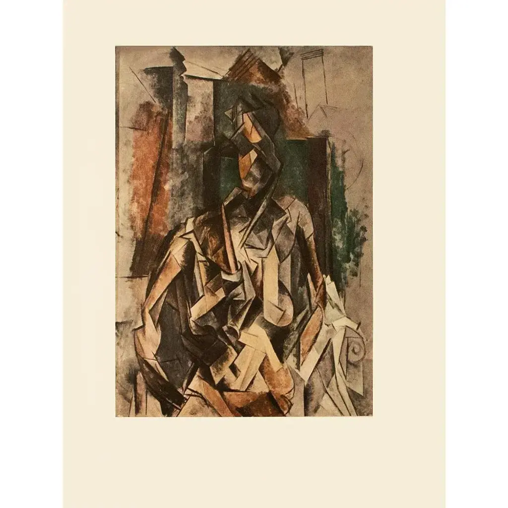 An excellent vintage First Edition period offset lithograph, print, of painting "Woman in an Armchair" (1909) by Pablo Picasso. Comes from a rare First Limited Edition folio published in 1954 in Italy. Printed on one side. Hand tipped-in on a board of heavy paper. Printed name of artwork on the back is related to another piece in the folio. Superb quality. very detailed. Colors are deep and rich. Excellent condition - minor edge wear on the board, never framed. You will love texture of the piece. Overall 11.10"W x 14.5"H Image 7.5"W x 10.5"H