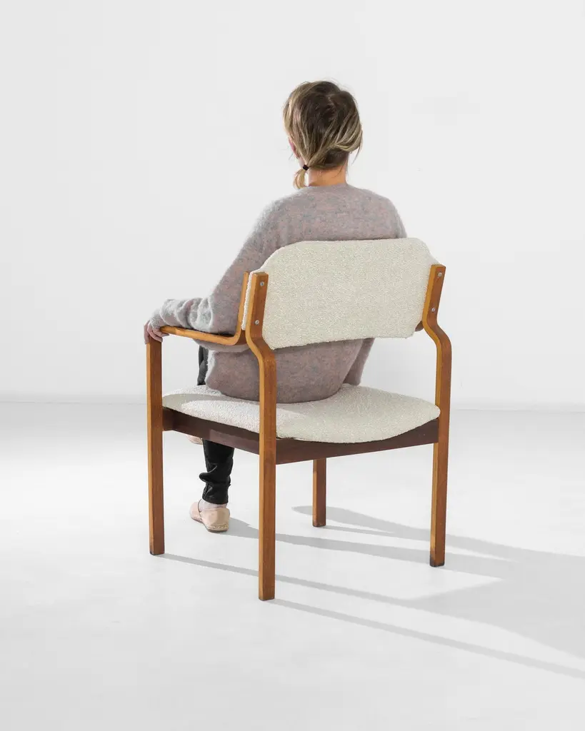 An upholstered wooden armchair with a unique Mid-Century Modern silhouette. Made in the 1980s by TON, this piece showcases the innovative yet humane design for which the Czech furniture manufacturer is renowned. Angular lines create a stylish geometric profile, while the inviting natural tones and textures of the polished wood and homespun upholstery bring balance to the severe elegance of the form.