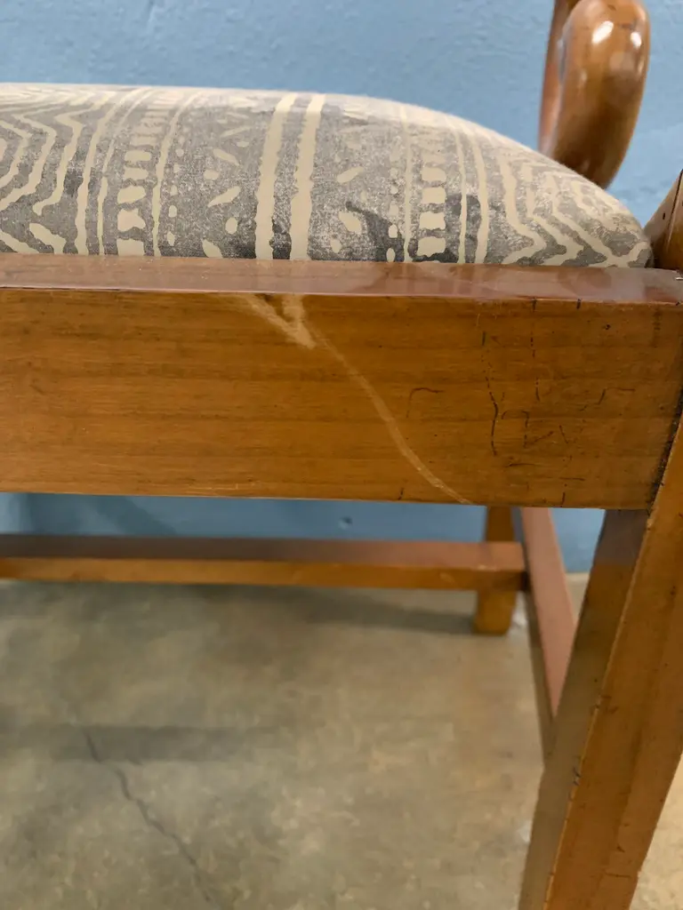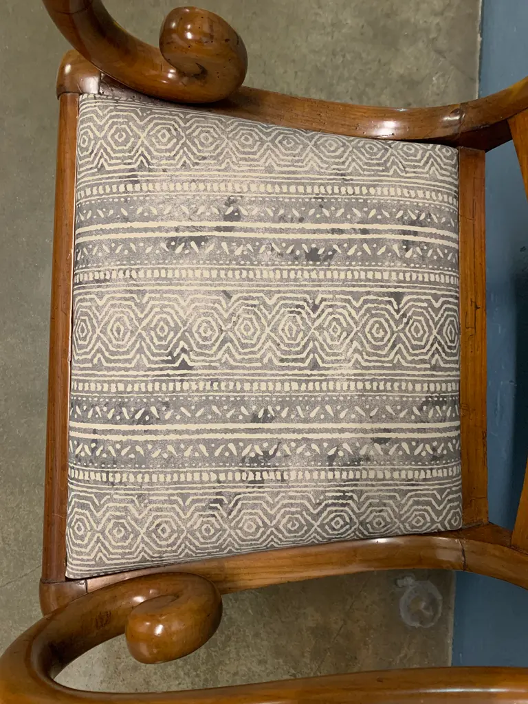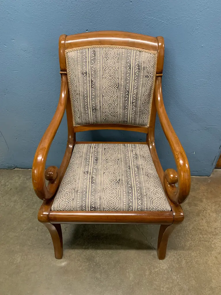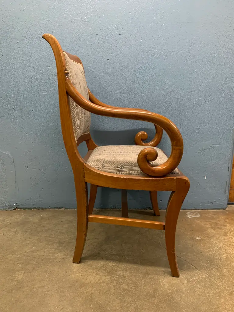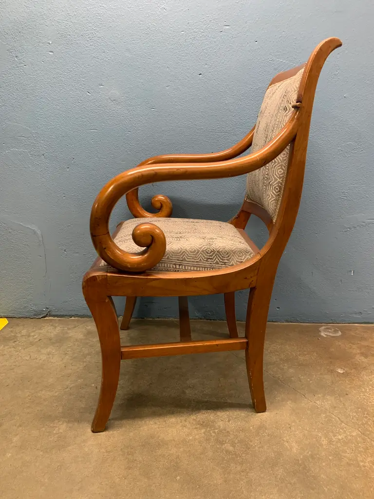 Vintage Wood Armchair With Scroll Arms and upholstered seat and back in a fortuny style cotton blend fabric. A total of 4 of these chairs are available sold separately.