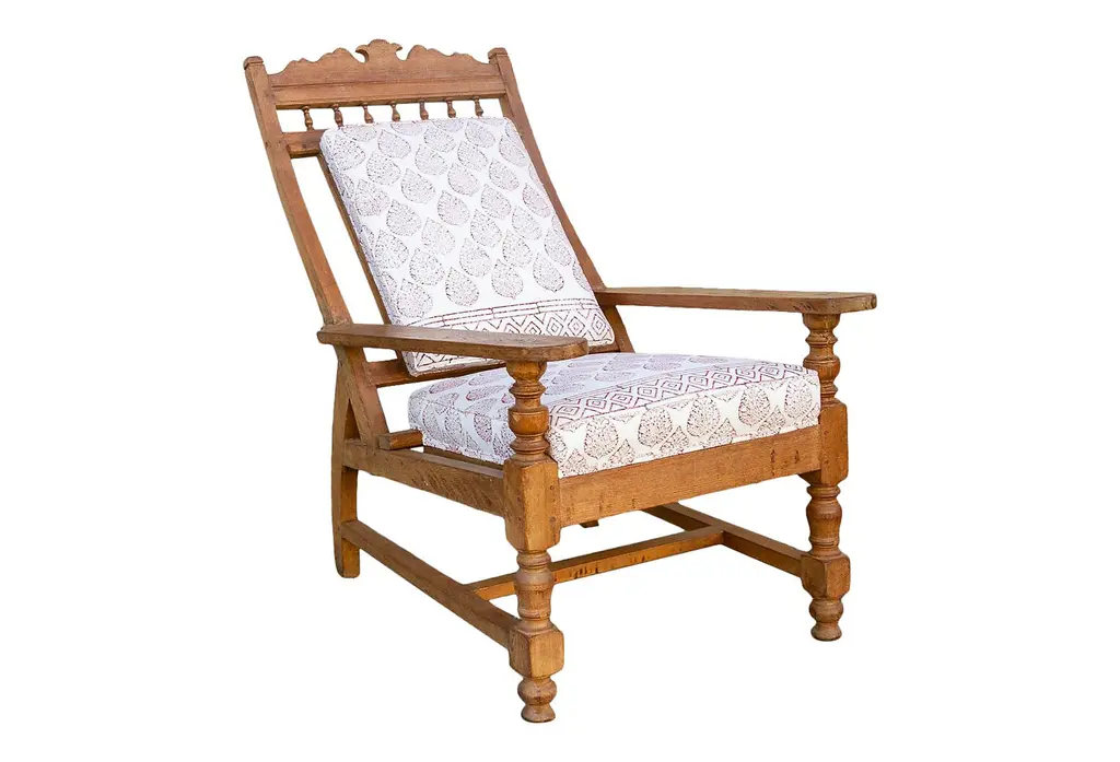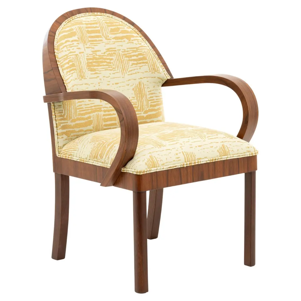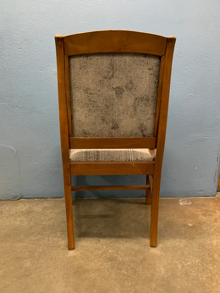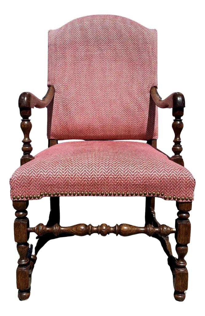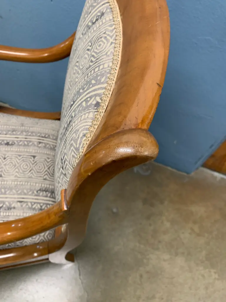 Vintage Wood Armchair With Scroll Arms and upholstered seat and back in a fortuny style cotton blend fabric. A total of 4 of these chairs are available sold separately.