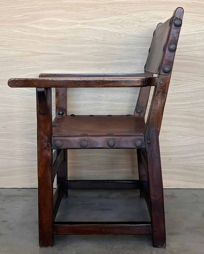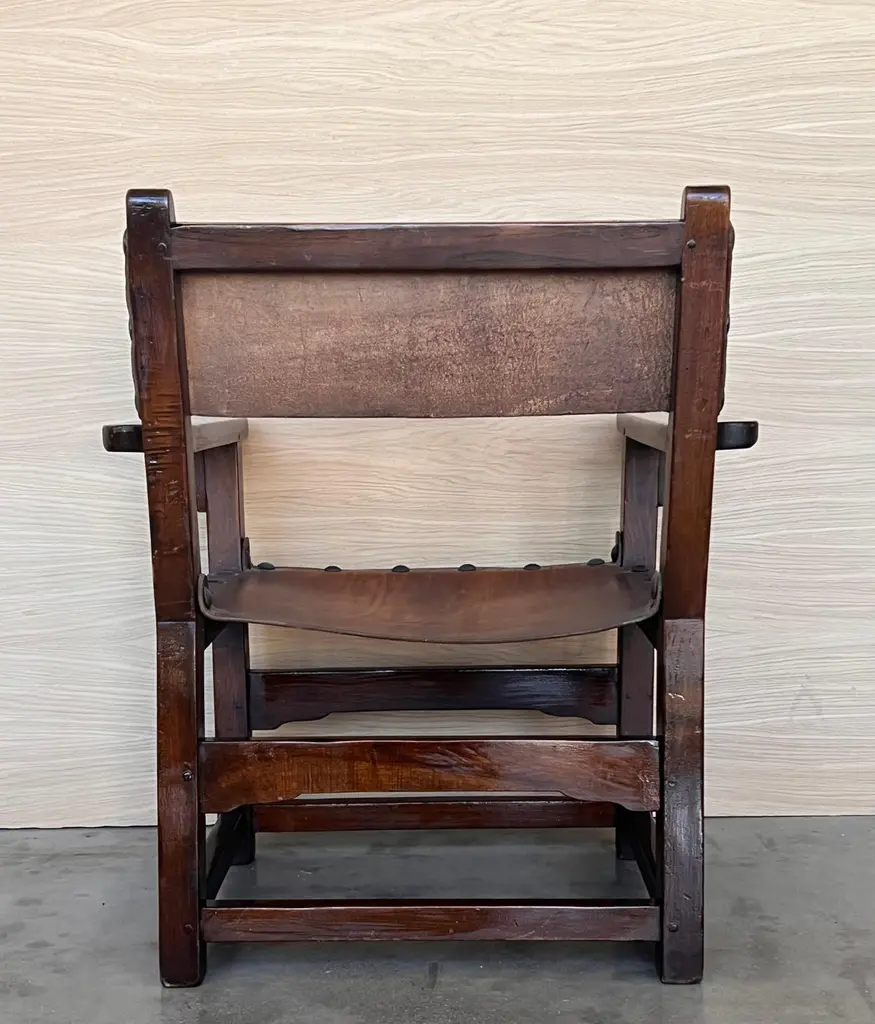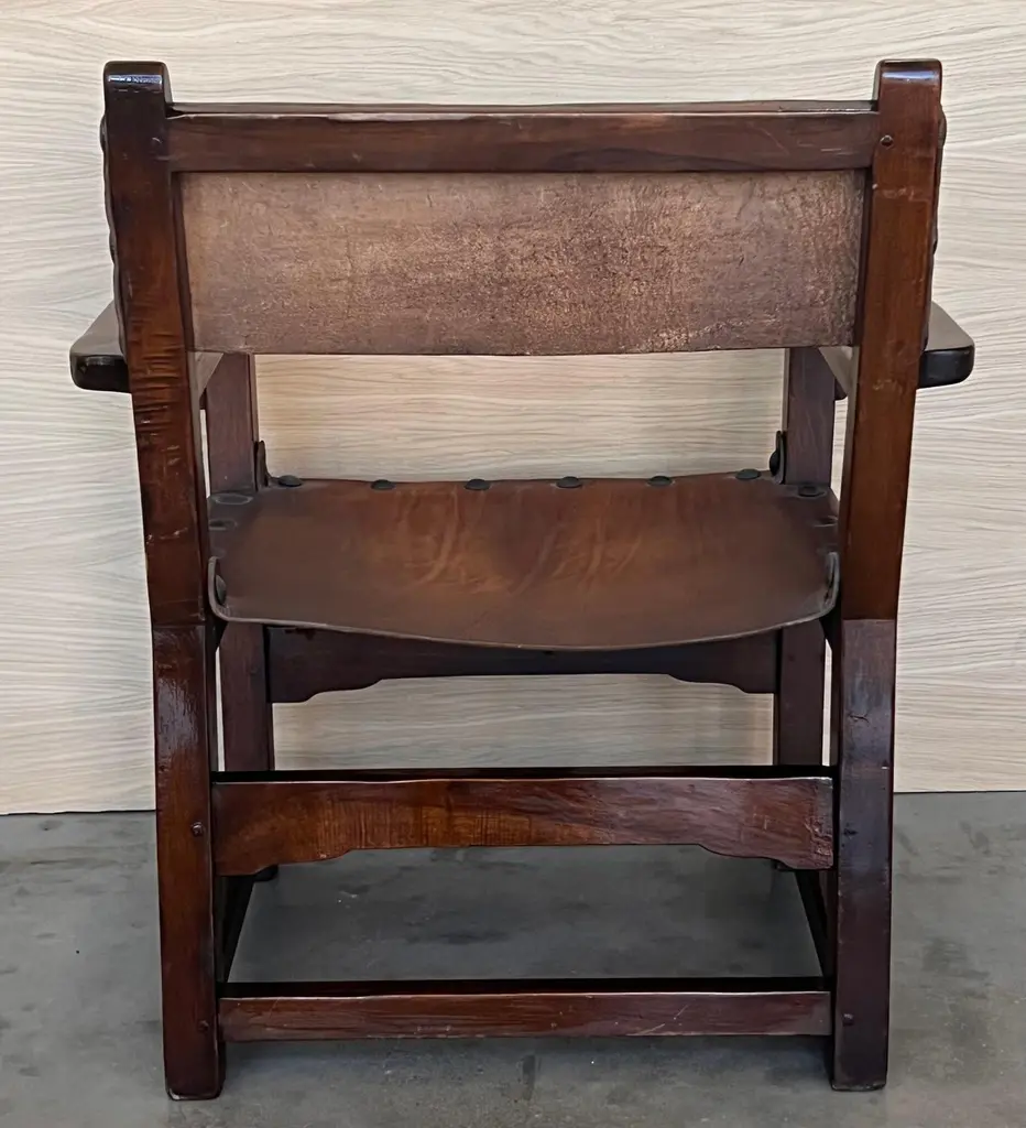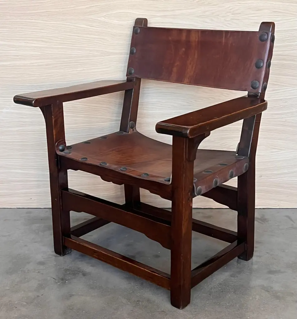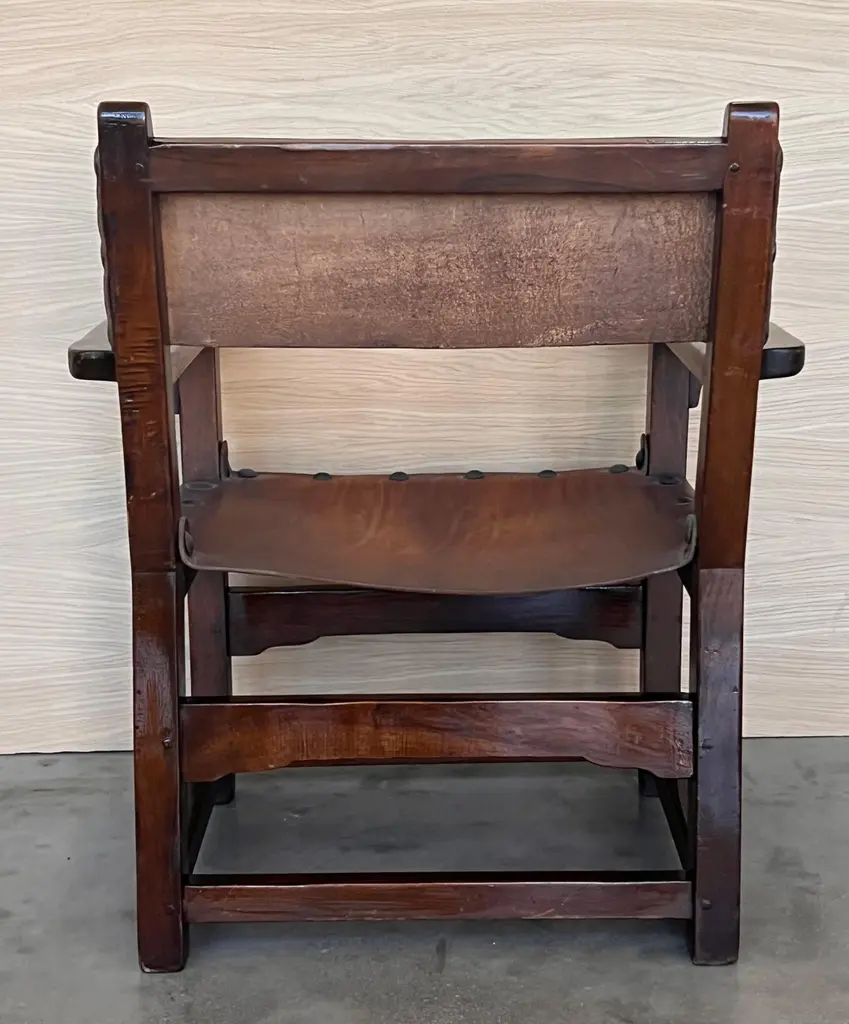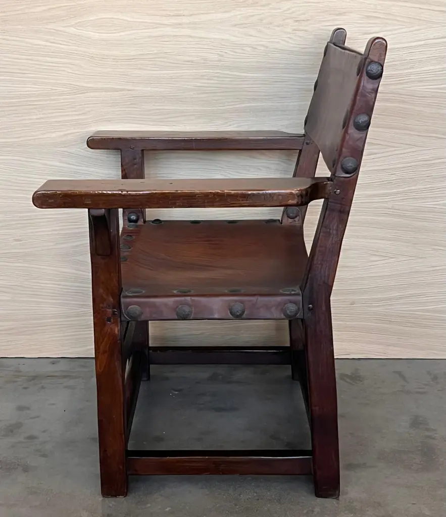 19th century walnut Spanish colonial altar armchairs with leather back and seat The unusual size of the arms complete this exceptional pair of armchairsMeasures: Height to arms 23.81 in.