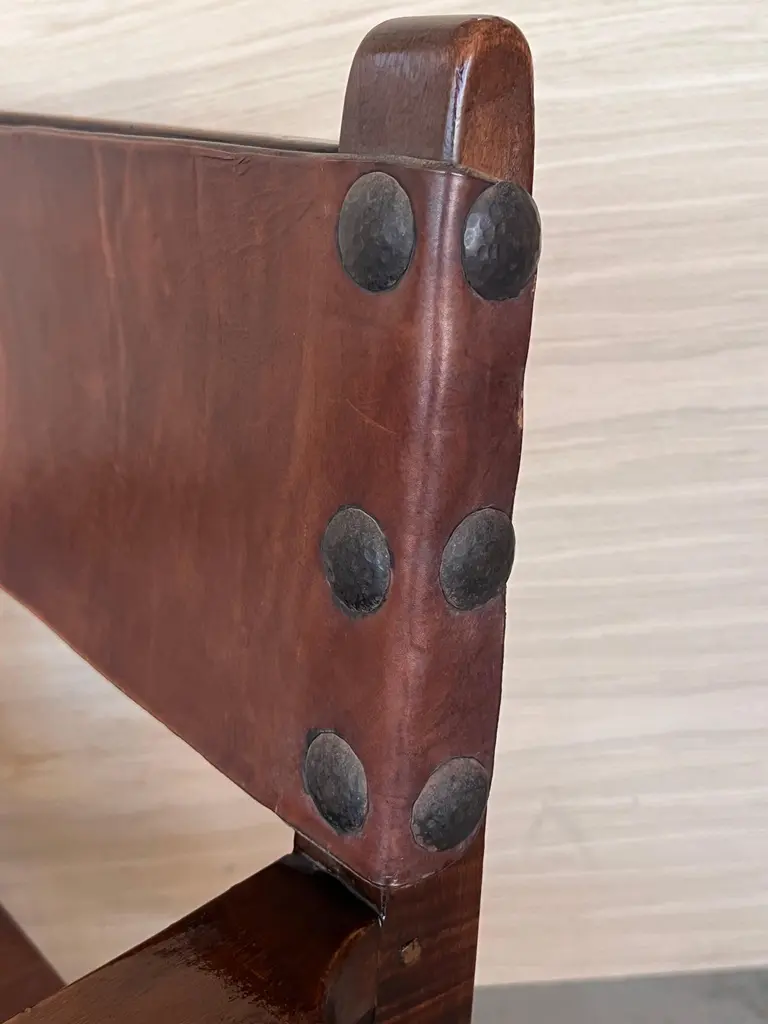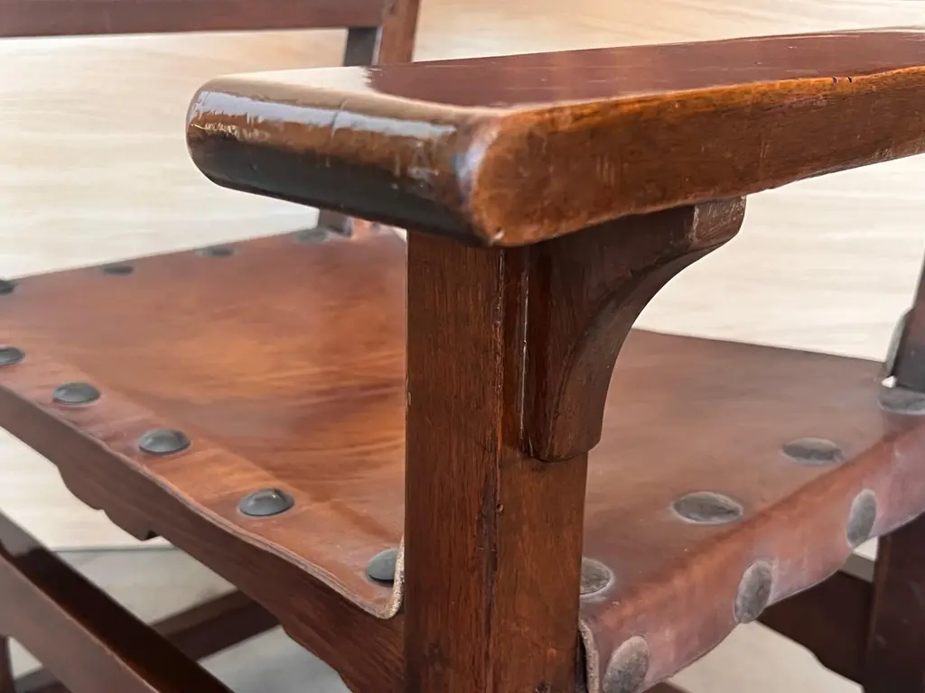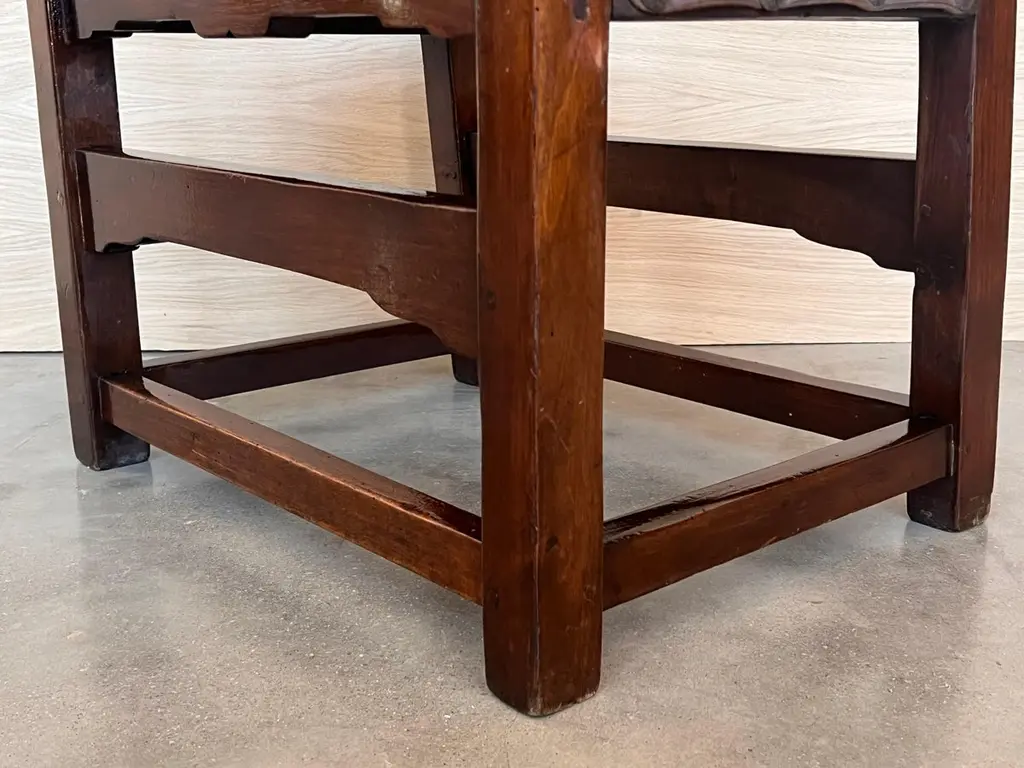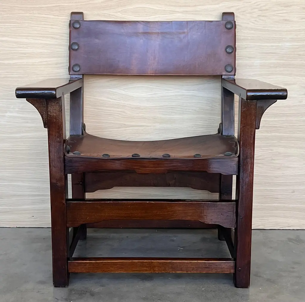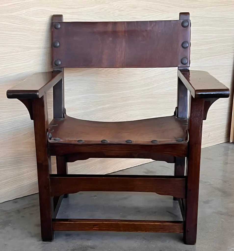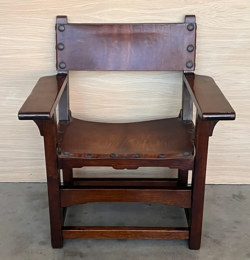 19th century walnut Spanish colonial altar armchairs with leather back and seat The unusual size of the arms complete this exceptional pair of armchairsMeasures: Height to arms 23.81 in.