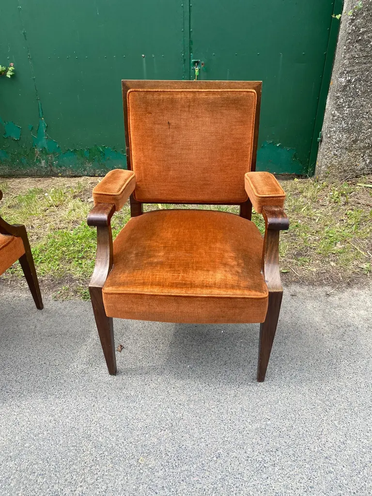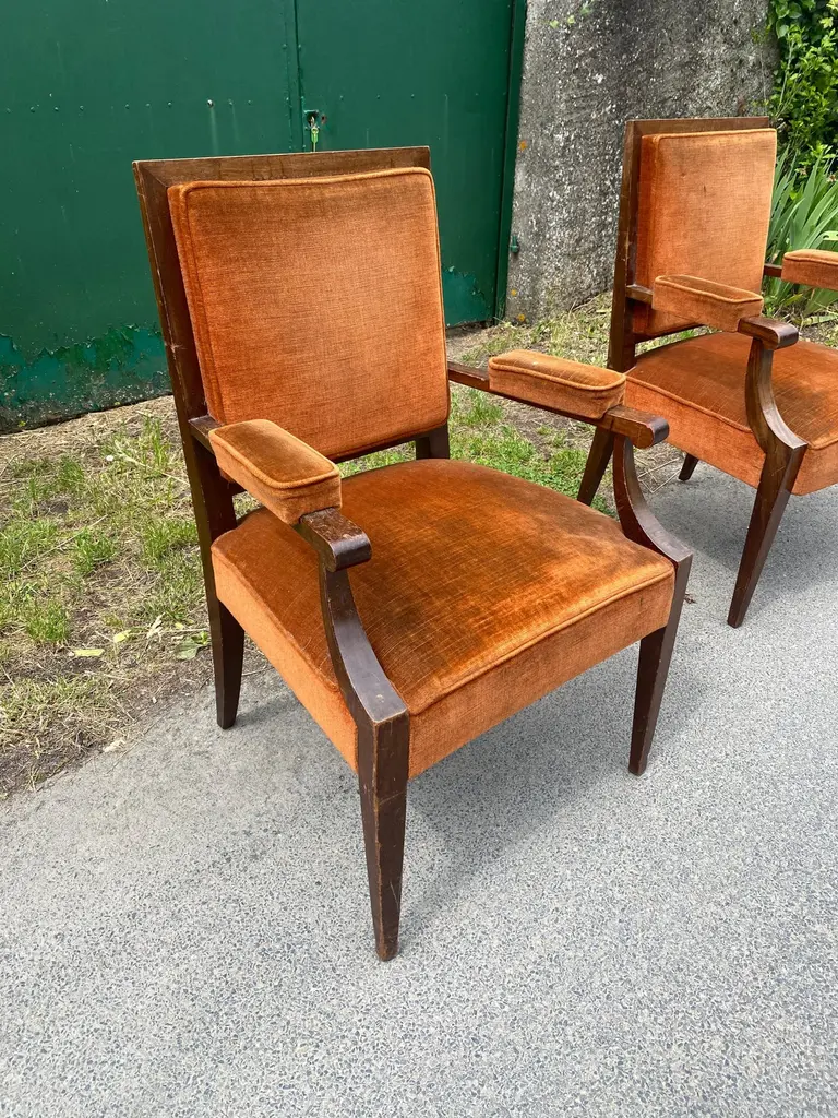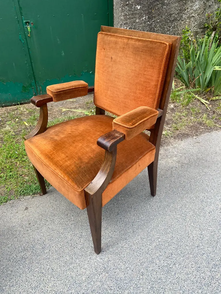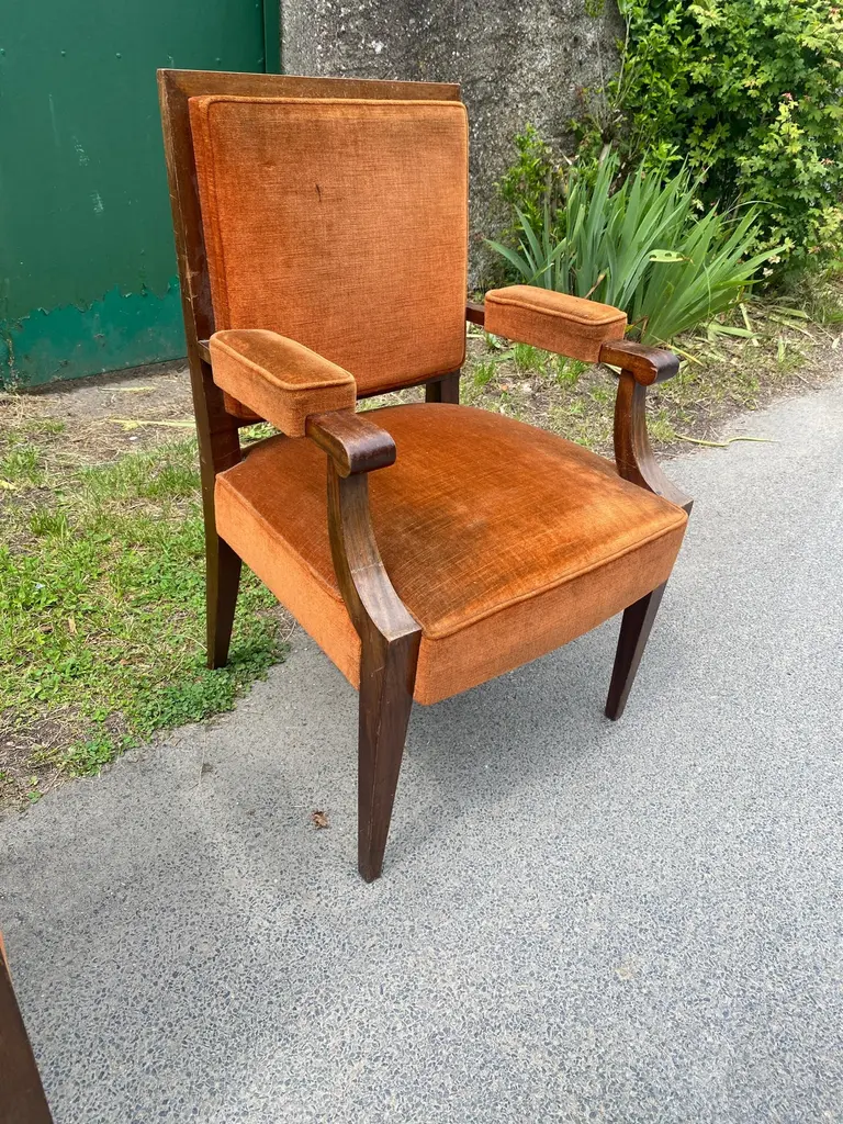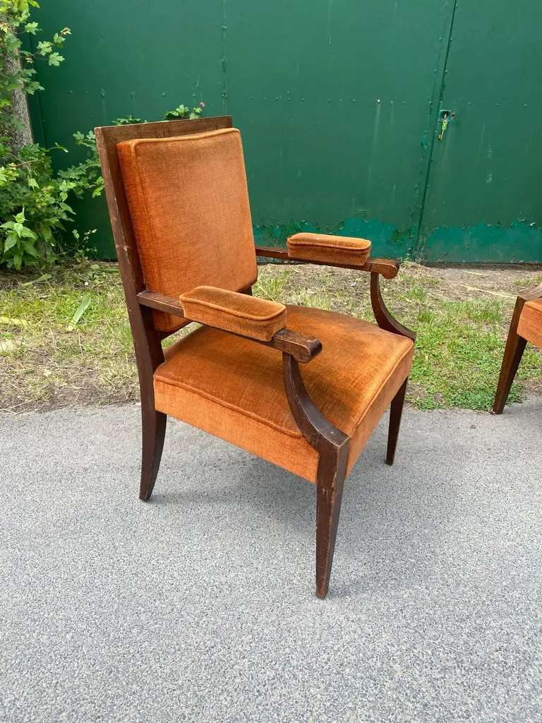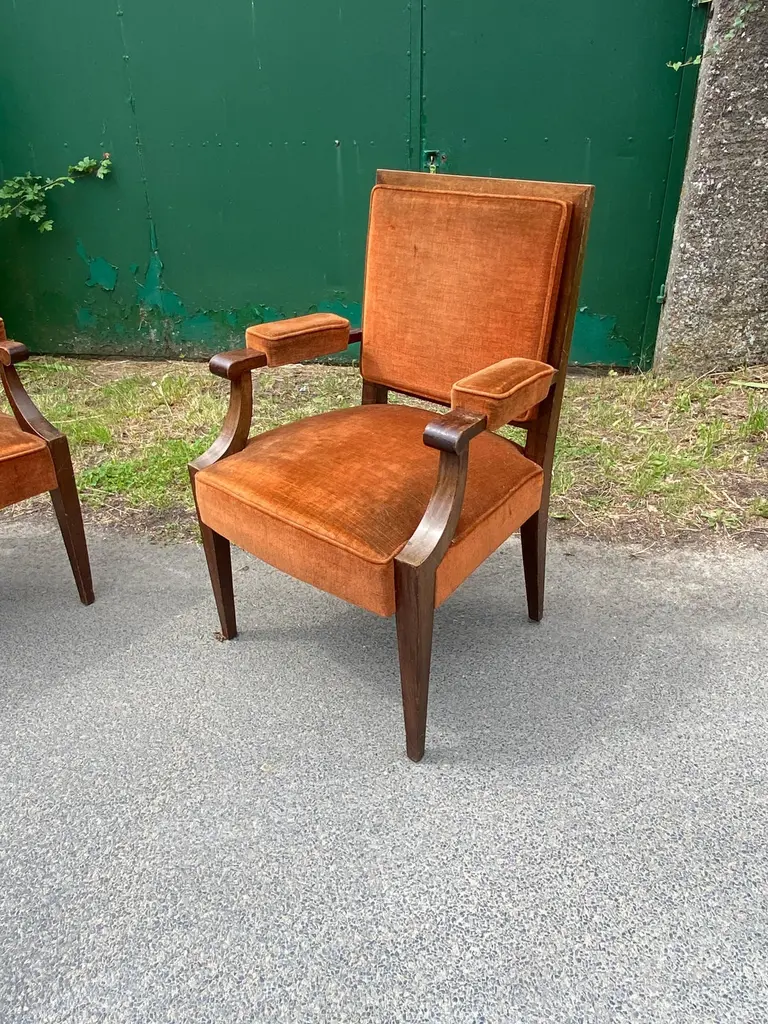 Two art deco armchairs in the style of André Arbus in fruit wood and velvetvery slightly different model size: 97x62x58 cm and 96x61x55 cmthe price is for onetwo are available