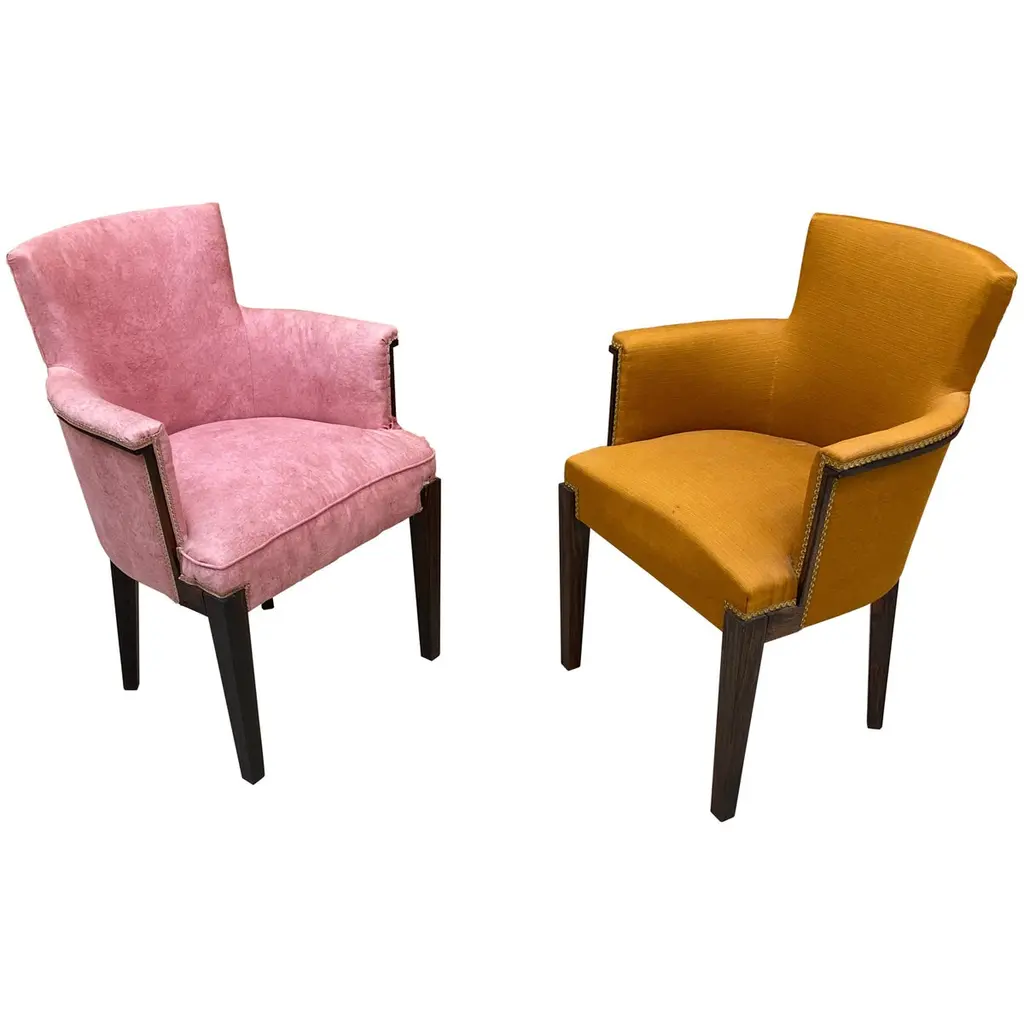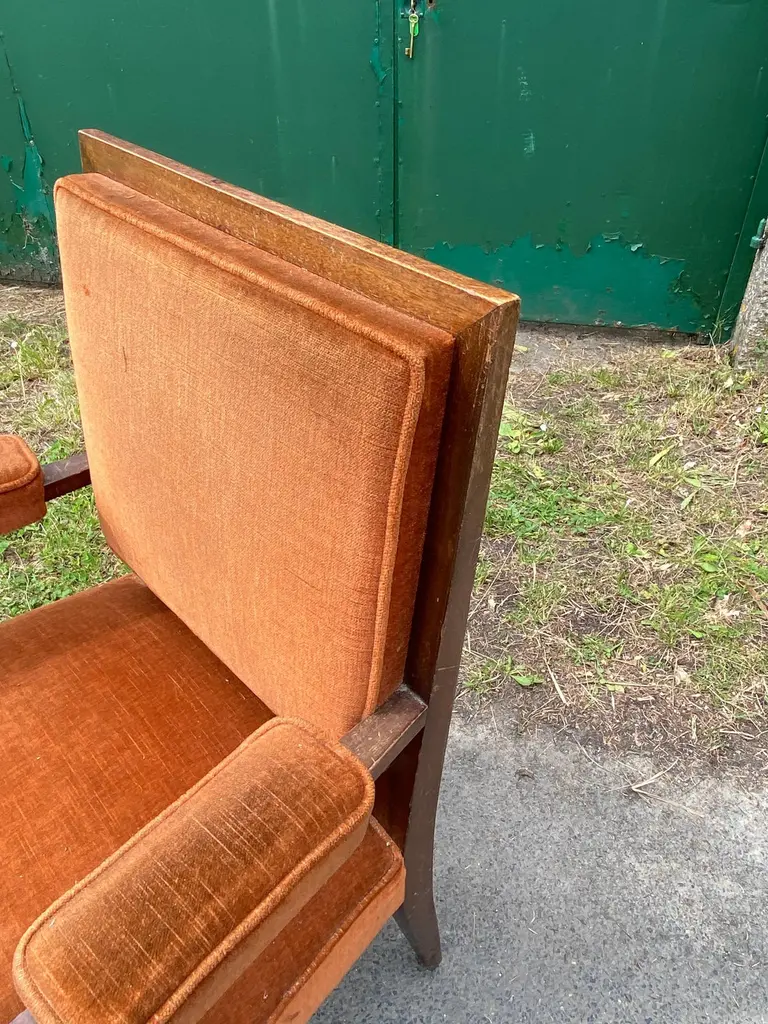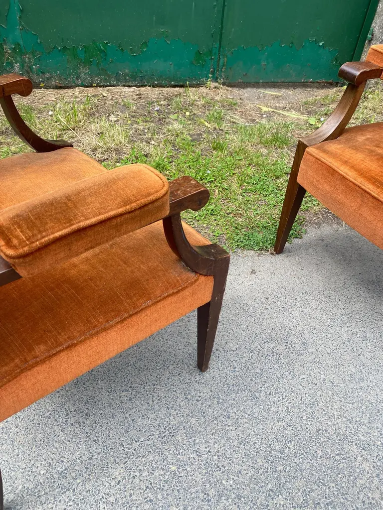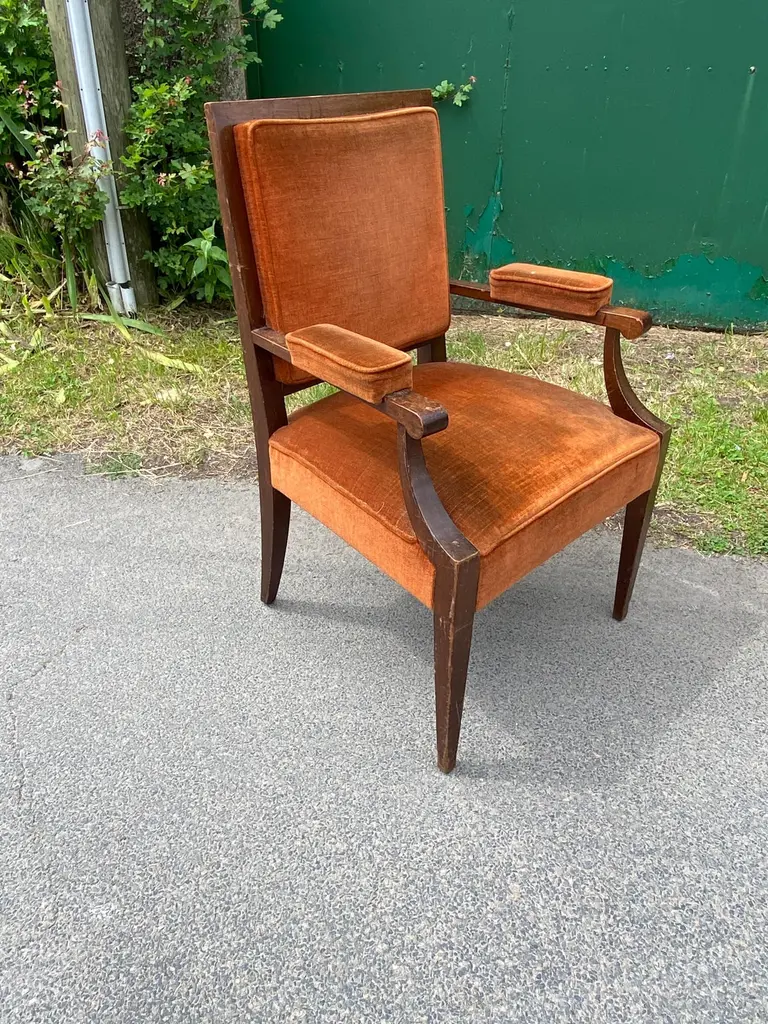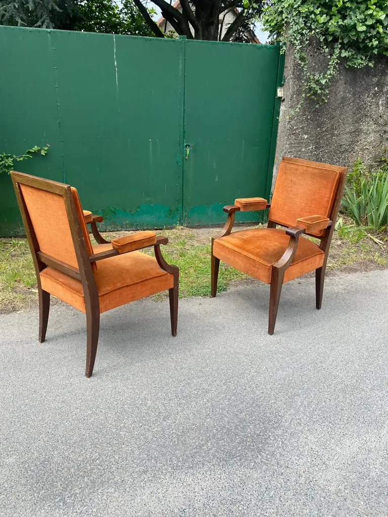 Two art deco armchairs in the style of André Arbus in fruit wood and velvetvery slightly different model size: 97x62x58 cm and 96x61x55 cmthe price is for onetwo are available