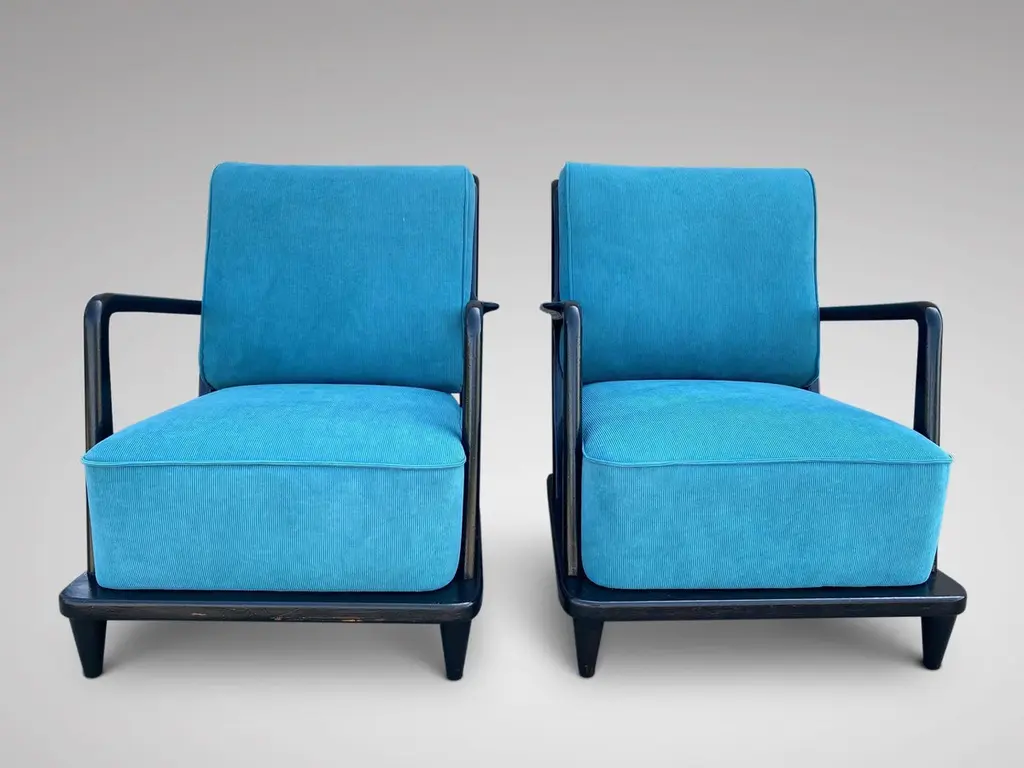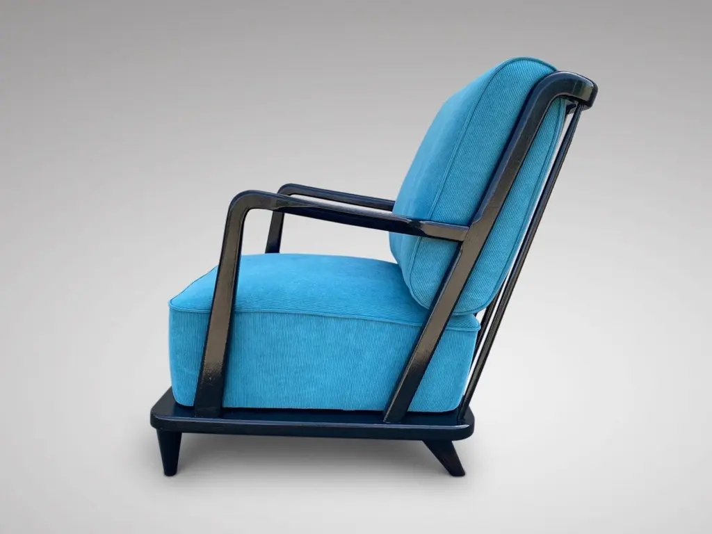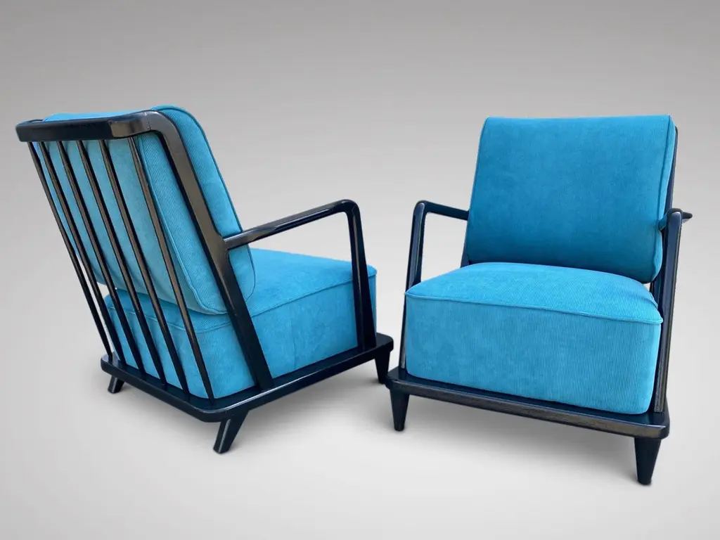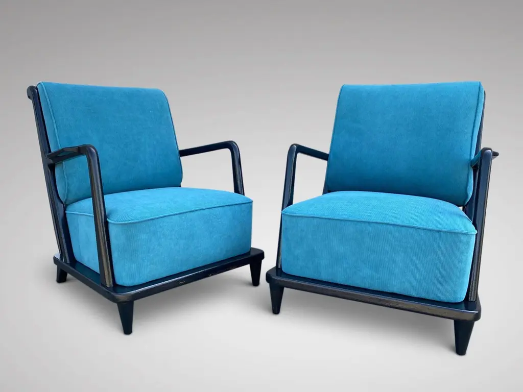 A pair of mid 20th century French black lacquered ebonised lounge armchairs. Newly reupholstered in quality petrol blue cotton corduroy fabric. Very comfortable. France 1950s. Very comfortable seating. The pair of chairs have recently been professionally reupholstered. A rather pleasing example.DIMENSIONSHeight: 80cm (31.5in)Width: 66cm (26.0in)Depth: 73cm (28.7in)