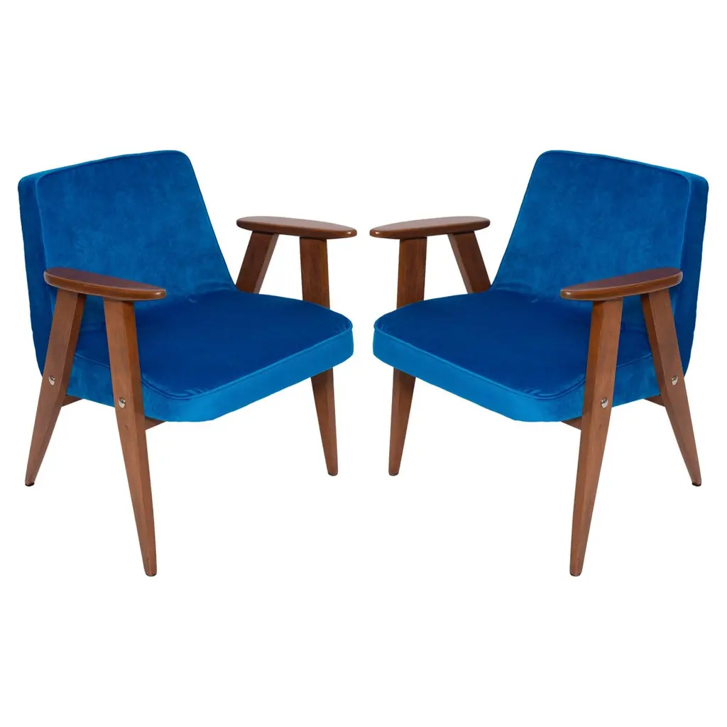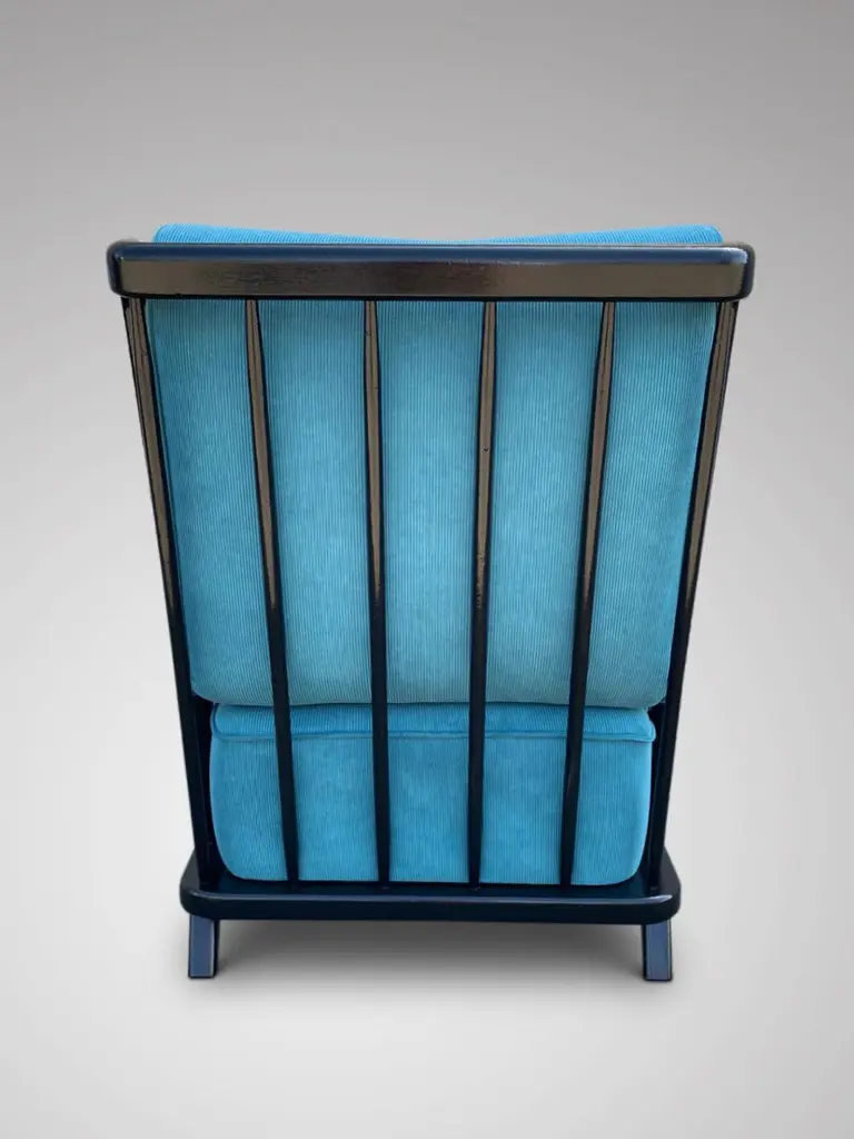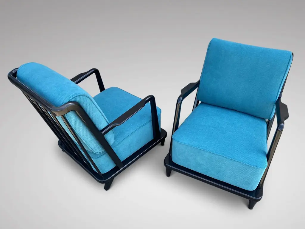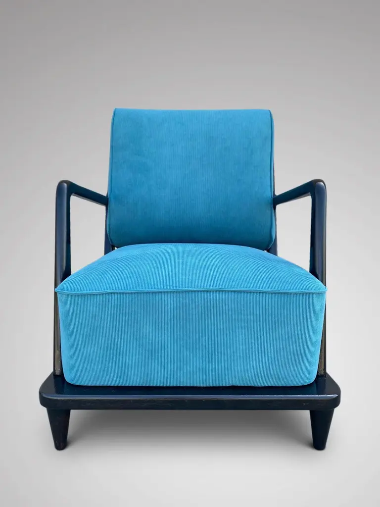 A pair of mid 20th century French black lacquered ebonised lounge armchairs. Newly reupholstered in quality petrol blue cotton corduroy fabric. Very comfortable. France 1950s. Very comfortable seating. The pair of chairs have recently been professionally reupholstered. A rather pleasing example.DIMENSIONSHeight: 80cm (31.5in)Width: 66cm (26.0in)Depth: 73cm (28.7in)