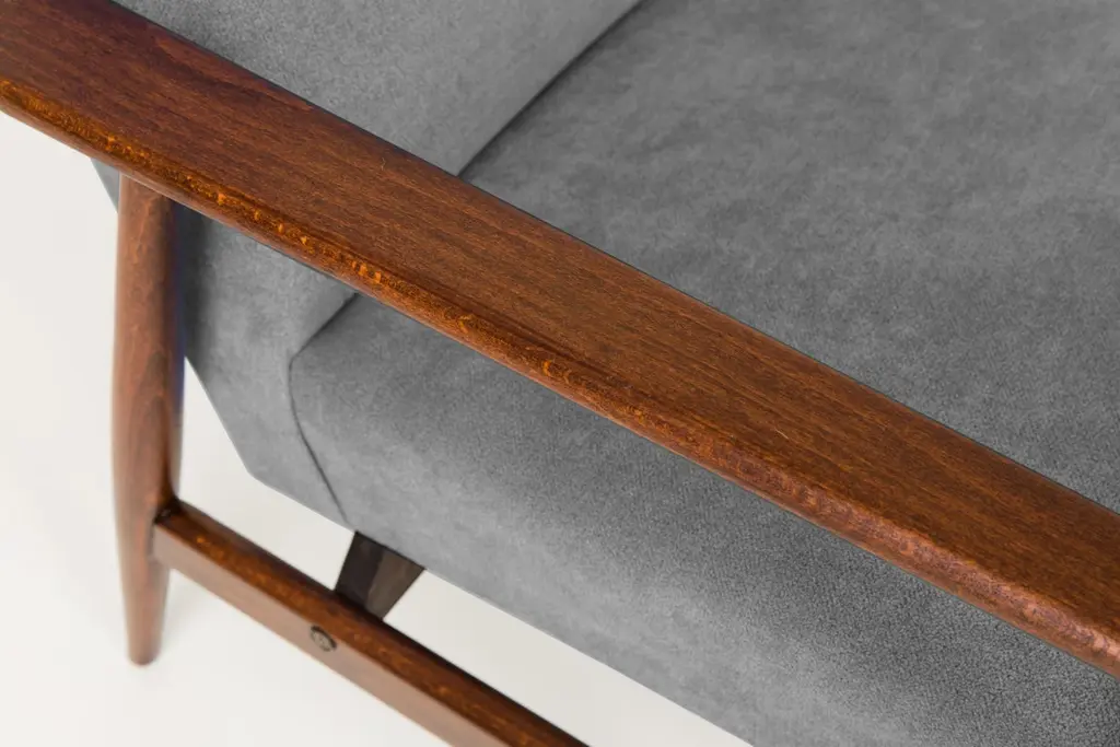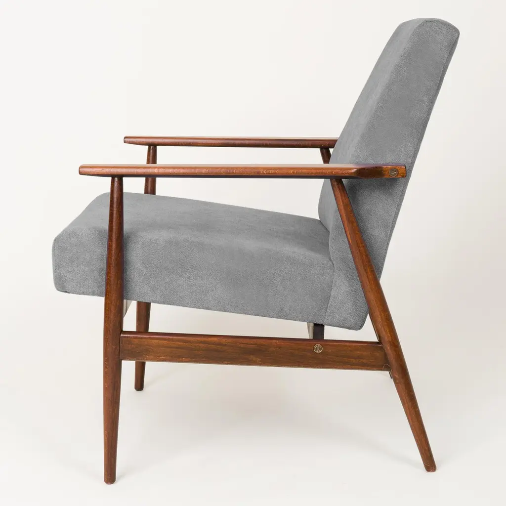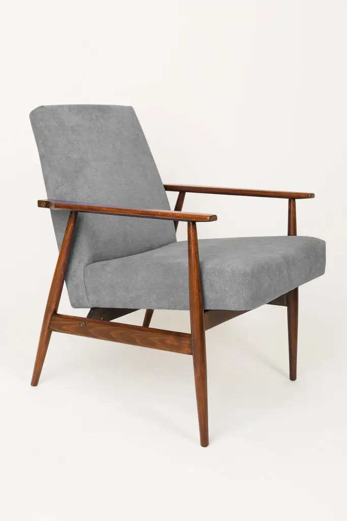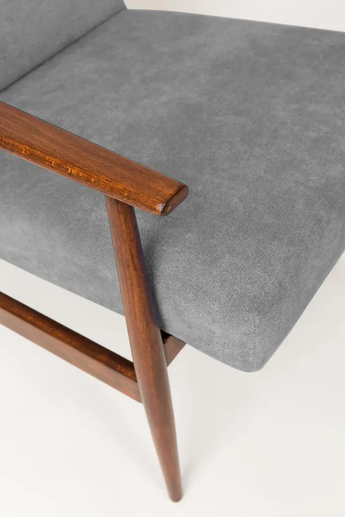 A beautiful, restored armchairs designed by Henryk Lis. Furniture after full carpentry and upholstery renovation. The fabric, which is covered with a backrest and a seat, is a high-quality velor upholstery. The armchairs will be perfect in Minimalist spaces, both private and public. We can prepare this armchairs in different color of fabric and wood.