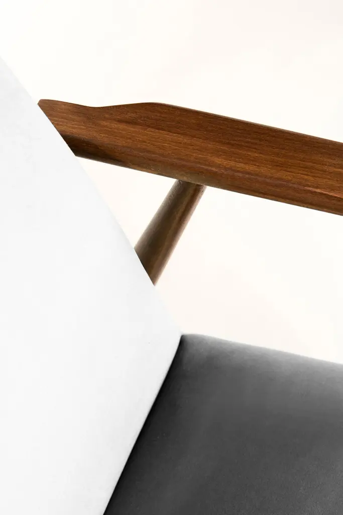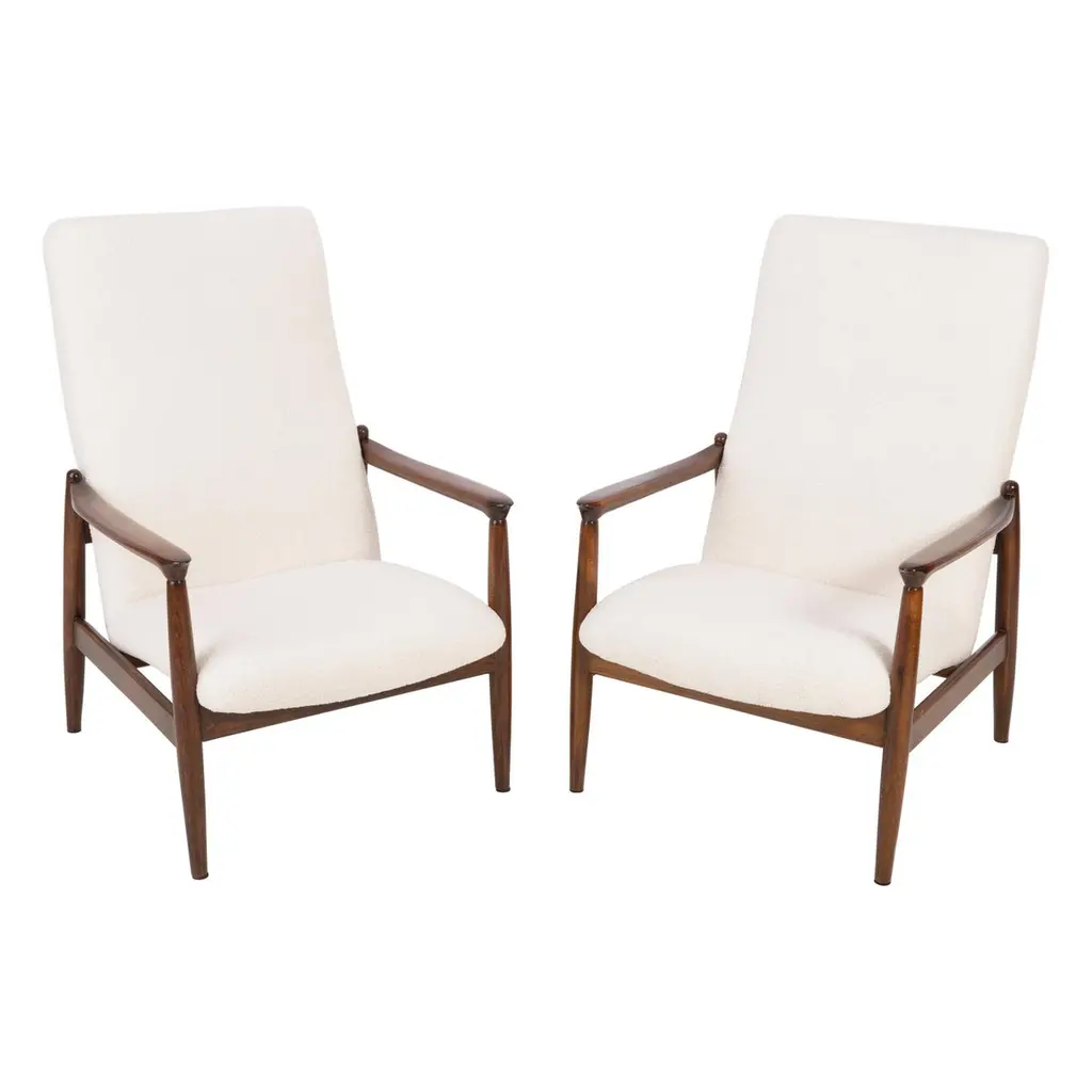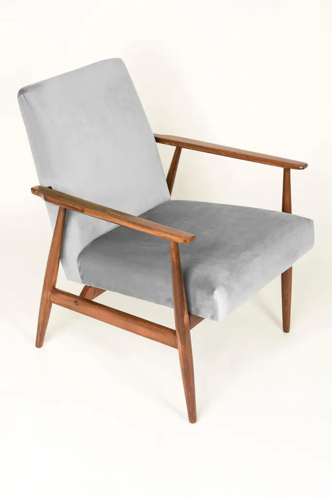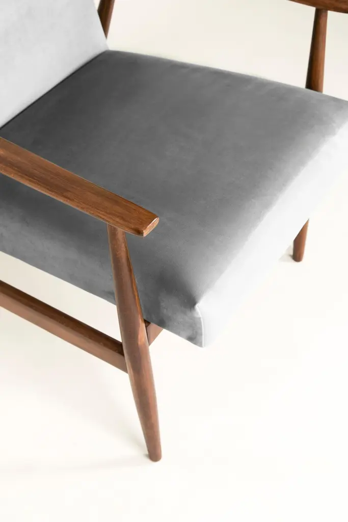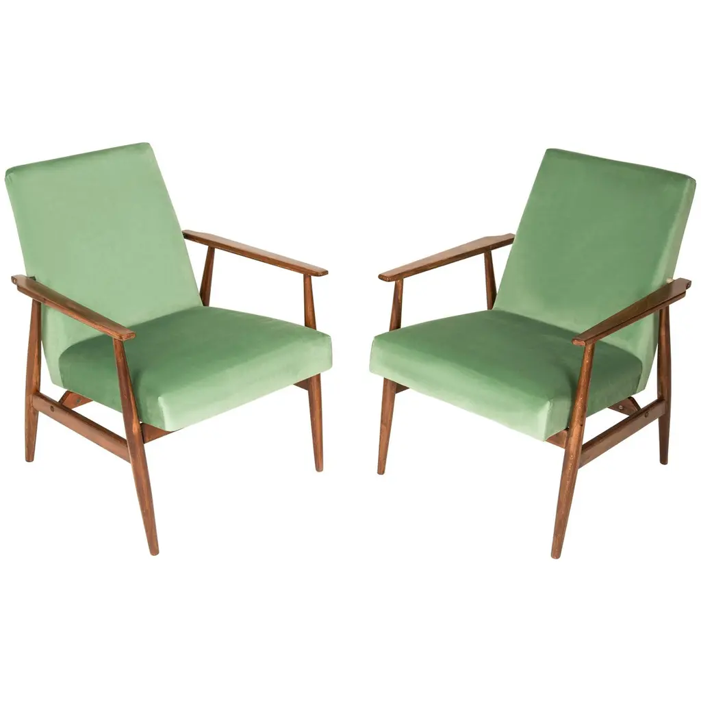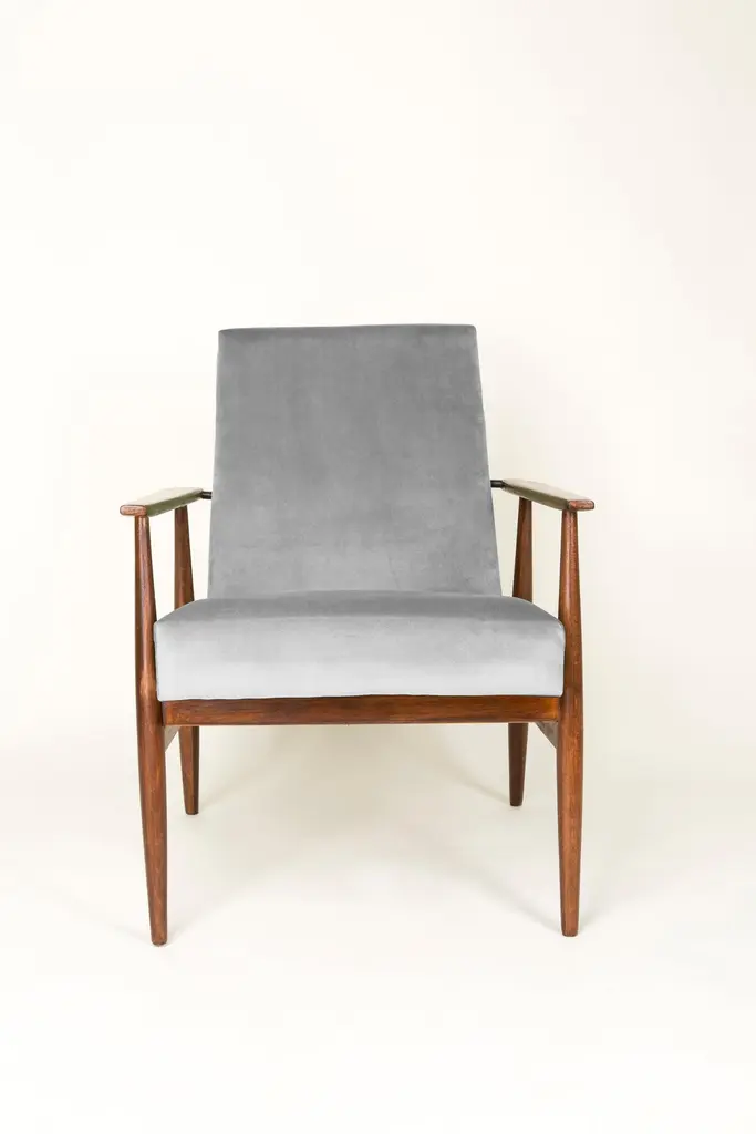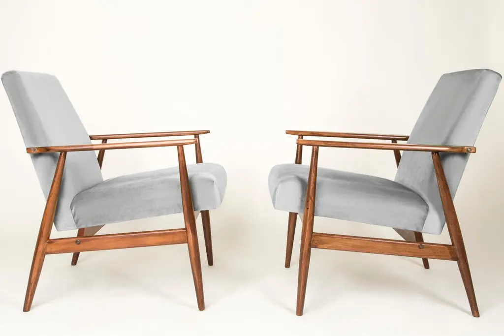 A beautiful, restored armchairs designed by Henryk Lis. Furniture after full carpentry and upholstery renovation. The fabric, which is covered with a backrest and a seat, is a high-quality velor upholstery. The armchairs will be perfect in Minimalist spaces, both private and public. We can prepare this armchairs in different color of fabric and wood.
