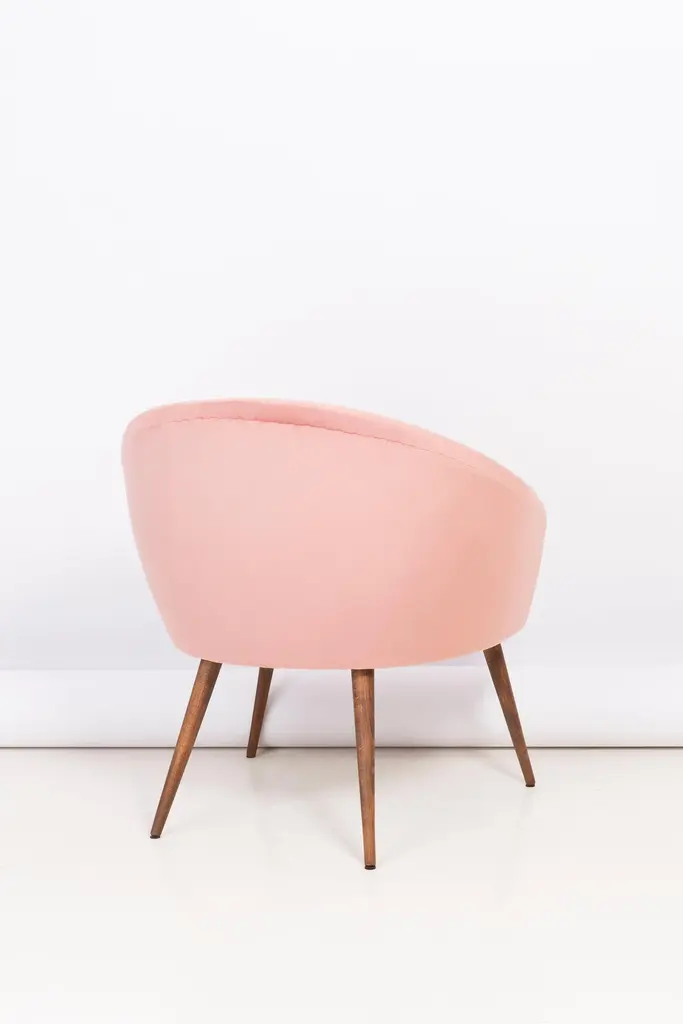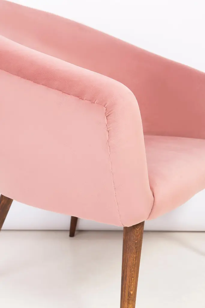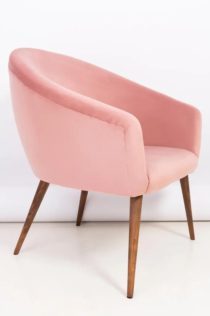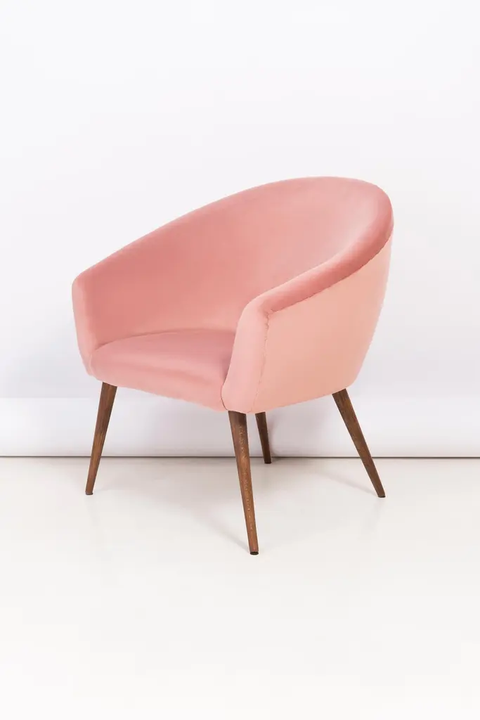Very comfortable and stabile club seat. Produced in the 1960s in Poland. The whole armchair are covered with high-quality velour color pink 2258. The armchair is after a complete upholstery and wood renovation. We can prepare this armchair in another wood and fabric color. Also in set of two or more.