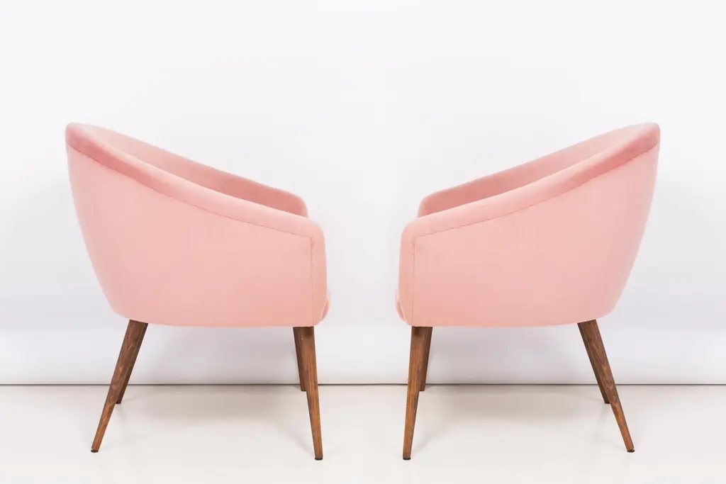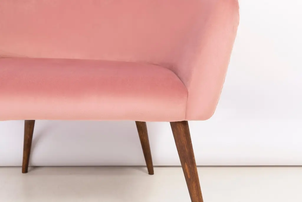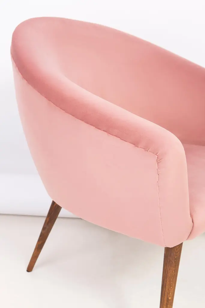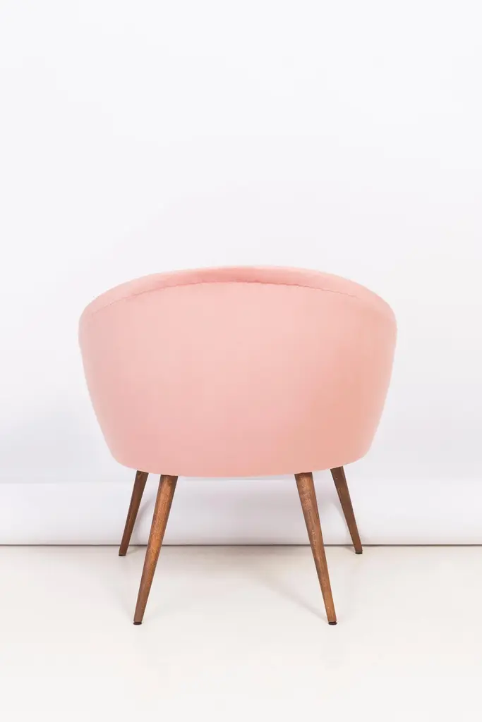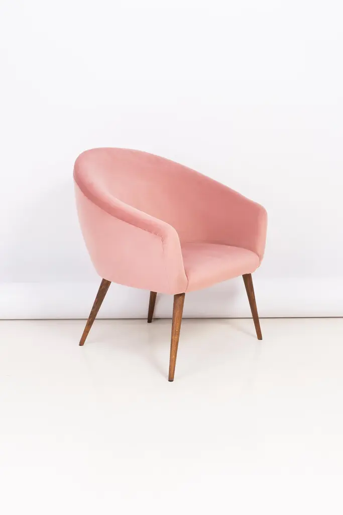 Very comfortable and stabile club seat. Produced in the 1960s in Poland. The whole armchair are covered with high-quality velour color pink 2258. The armchair is after a complete upholstery and wood renovation. We can prepare this armchair in another wood and fabric color. Also in set of two or more.