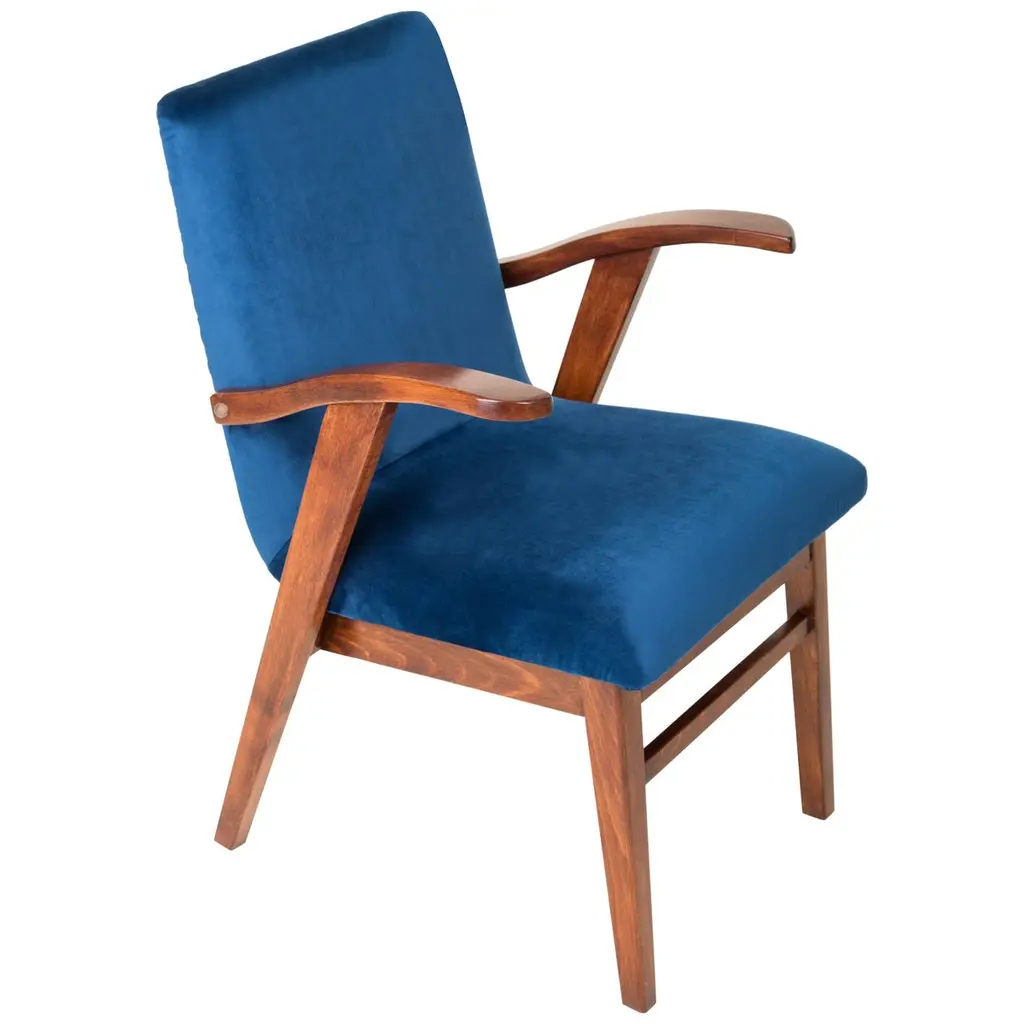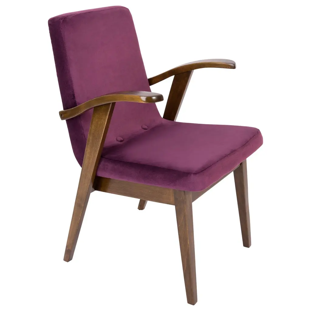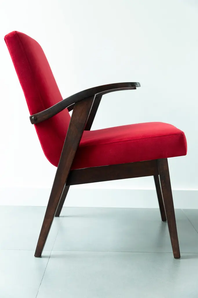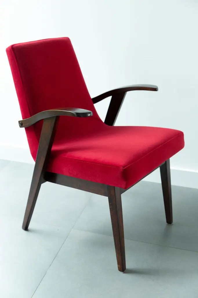 Armchair designed by Mieczyslaw Puchala. Dark brown wood combined with a red beautiful velvet gives it elegance and nobility. The chair has undergone a full carpentry and upholstery renovation. The wood is in excellent condition after full renovation, finished with semi-matte varnish. Produced in the 1960s in Poland. We can prepare set of 2, 4, 6 or more also in another wood and velvet color. Please check the last picture with velvet color samples.
