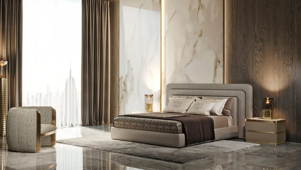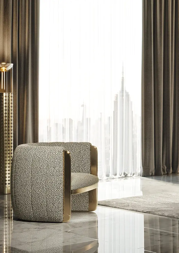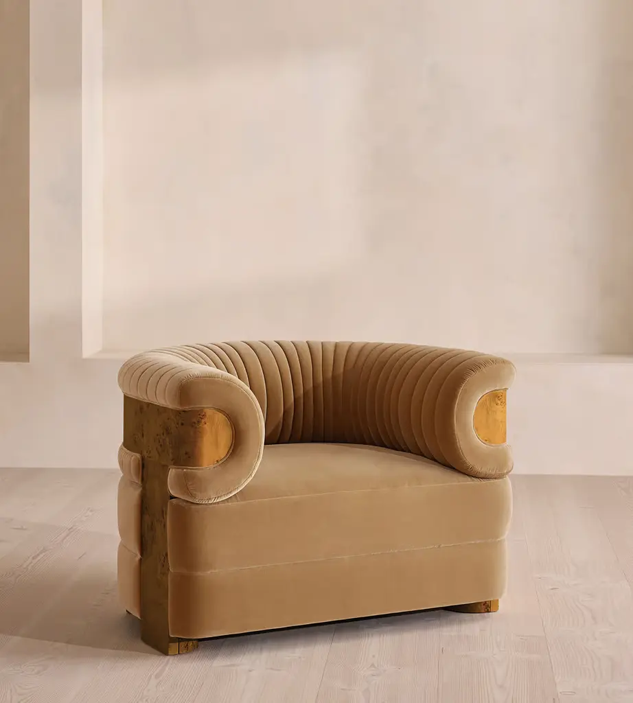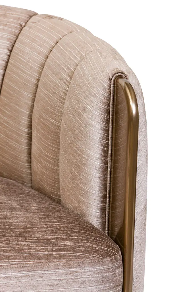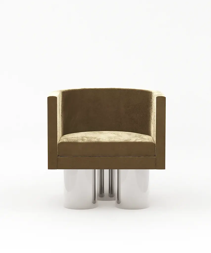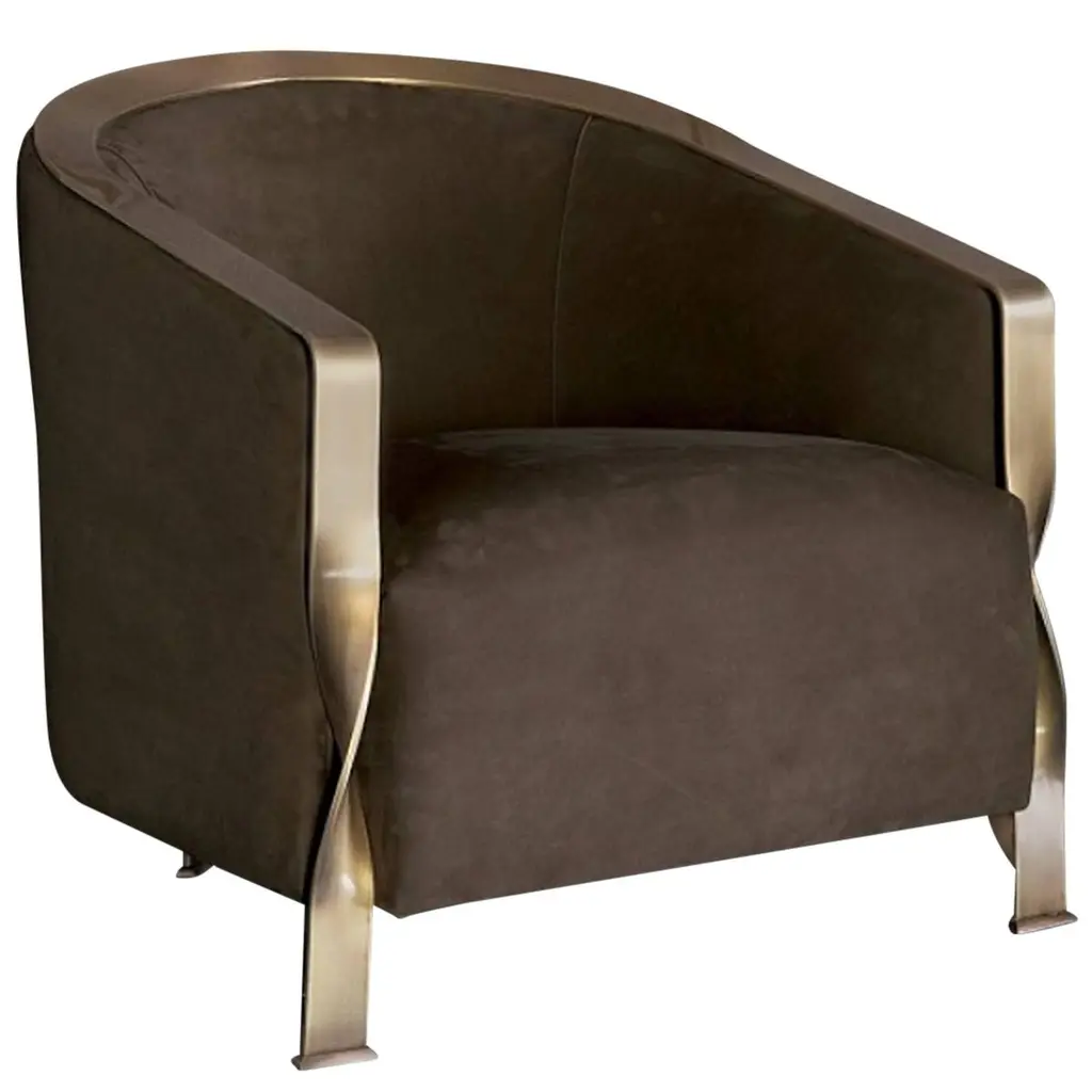 21st century Art Deco Elie Saab Maison liquid metal fabric Kate armchair, ItalyWith its geometric charm, the captivating design of the Kate armchair reflects the contemporary refinement and elegance of the Elie Saab Brand. Structure with frontal parts visible in Liquid Metal and the exquisite upholstery create a unique design through the exquisite sartorial craftsmanship with vertical seams at sight. Made in Italy. Design By Carlo Colombo.Composition: Plywood and Solid Wood Structure. Frontal Part structure in Liquid Metal. Upholstery in polyurethan with Fabric 8005 Foraker Col. Beaver (52% VI 25% CO 23% PES)Dimensions: W 92cm x P 84cm x H 78cm I H Seat 47cmThe Elie Saab Maison collection perfectly blends together all essential elements of the project; the uniqueness of the Elie Saab Brand signature, the research in design, and the artisan excellence of Made in Italy.Carlo Colombo, a remarkable Italian architect and designer, has translated the vision of Mr. Saab into the collection. A collection that has been designed to convey the strength of the artistry it embodies, the attention to detail, the richness of the materials in pure Elie Saab style.Upholstery available in all fabrics and leathers of the collection.Customisation available.Lead Time is between 13-14 weeks. Please note that the company will be closed from 7th till 25th of August 2023.