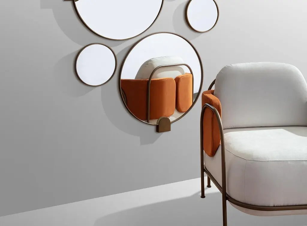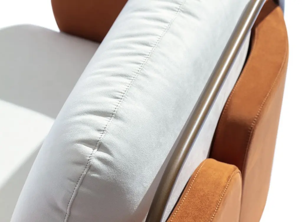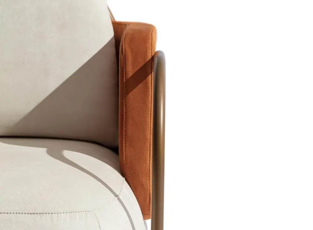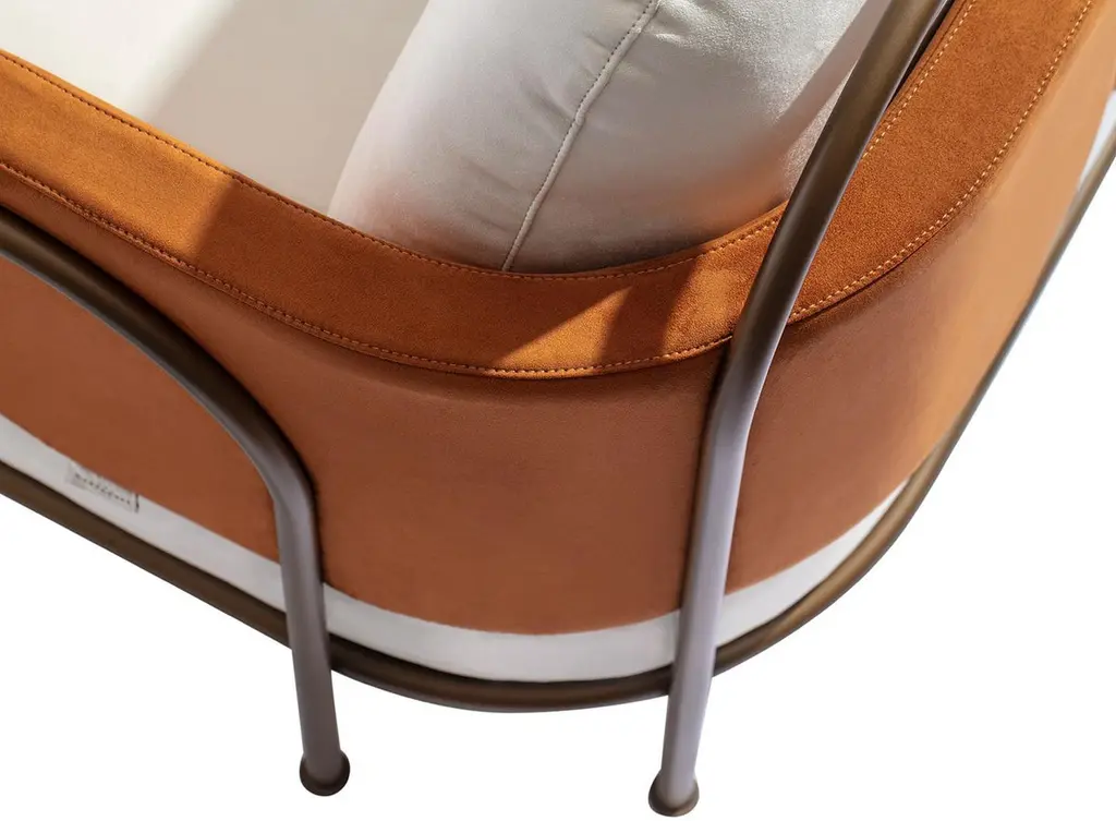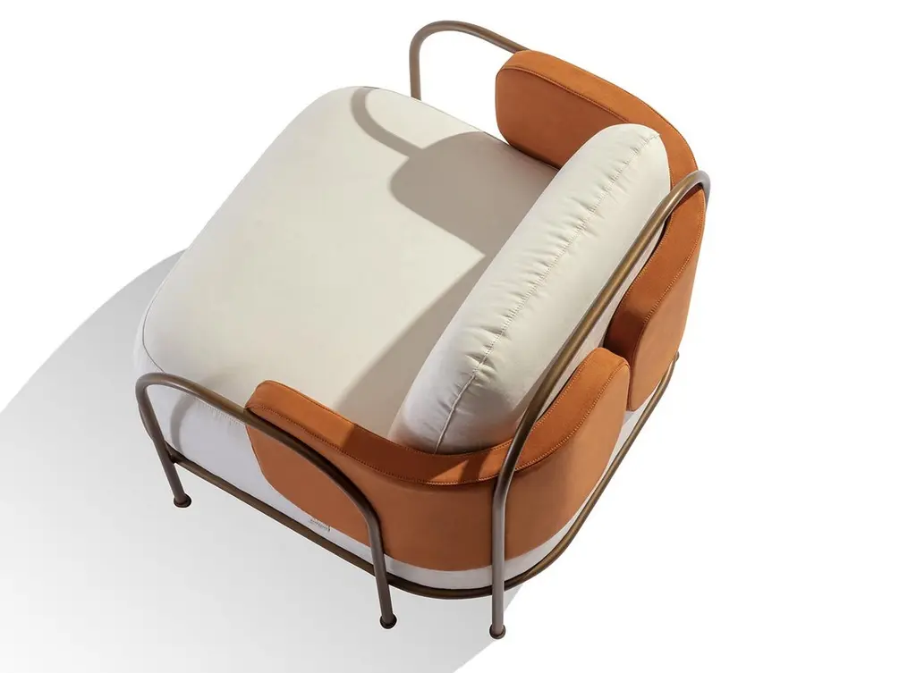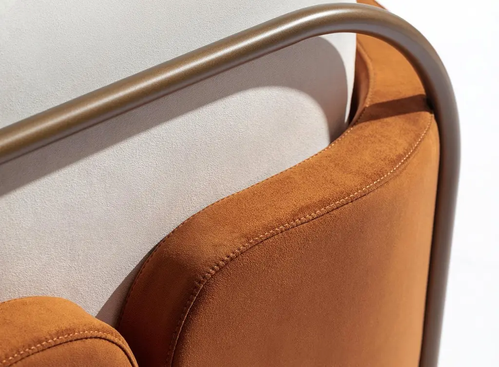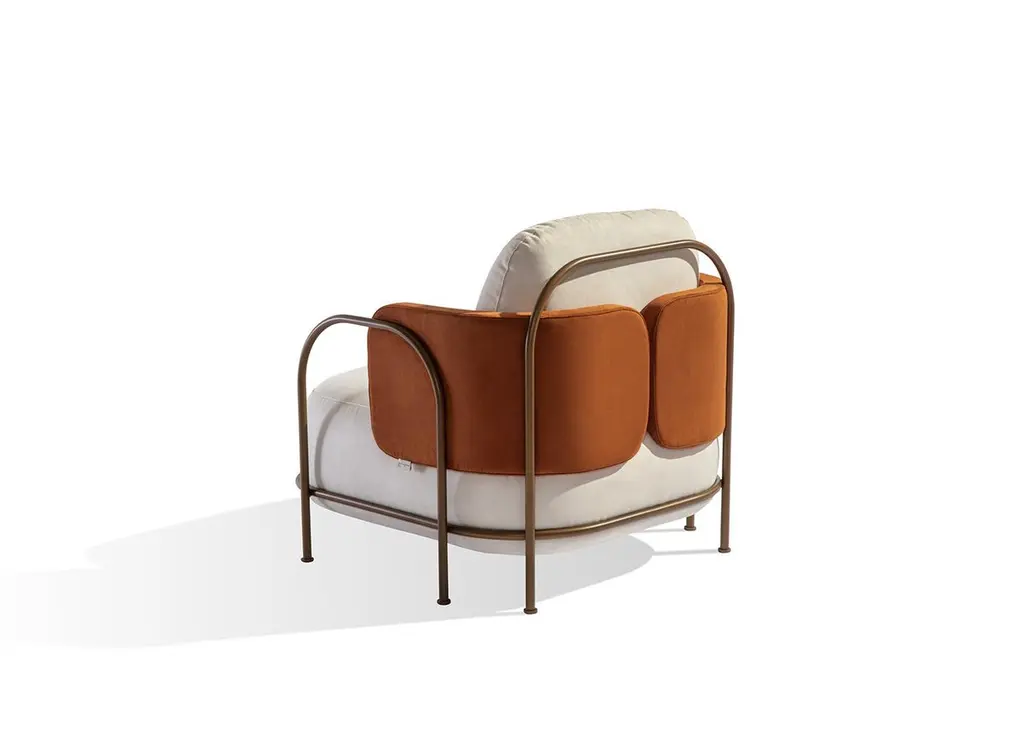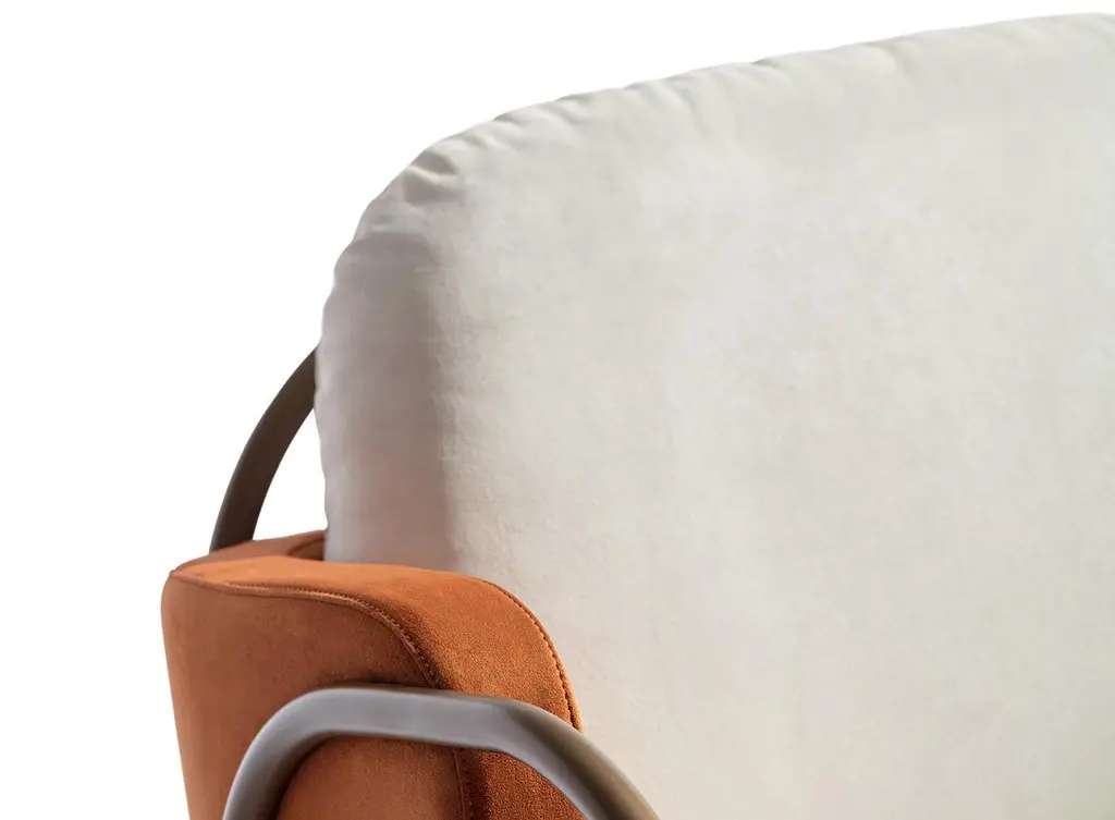 Armchair characterized by a bronzed metal frame as structure that gives a Modern and Contemporary feeling to the armchair.A soft backrest perfectly shaped enhances the comfort to create an unique piece, making it more stylish and perfect for every occasion.On the back there are two curved support backrest in different color that hugs you.The upholstery is in Econabuk cod. 9135 cat. D Creme color combined with Econabuk cod. 9133 cat. D Pumpkin color.Other fabrics and leathers available.The item can be customized.