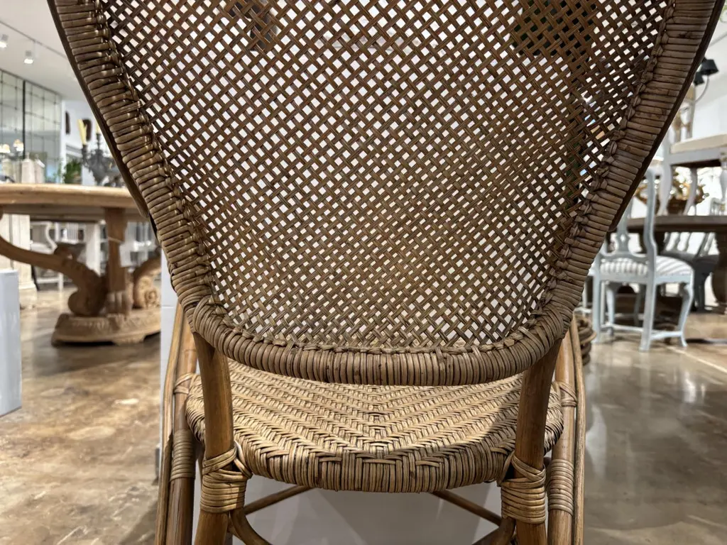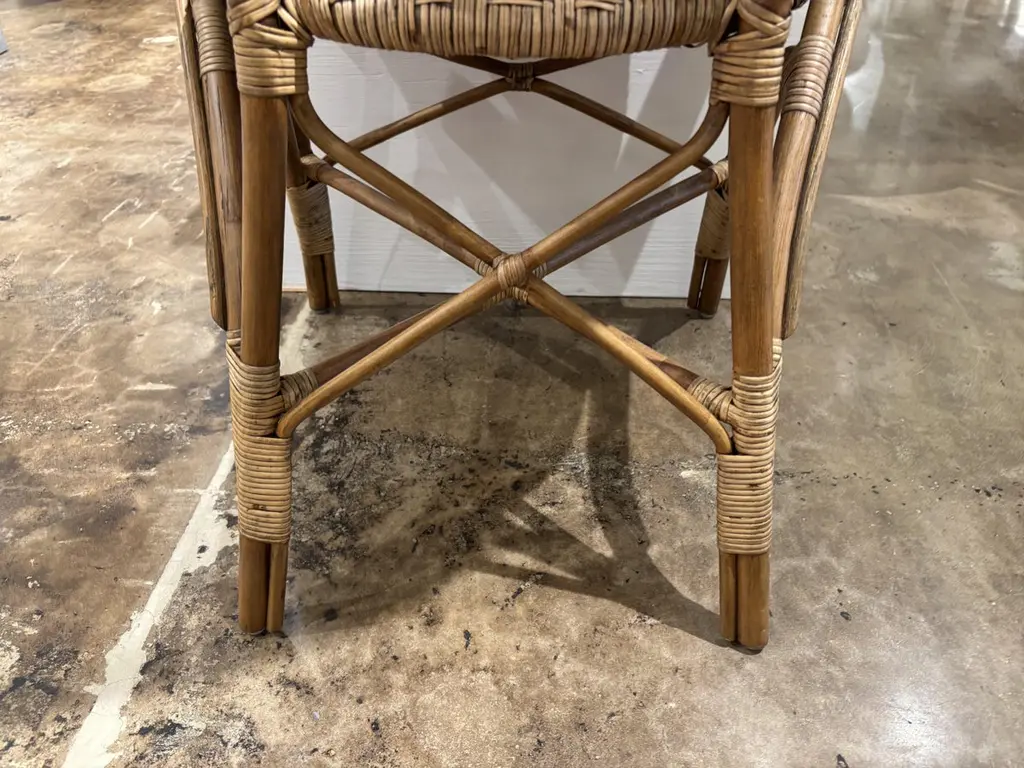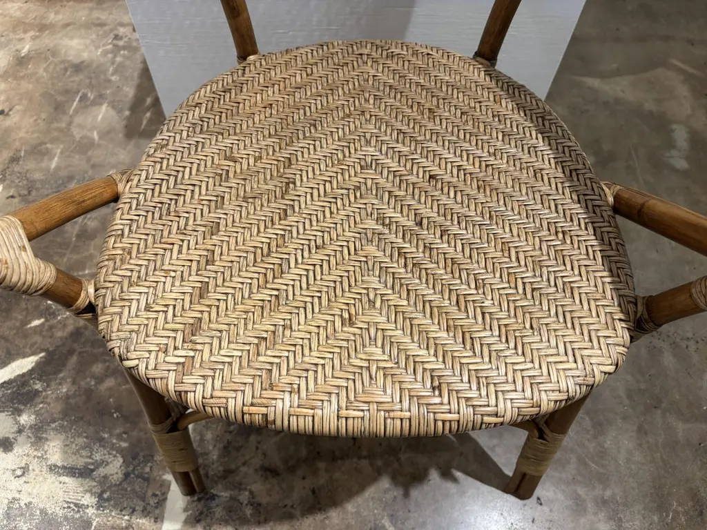 A classic 1930s European bistro armchair reedition, crafted of lightweight natural rattan in an antiqued finish. Following a time-honored technique perfected by the French this armchair lends itself to the interior use only. Wash with water mixed with mild soap and remove with a sponge or brush.Seat Height: 17.5"