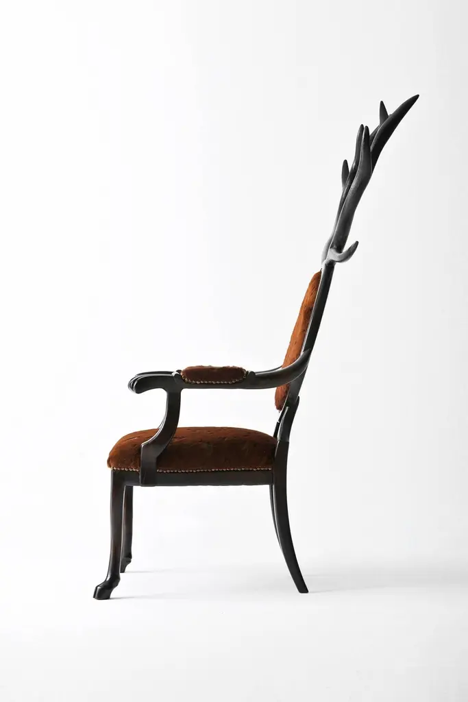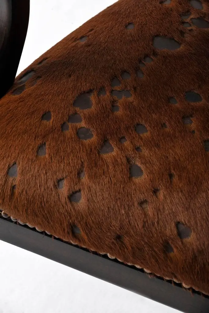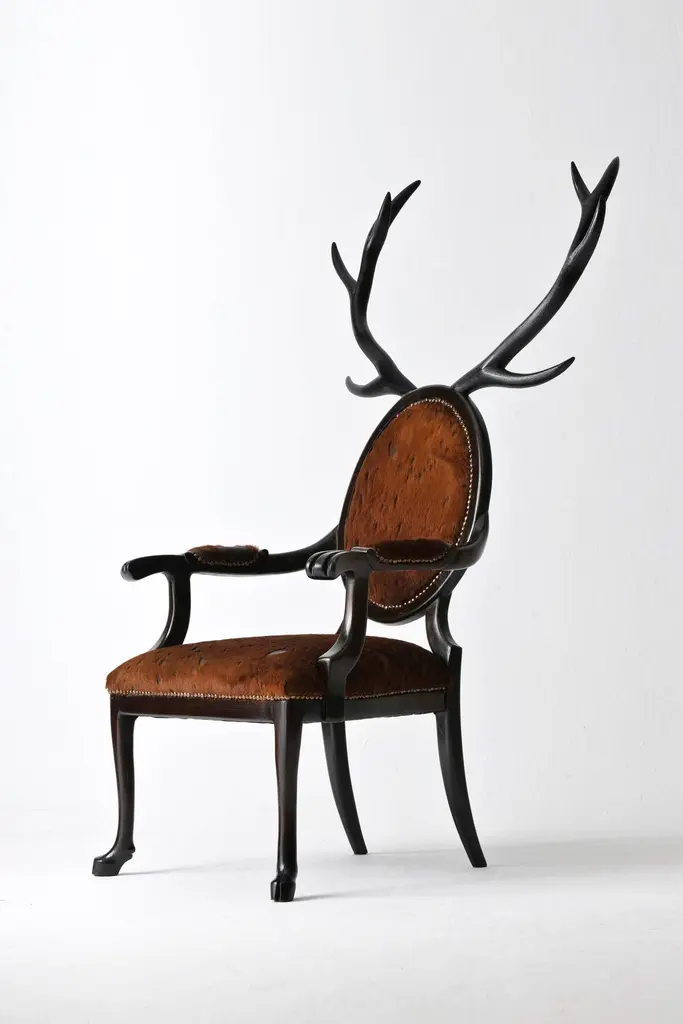 Hybrid collection was inspired by the mythologies of parahumans. This anthro chair unions with its owner, merging into one. It is entirely handmade, a special leather with rare patterns has been selected and a textured paint finish has been applied on wood to mimic the appearance of a deer and create an animalistic feeling on the user.