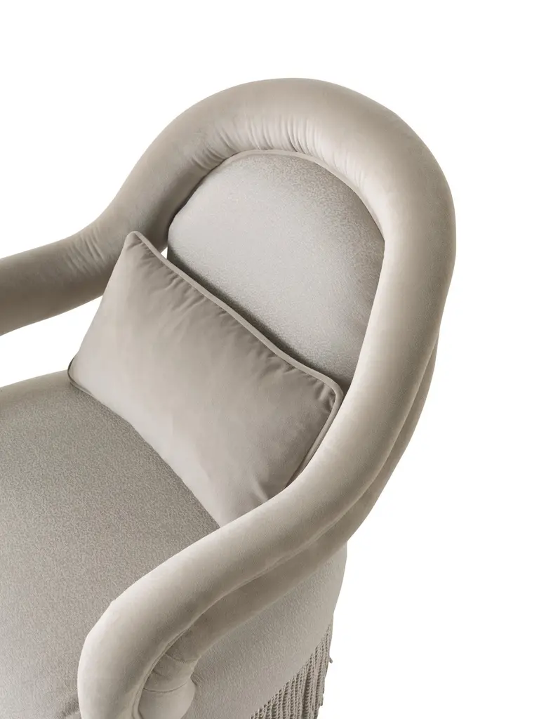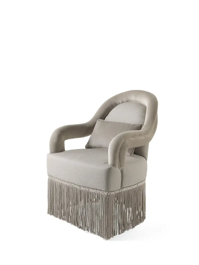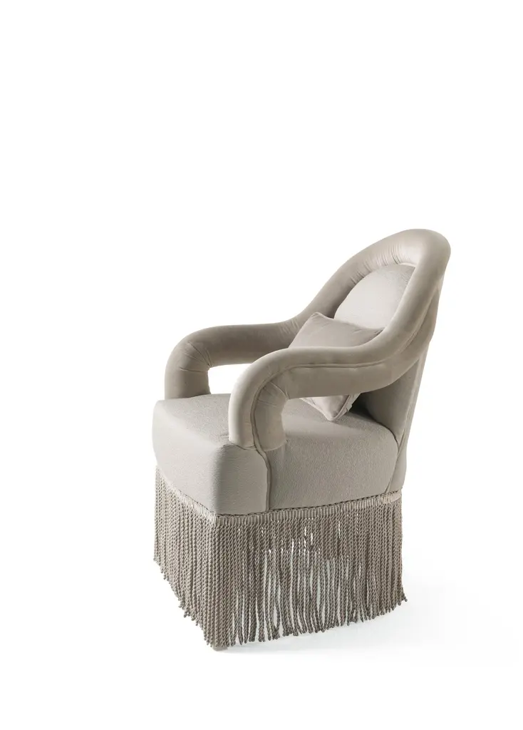 Soft lines and timeless design for the Pegaso line. The seats are characterized by a lateral opening which gives the furniture a special lightness. The fringes add a decorative note that enhances the sophisticated atmosphere that is typical of Jumbo Collection environments.Pegaso armchair with structure in beechwood. Padding in foam. Upholstery in fabric MIL.21.06, MIL.21.23 with decorative fringe.N° 1 pillow 25 x 45 cm included.