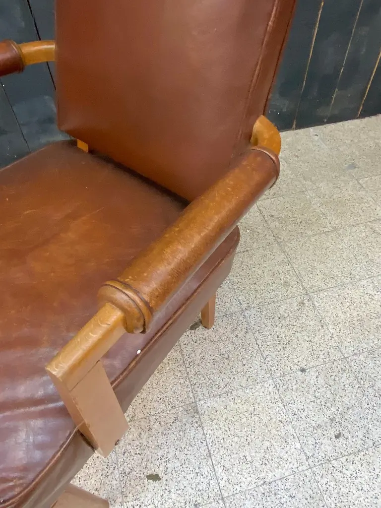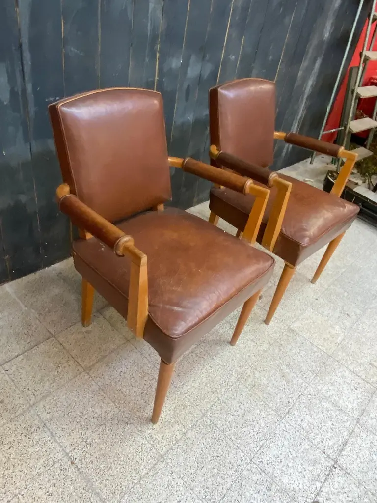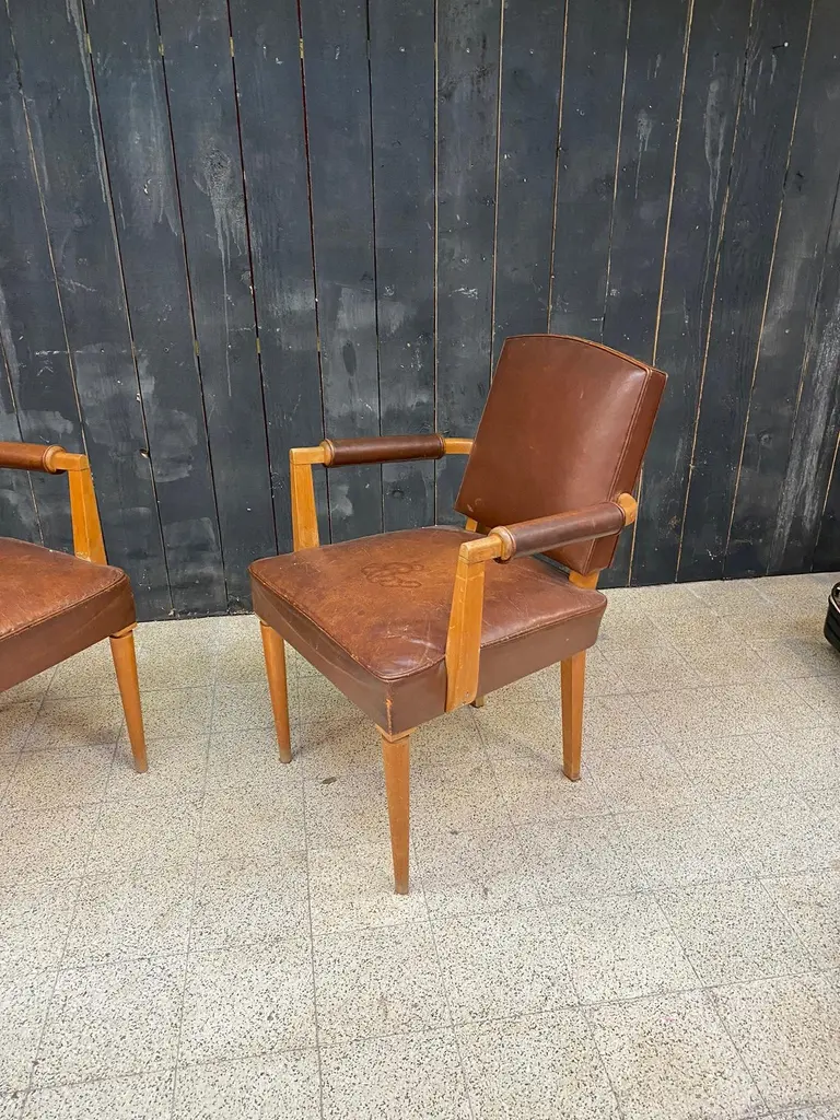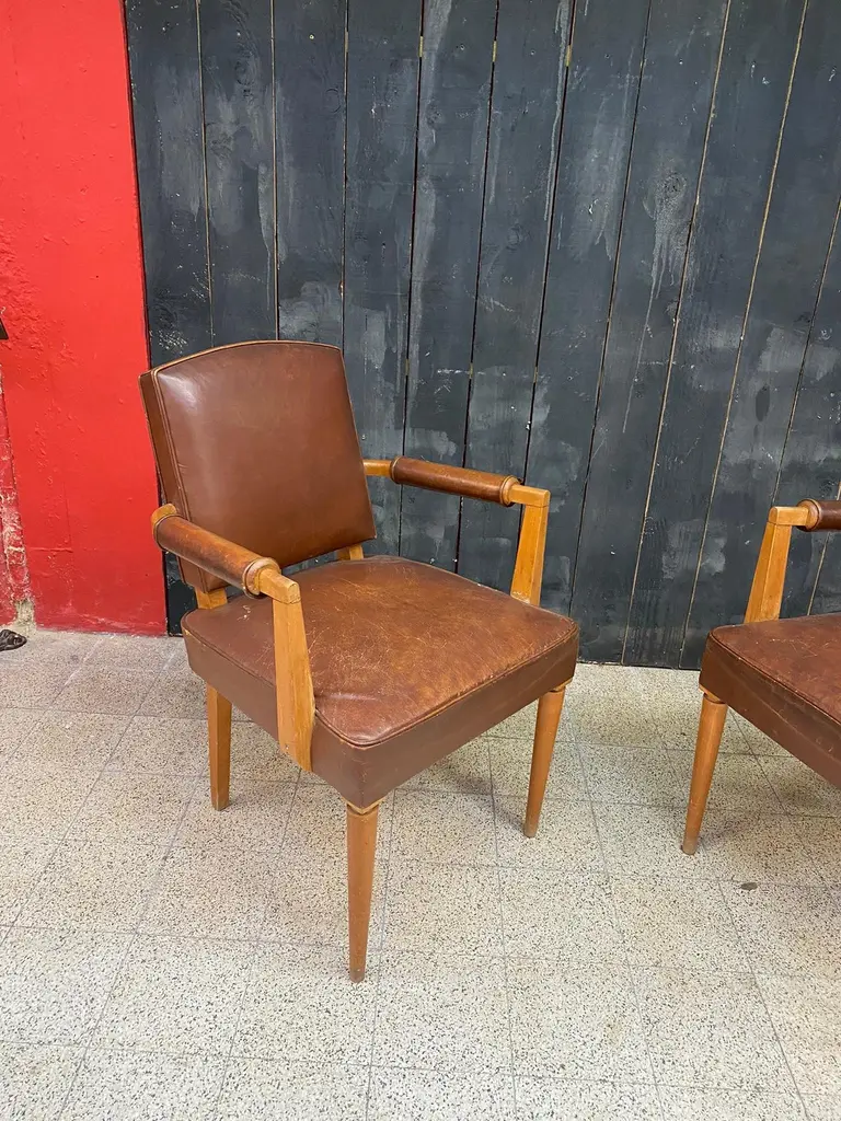 3 art deco armchairs covered in leather, circa 1930the leather is stained but not torn, very correct general condition, beautiful patina;the price is for 1 , the buyer can buy 1 , 2 or 3 armchairs