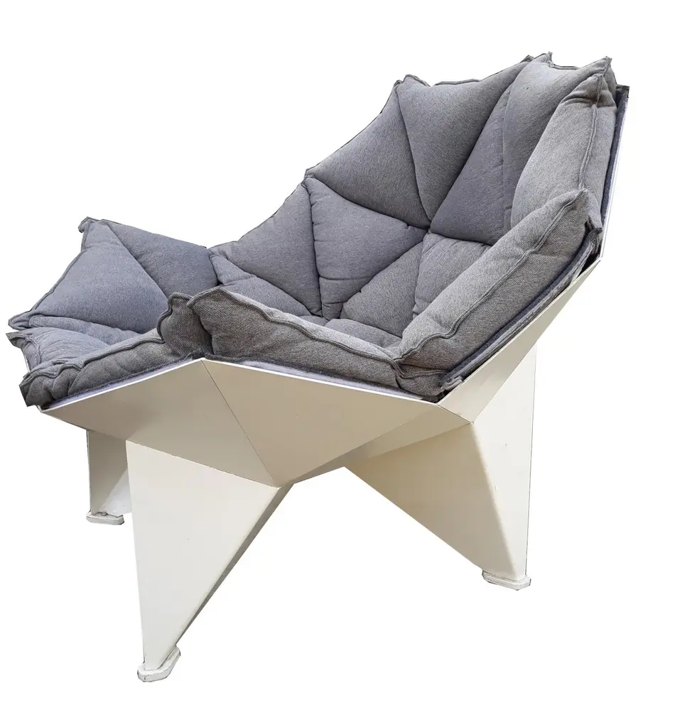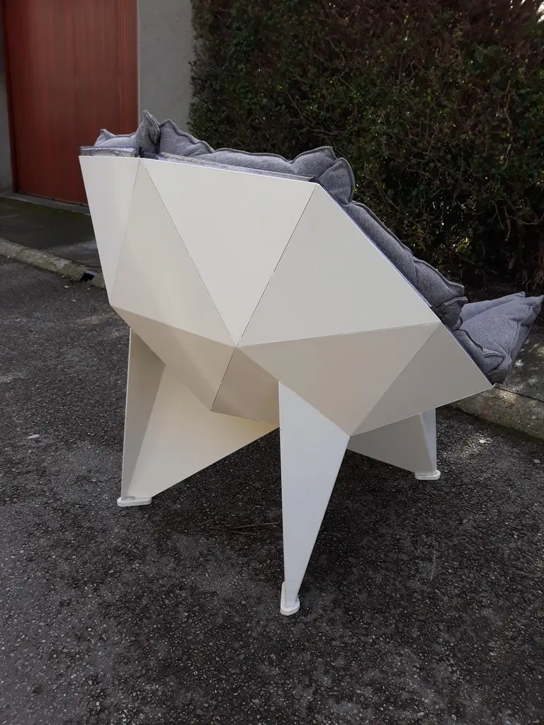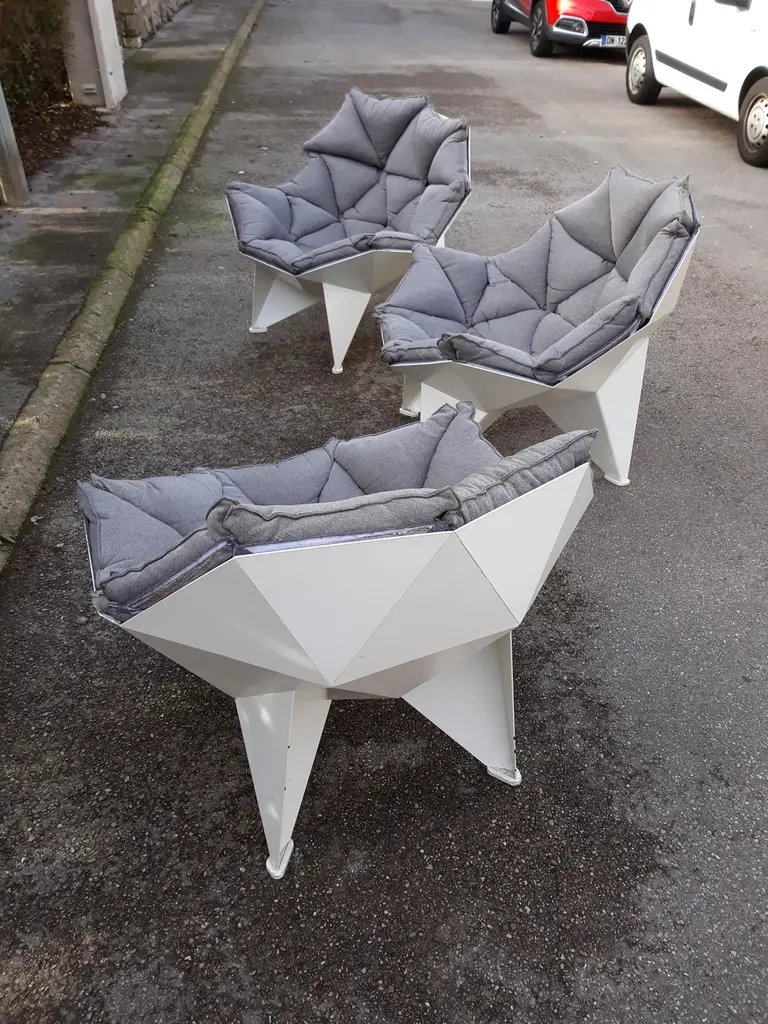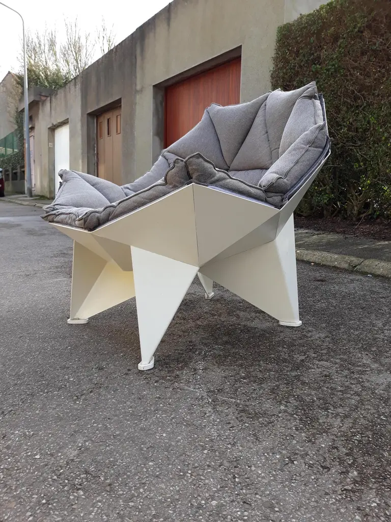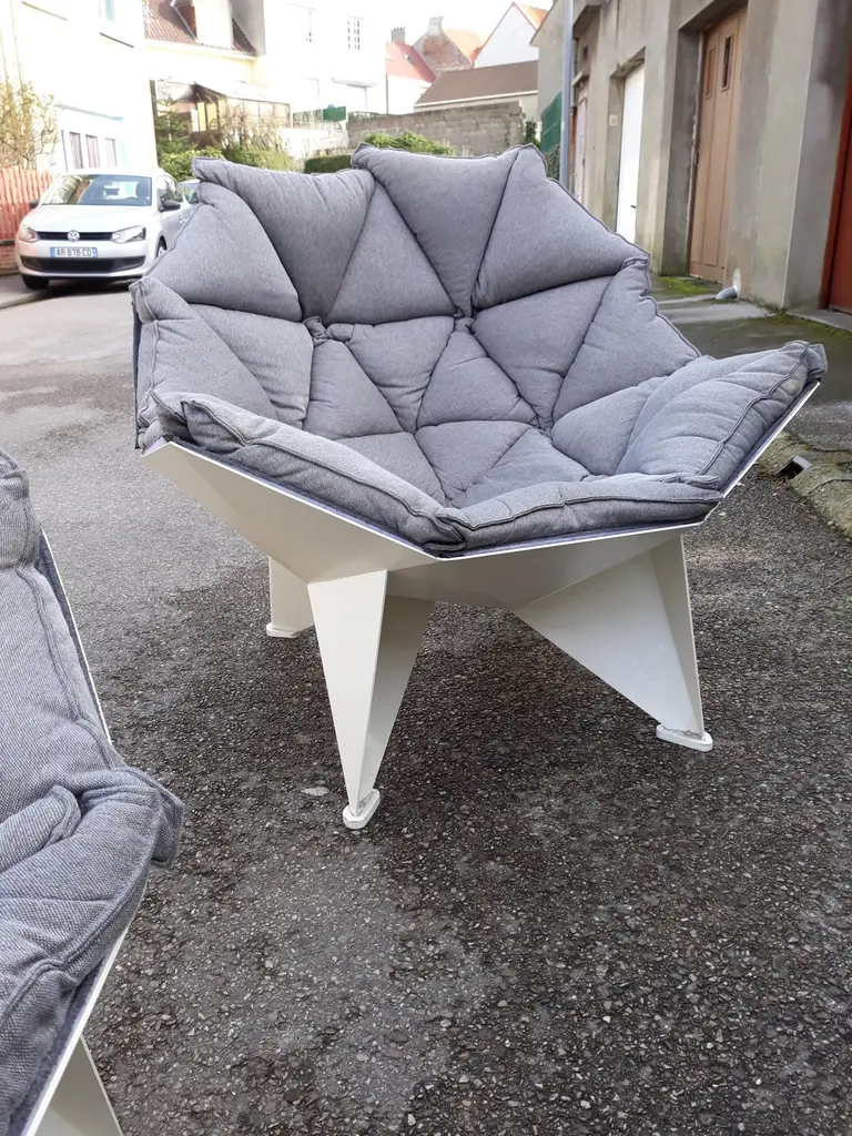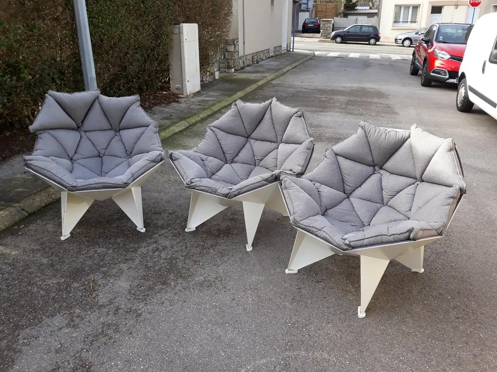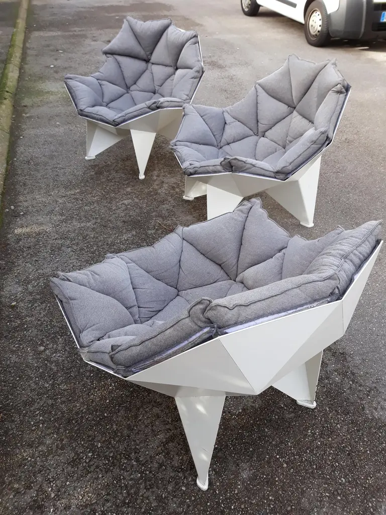 3 large Original armchairs in lacquered metal structure honeycomb, with 27 small removable cushions,circa 1970-1980Quite heavy, 30 kg per chairTraces of wear on the paint and cushions.
