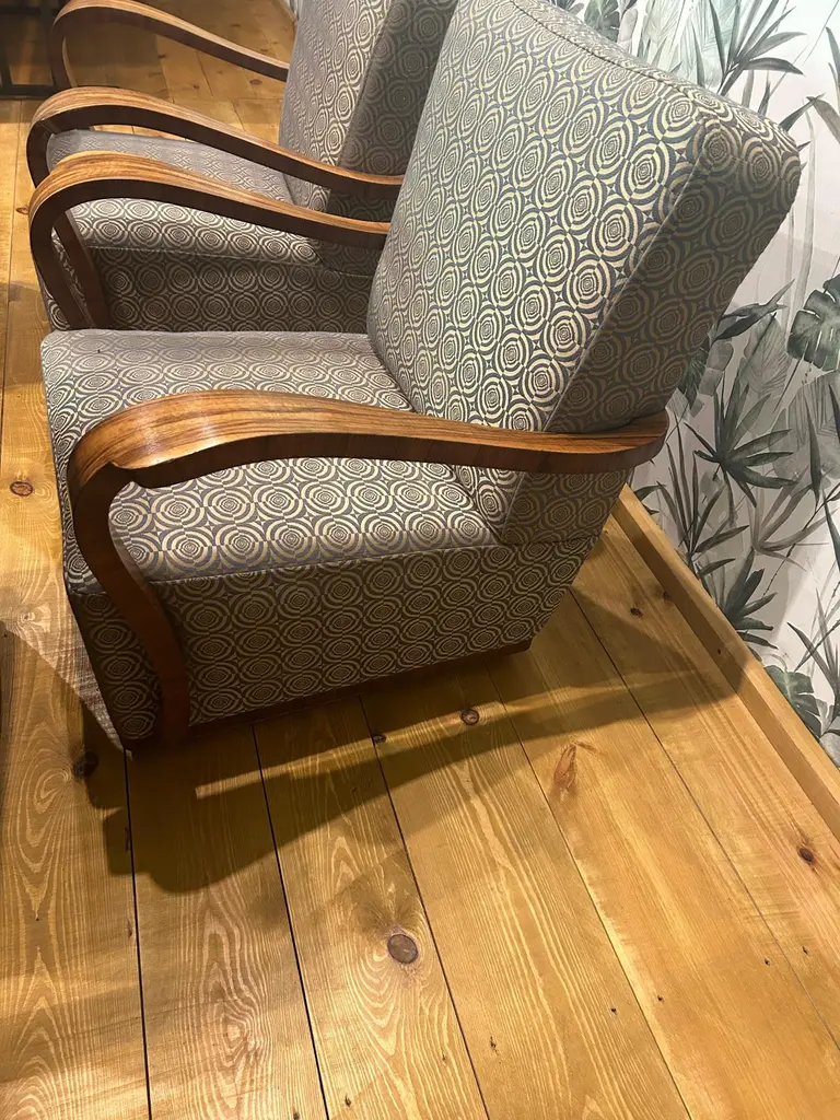 4 Art Deco armchair from 1940Every piece of furniture that leaves our workshop from the beginning to the end is subjected to manual renovation, so as to restore its original condition from many years ago (It has been cleaned to bare veneer, disinfected and finished by hand with high gloss polish).Highly recommended item will be perfect complementation of the rooms in not only Classic style, but also Art Deco and modern.The twin armchair is at the next auction.