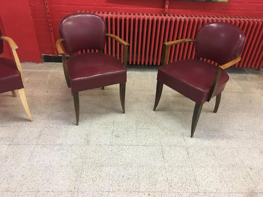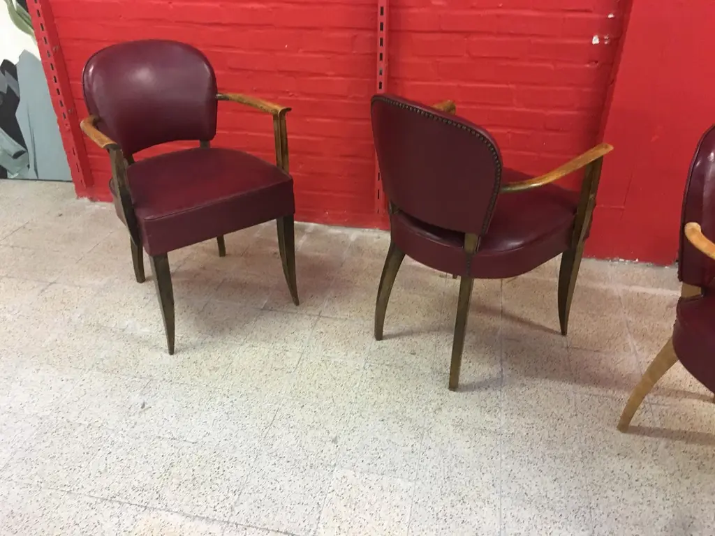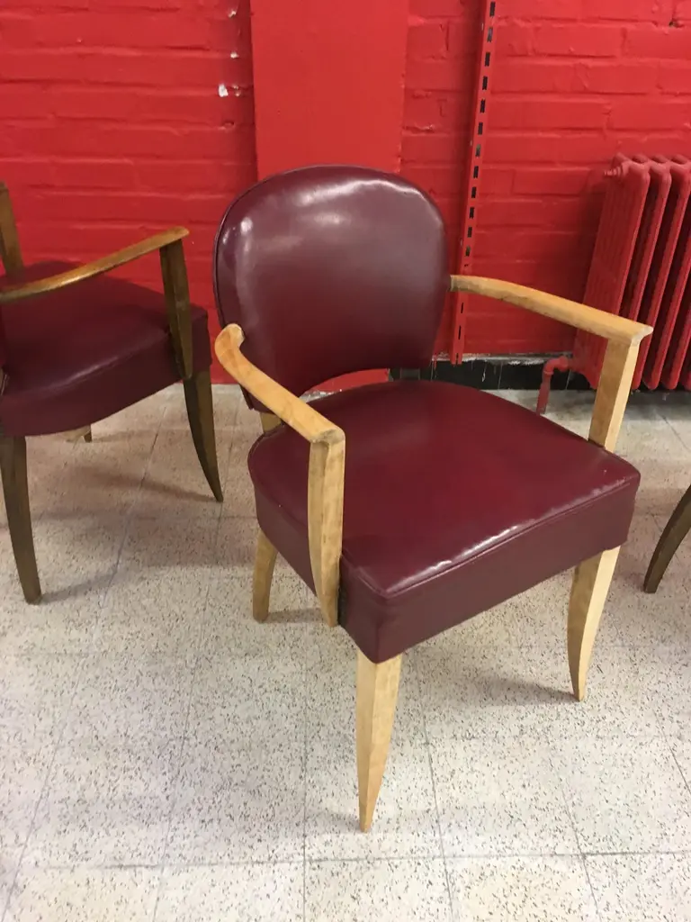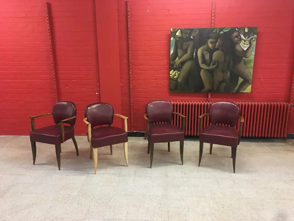 4 Art Deco armchairs in the style of Jules Leleu, circa 1930-1940beech armchair of which 1 was partially stripped.Backrest and seat covered with faux leather, in good condition, but with some small flaws.