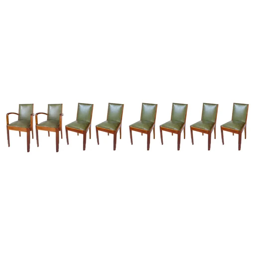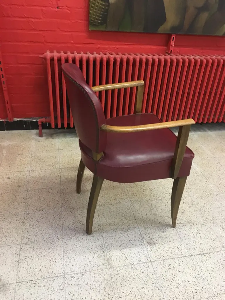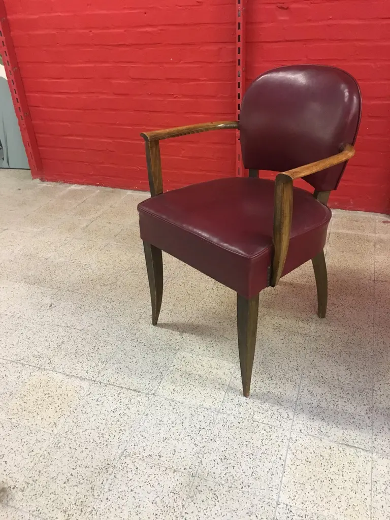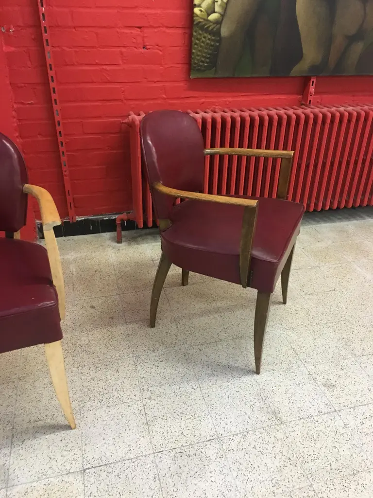 4 Art Deco armchairs in the style of Jules Leleu, circa 1930-1940beech armchair of which 1 was partially stripped.Backrest and seat covered with faux leather, in good condition, but with some small flaws.