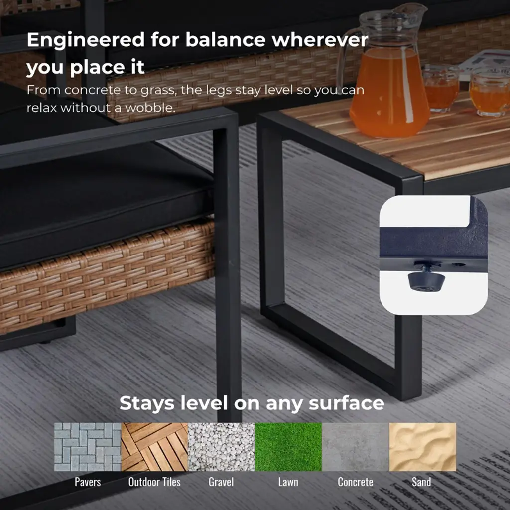Transform your outdoor space into a cozy retreat with this versatile and stylish patio furniture set. Designed to bring comfort, durability, and elegance to your garden, balcony, or backyard, this set blends the charm of natural wood with the modern appeal of woven rattan. Product Features Modern Set in Cozy Home: Crafted from high-quality PE rattan, powder-coated steel, and sustainable acacia wood, this set provides a modern yet natural look that fits beautifully in any outdoor setting—perfect for patios, porches, balconies, and lawns. Natural Look Table: The coffee table combines acacia wood and brown rattan for a contemporary-meets-rustic style. Ideal for holding drinks, snacks, or decor while relaxing outside. Sturdy Chairs: Ergonomically designed for comfort, the double chair supports up to 705 lbs, and each single chair supports up to 352 lbs. Adjustable chair leg nuts ensure stability on uneven ground. Durable Materials: Built to withstand the elements with UV-tested polyester rattan, water-based oil-protected acacia wood, and powder-coated steel. The cushion covers are waterproof and removable for easy maintenance. Complete Set Includes: One double chair: 44” L x 23.82” W x 29.92” HTwo single chairs: 23.82” L x 23.22” W x 29.92” HOne table: 33.07” L x 17.51” W x 15.16” HClear assembly instructions and extra replacement hardware included Material Specifications Rattan: Made from recyclable polyester, in a light brown mix colorFrame: Black powder-coated steelCushions: Black waterproof polyester fabric, 160gsm, with polyester wadding and non-woven batting. Zippered and removableWood: 12mm thick solid acacia wood, sustainably sourced Weight Capacity Double Chair: 705 lbsSingle Chair: 352 lbsTable: 155 lbs Certifications: ISO 9001:2015 (Factory) | ISO 105 B02:2014 (Fabric) This beautiful and durable patio set will elevate your outdoor experience, offering both comfort and a modern aesthetic for years to come.