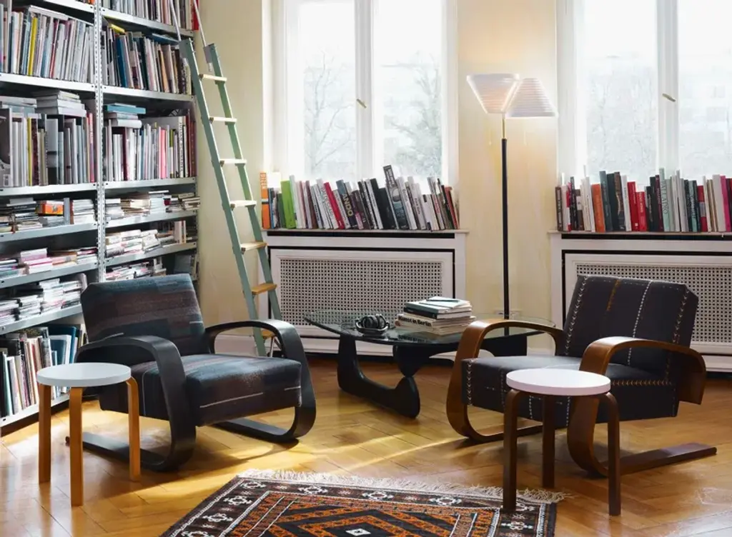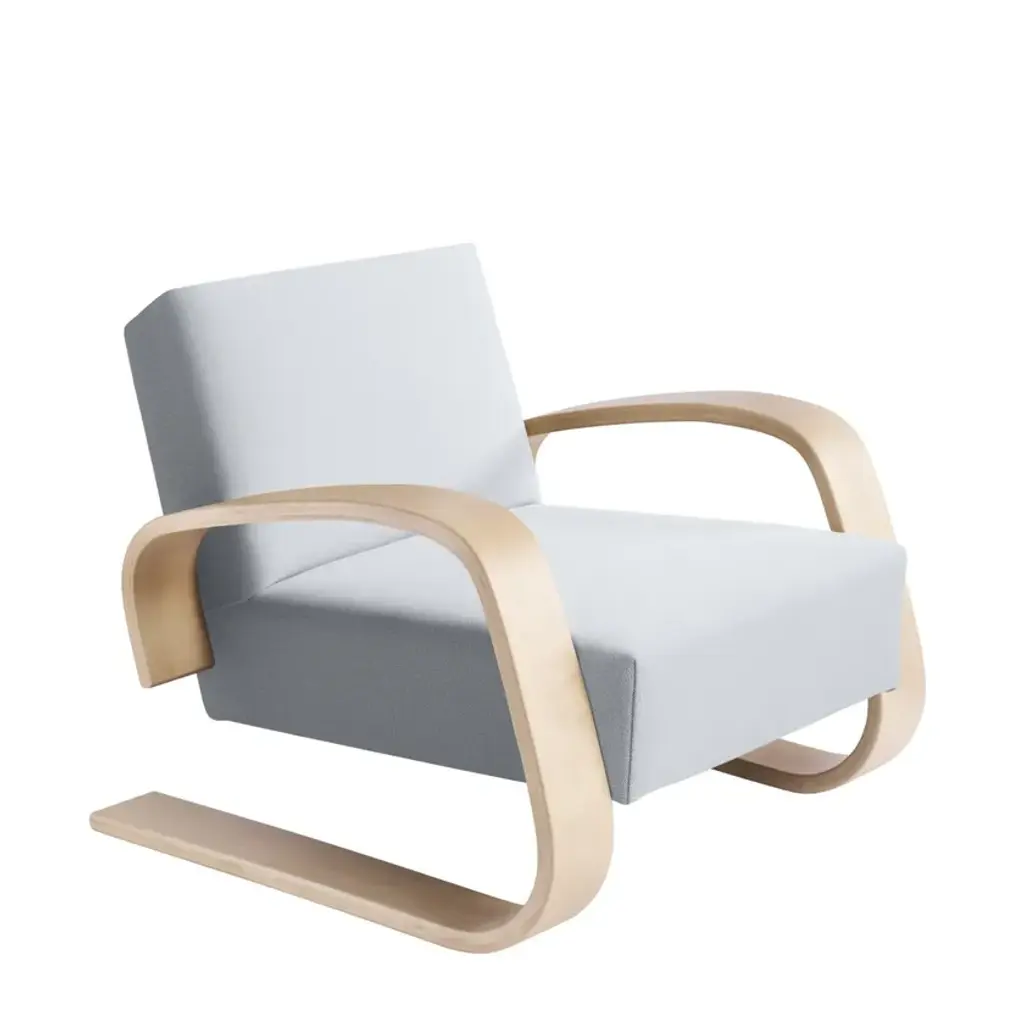 As voluminous as it is comfortable, Armchair 400 was created by Alvar Aalto in 1936 for an exhibition at the Milan Triennale, where it was promptly awarded a prize. The chair owes its nickname “Tank” to its distinctive wide and sturdy armrests made of form-bent birch lamella and to its robust upholstery. The springy cantilevered frame offers a flexible, comfortable seat. A favourite since the 1930s, Armchair 400 remains effortlessly modern and can be upholstered in any material.A variety of colours and upholstery can be combined.