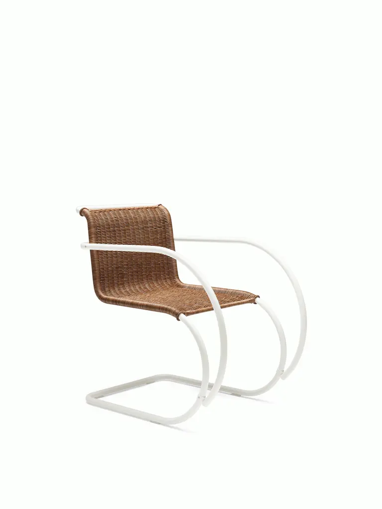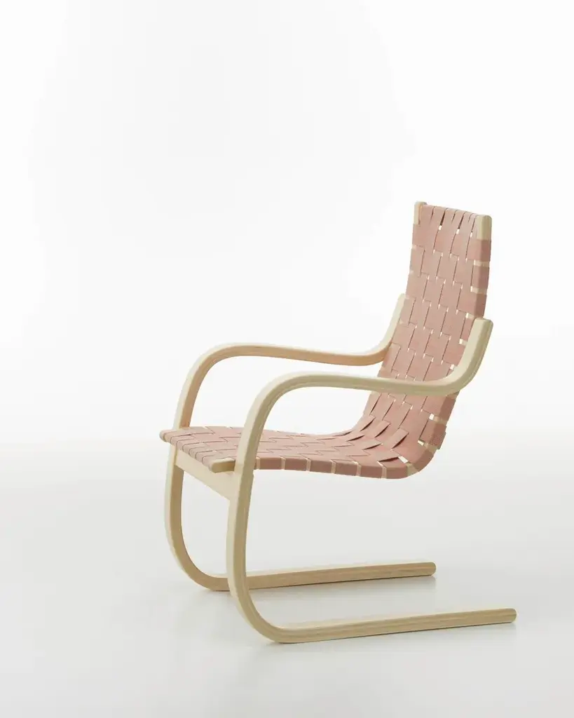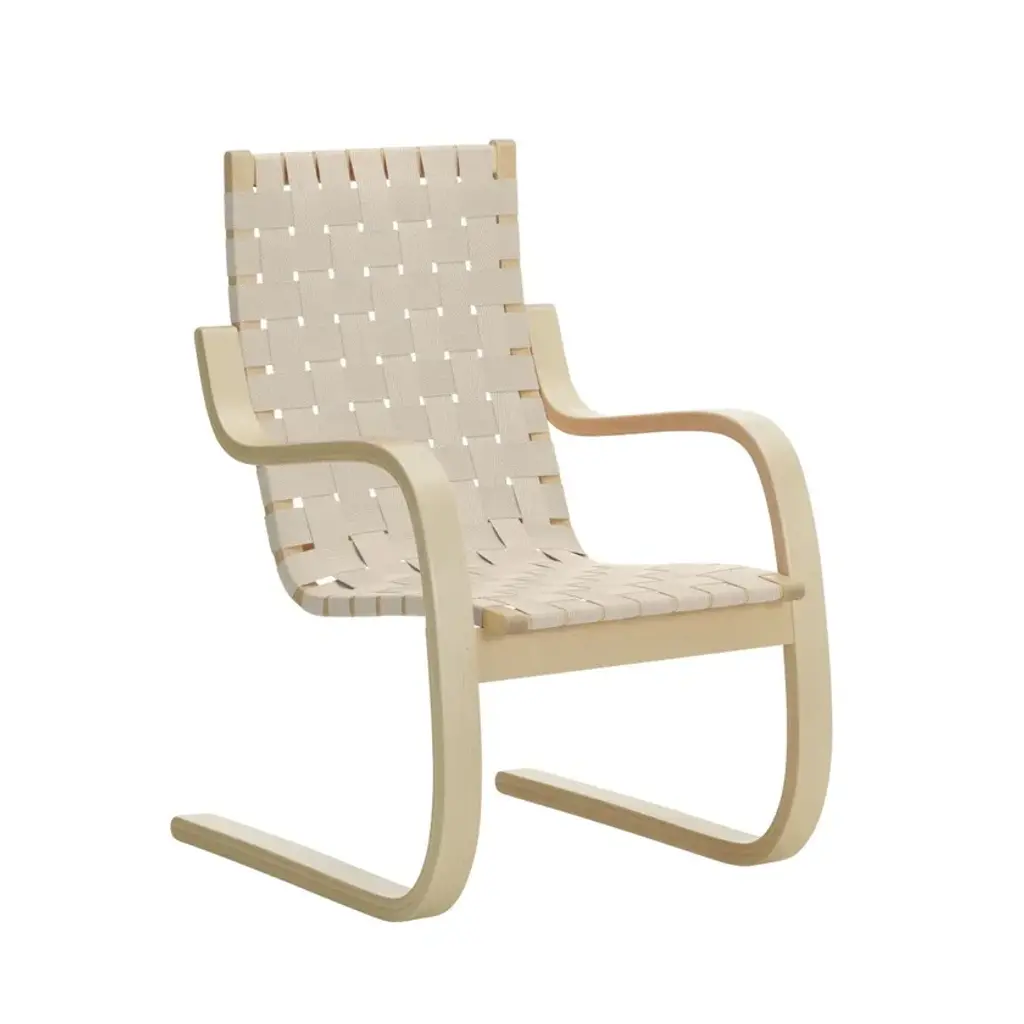 Armchair 406 combines simple elegance with comfort. Since wood changes over time, the armrests are formed from a single piece that is then split in half, ensuring that as the chair ages, it remains perfectly balanced. The cantilevered birch frame and linen webbed seat offer a high degree of comfort and relaxation; the natural materials yield in response to the body while simultaneously providing strength and stability.Frame: Form-bent solid birch lamellaSeat: Linen webbingThe linen belt-webbing is available in a selection of colours: black webbing, black/blue webbing, black/brown webbing, natural/black webbing, natural/white webbing, natural/red webbing
